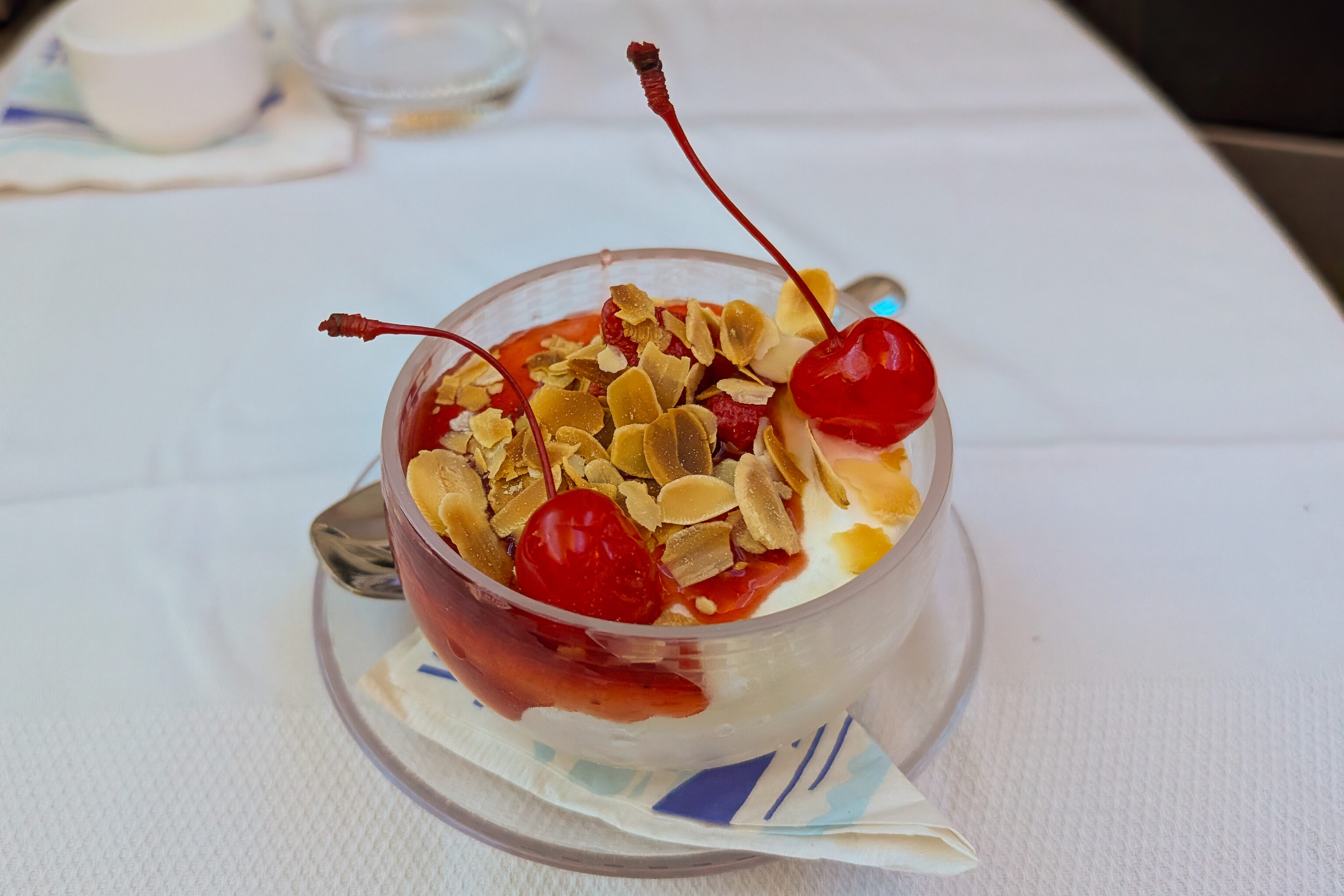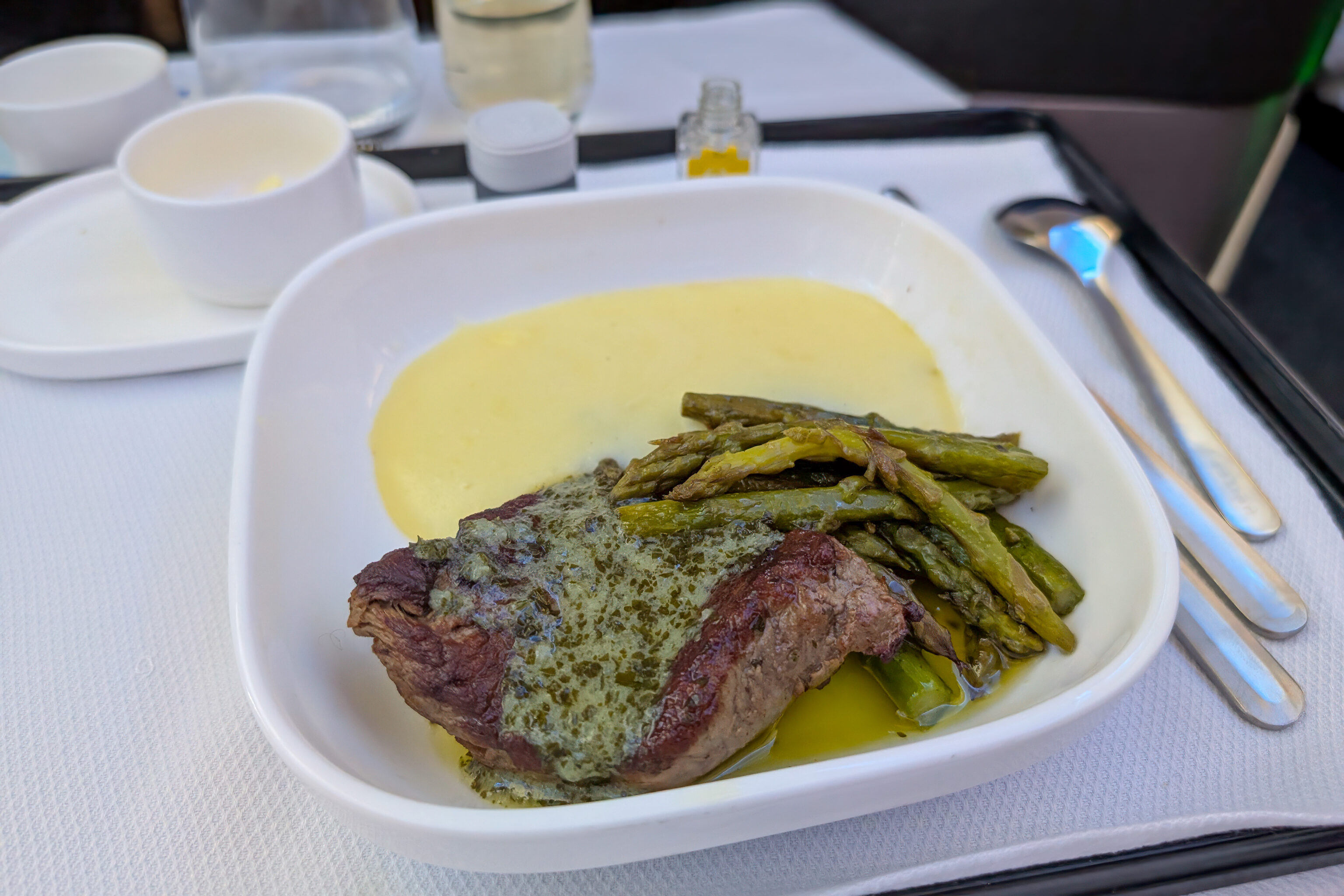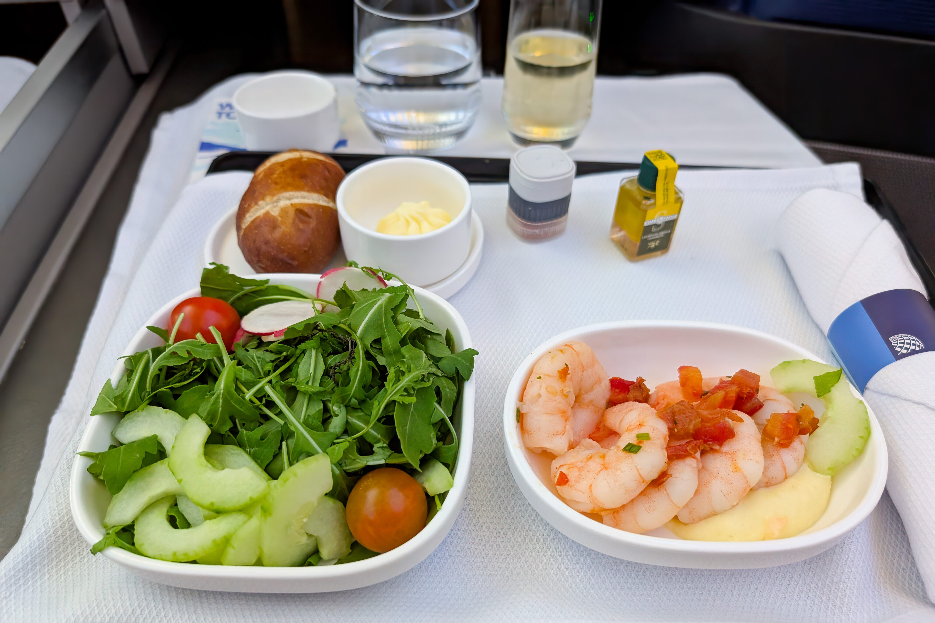 We had preordered our meals before the flight. The shrimp appetizer was pretty mediocre as it usually is and the beef wasn’t great. Perhaps a bit worse than usual.