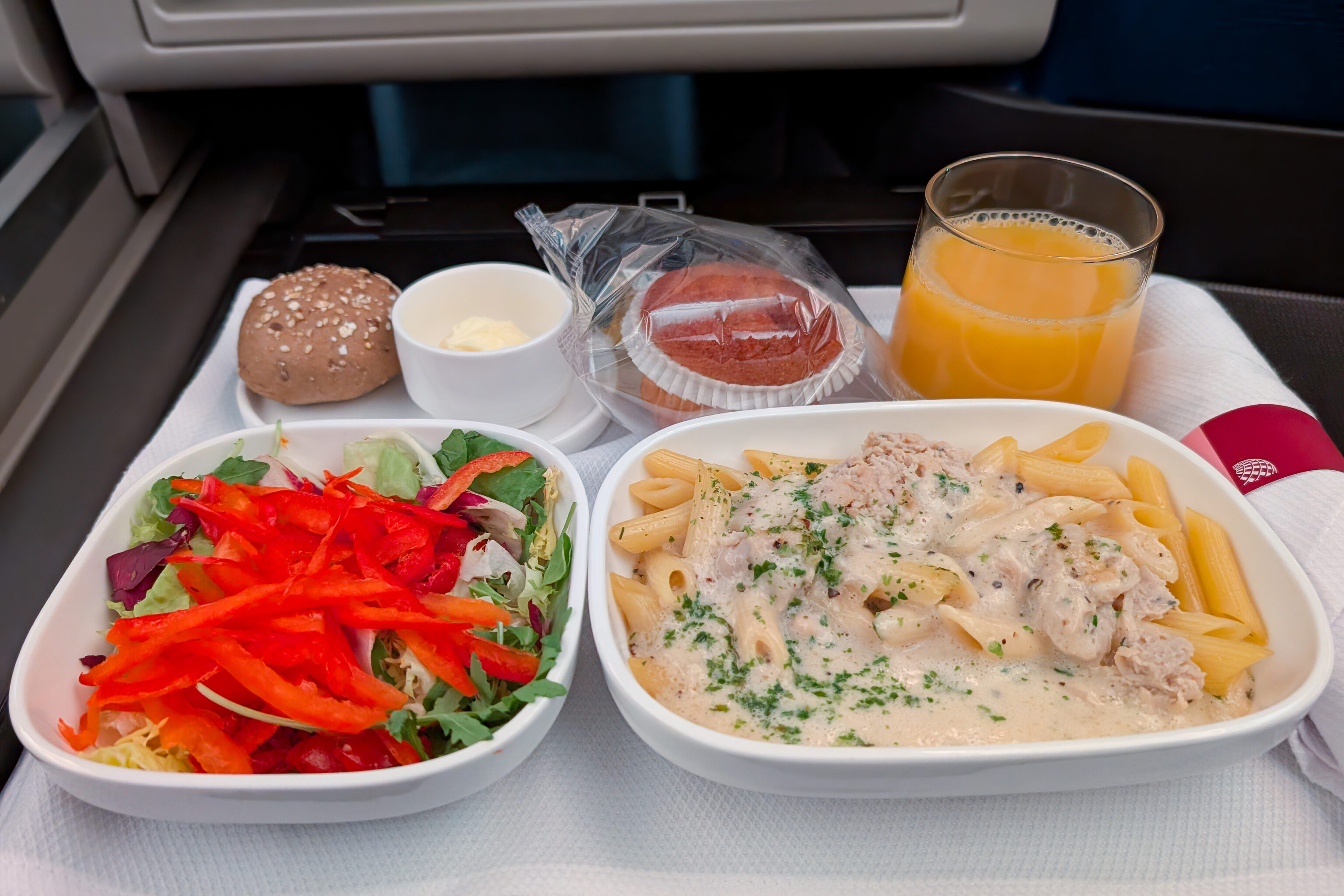 After watching a movie and sleeping, we got up before the pre-arrival meal service. The pasta meal can be best described as not the best, but not the worst either.