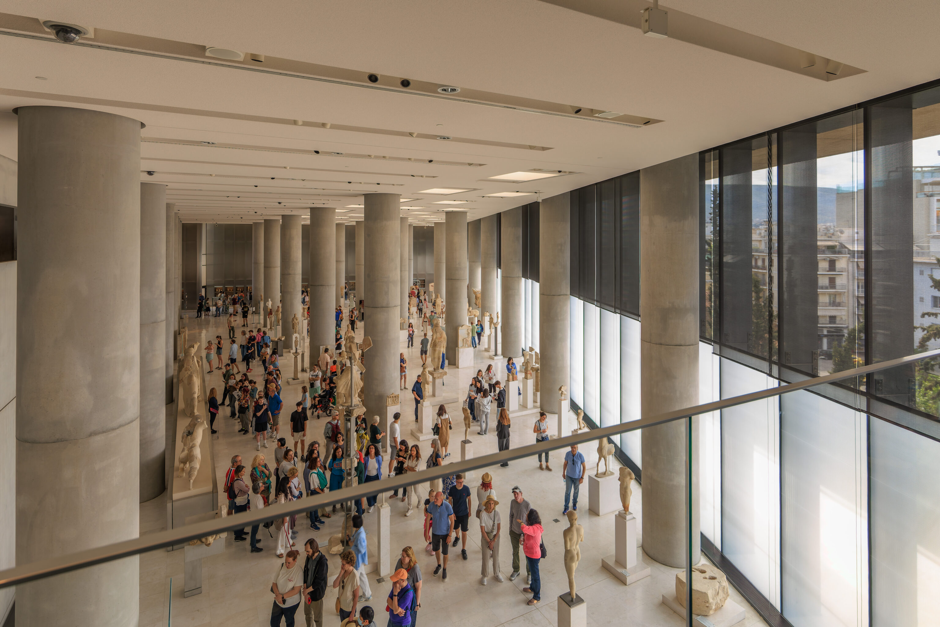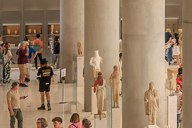 Mentioned at the beginning of the 18th century in a cabinet of curiosities in Marseille, and then acquired around 1808-1813 by the Lyon museum, the kore was successively identified as Minerva, Isis, Astarte, and Aphrodite with a dove. In 1935, the Englishman Humphry Payne reattached fragments of her legs and left shoulder, found on the Acropolis of Athens, to the bust, thus identifying the statue’s place of origin and linking it to the famous group of korai from the Acropolis. Since the 1950s, this marble sculpture had been displayed with casts of the fragments preserved at the Acropolis Museum. The very poor quality of the plaster casts and the desire to respect the original work led to the decision to present this masterpiece of Greek sculpture in a new way.