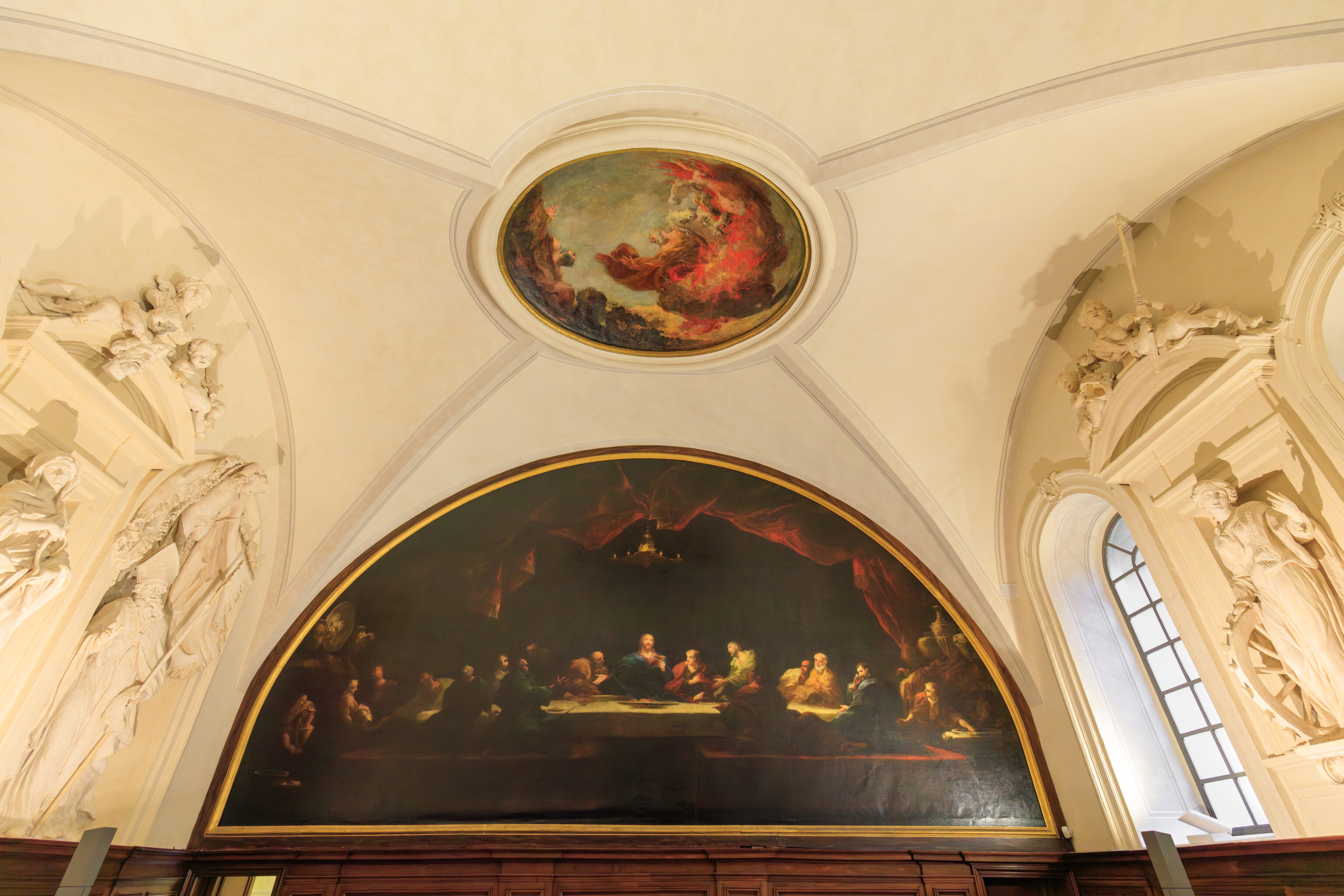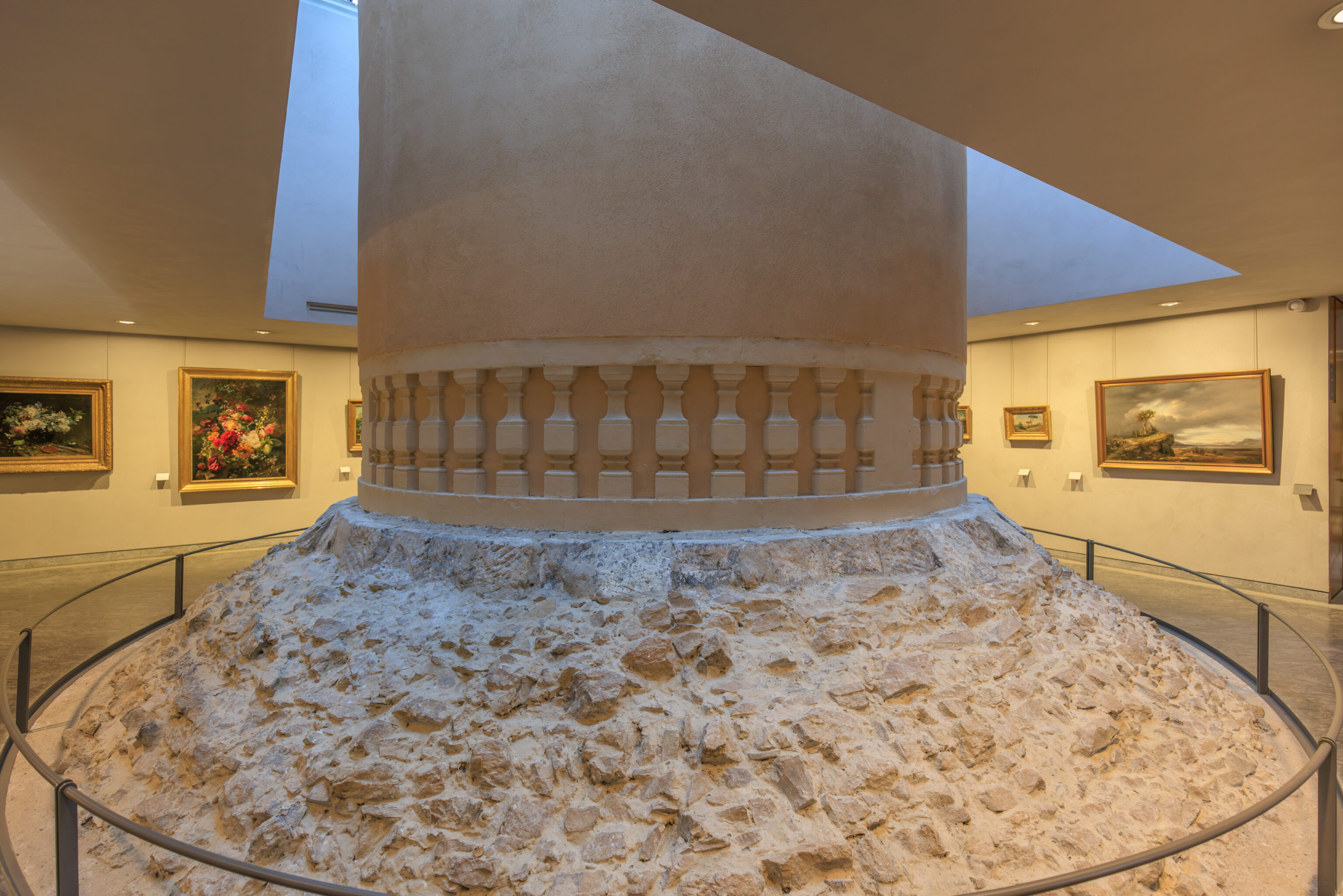 The masonry cylinder located in the center of the room corresponds to the lantern illuminating the dome of the grand staircase designed by Thomas Blanchet, located directly below. The stonework visible at the base of this cylinder is that of the dome's vault.