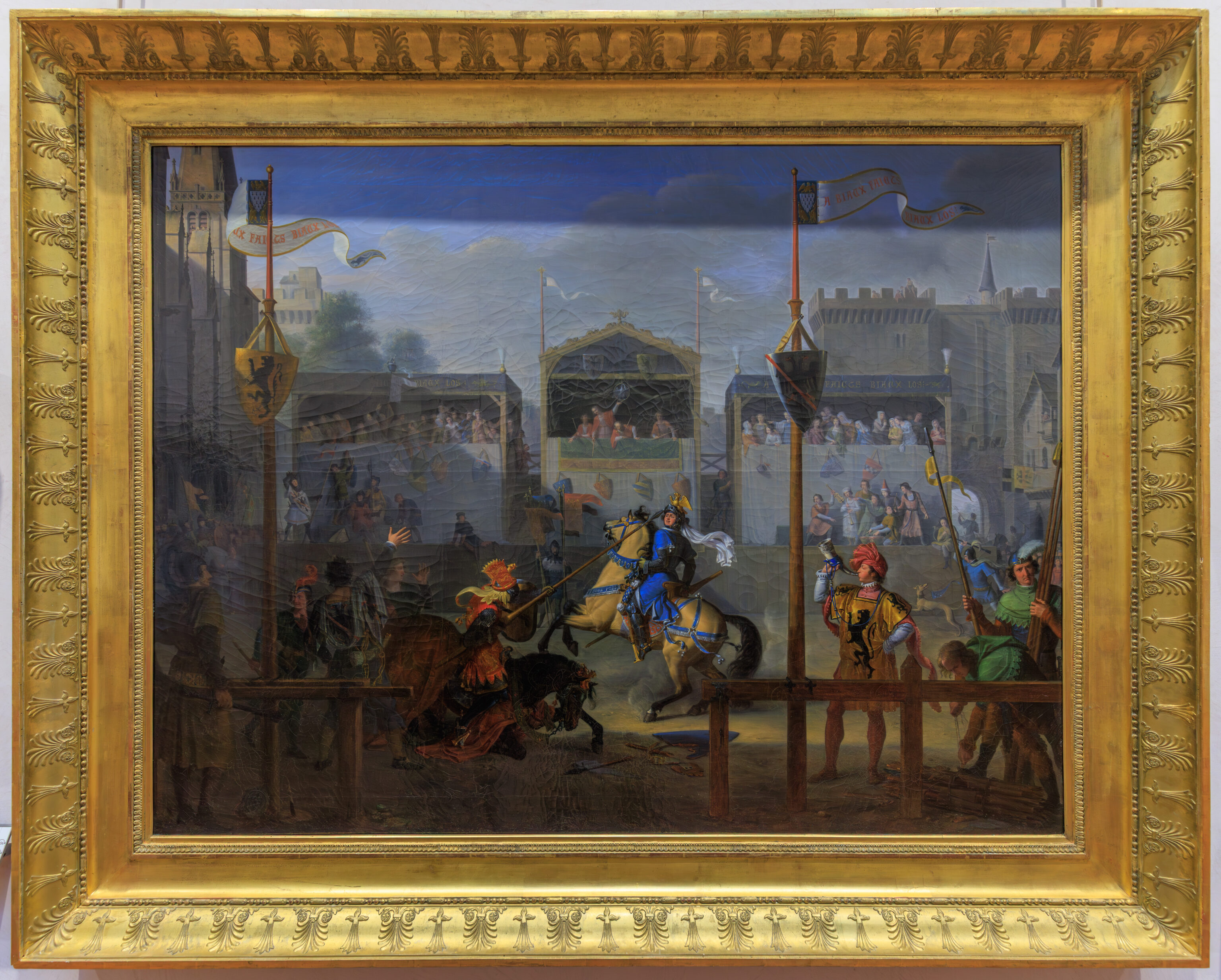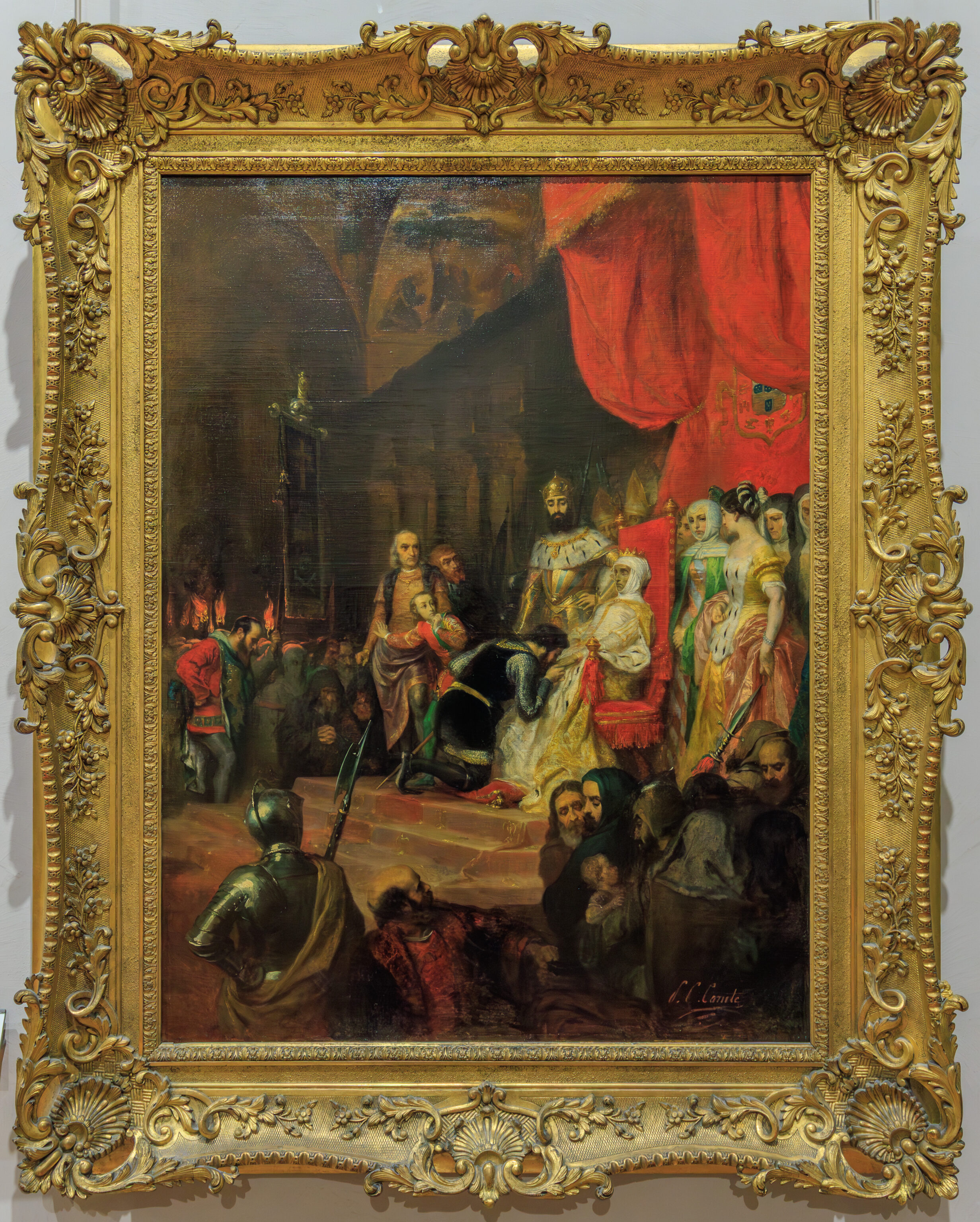 The subject of this painting is taken from the history of medieval Portugal. Prince Peter, then married to Constance of Castile, fell in love with one of her ladies-in-waiting, Ines de Castro (c. 1320-1355). He secretly married her after the death of his wife in 1354. Upon learning of this union, King Alfonso IV had the unfortunate woman assassinated. To take revenge, Peter, who had become king, had her corpse exhumed in 1366 and had her crowned queen in a macabre spectacle. The moment depicted here is when he forces the great lords to pay to his deceased wife, seated on the throne, the honors due to her and to kiss her hand.