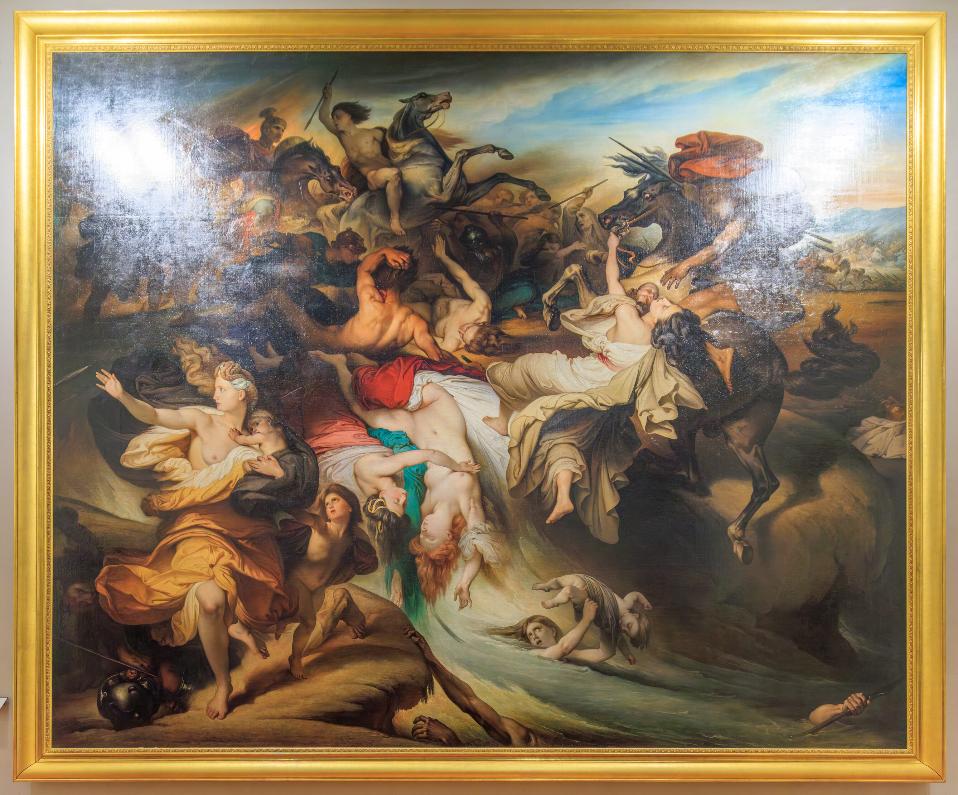 At the end of the 2nd century BC, tribes of Germanic origin, including the Cimbri and the Teutones, invaded Gaul, northern Spain, and Italy. They fought several battles against the Roman troops before being definitively defeated by the armies of Consul Marius, first at Aix-en-Provence, then at Vercelli (Italy), in 102 and 101 BC. The story goes that the wives of the defeated, rather than surrender, preferred to take their own lives with their children to escape captivity, a scene that François Joseph Heim depicts here.