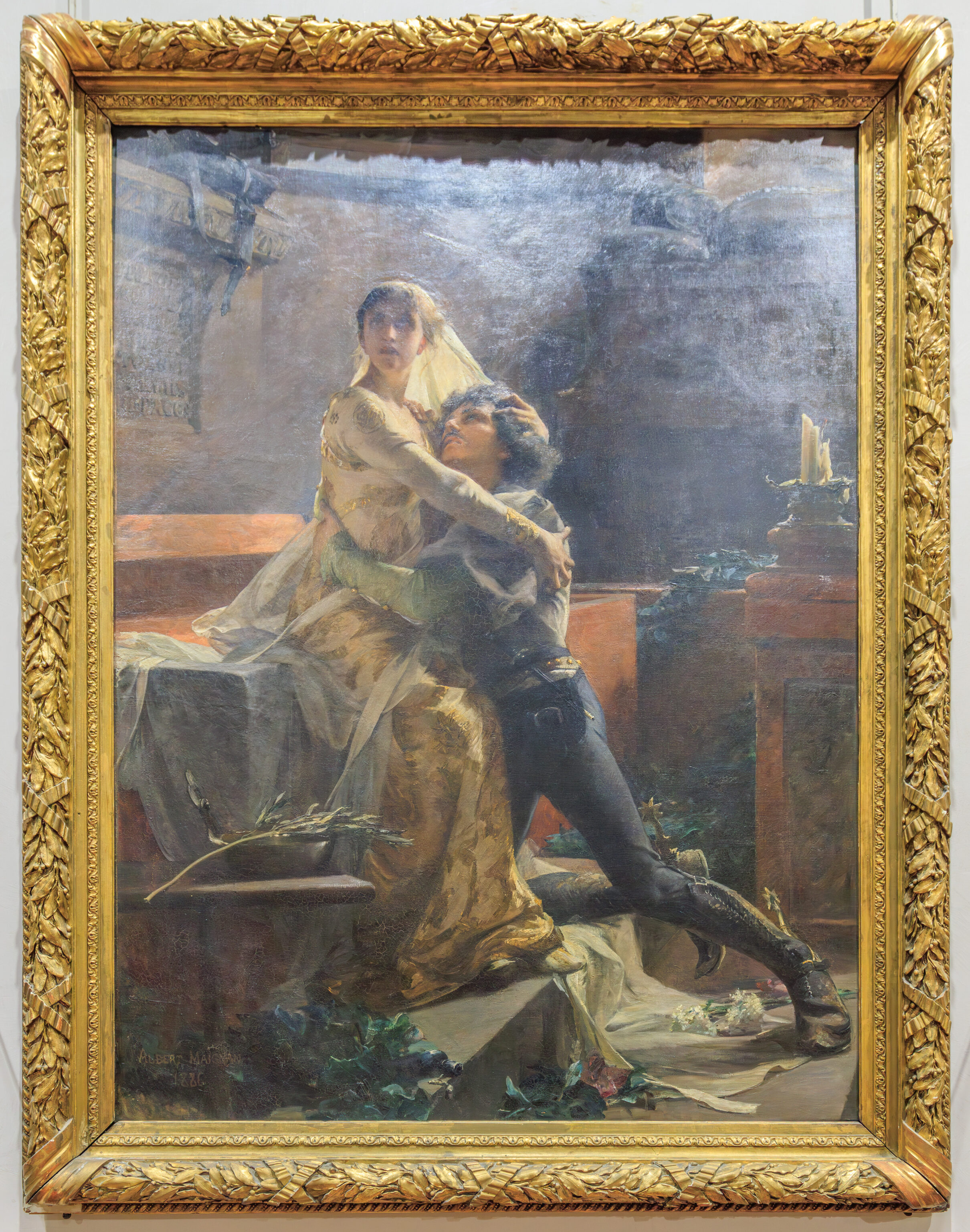 This painting by Albert Maignan takes its subject from the end of William Shakespeare‘s play, Romeo and Juliet. Unaware of the stratagem devised by his beloved Juliet to escape the marriage imposed upon her, and believing her dead, Romeo secretly returns from exile to Verona to mourn over her body. Desperate, he drinks a vial of poison. However, the young woman awakens at that very moment as the effects of the potion she had taken wear off. The work, with its highly theatrical composition, is one of the most appreciated of the artist’s career.