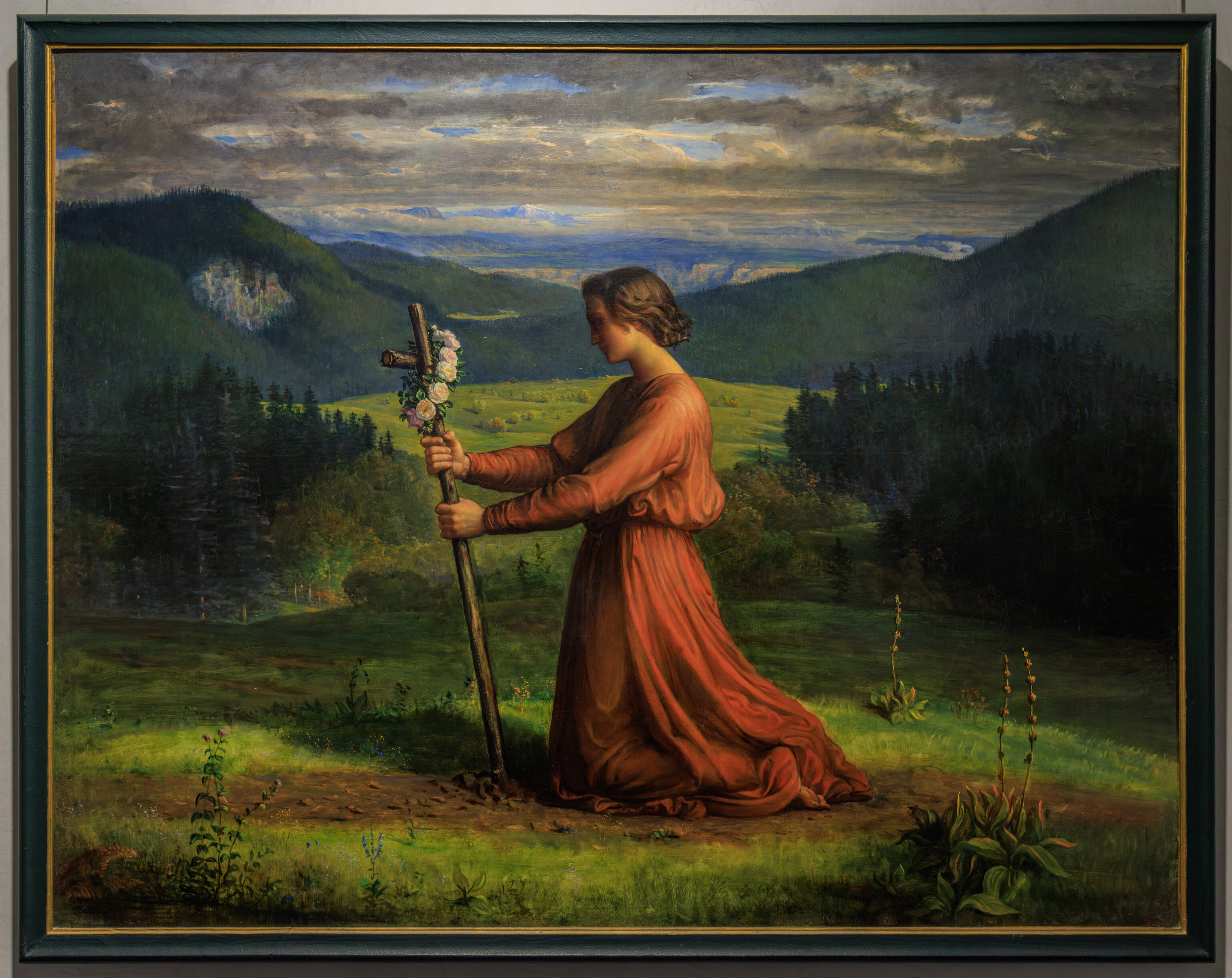 The young man, now alone on earth, places a cross on the grave of the young girl, of whom only a wreath of white roses remains. The landscape is stark and desolate, reflecting the pain he feels. However, his attitude is one of prayer, and it is through this prayer that a glimmer of hope can be perceived. This possible redemption does not, however, diminish the pessimism on which the first part of The Poem of the Soul concludes.