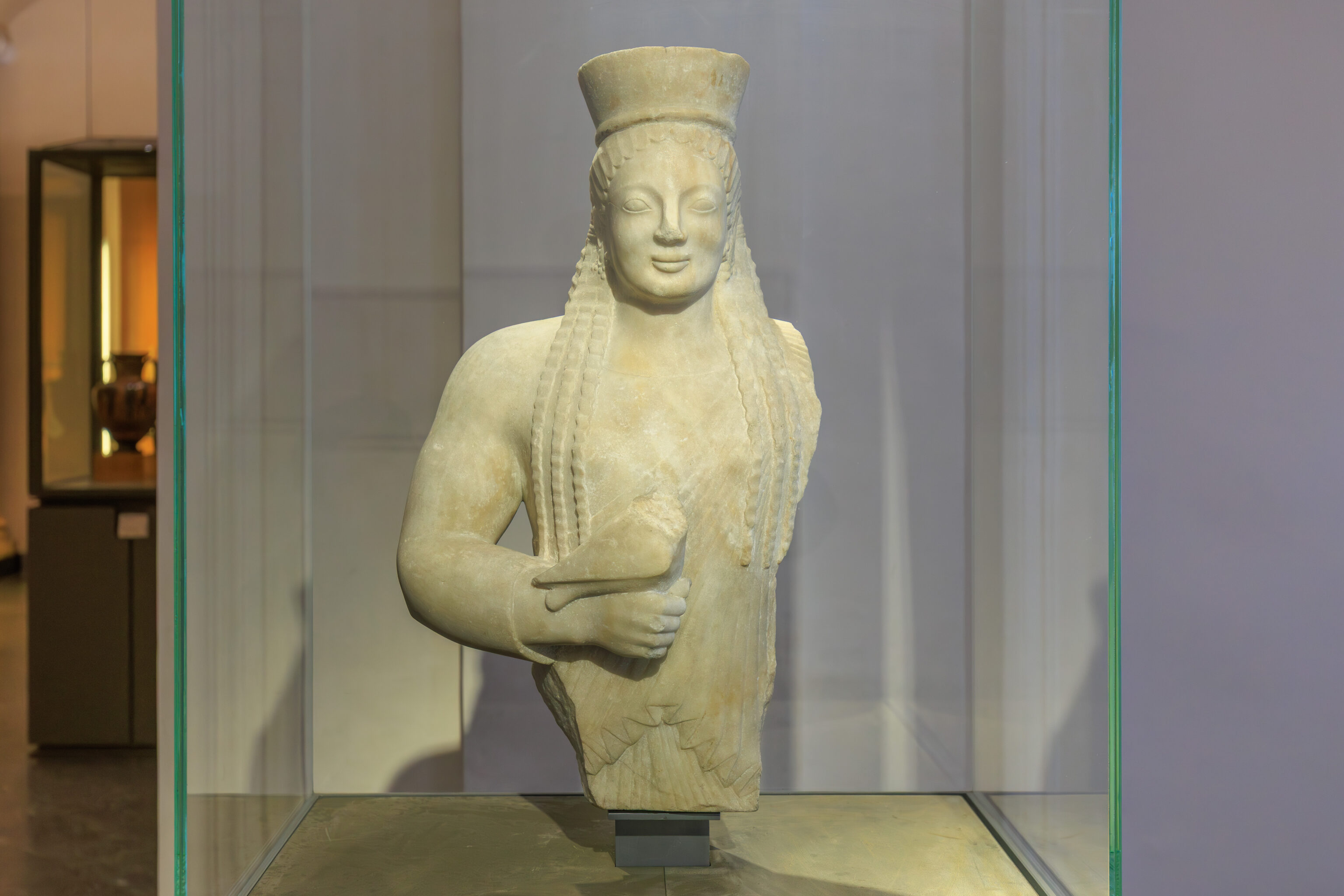 The kouros (boy) and the kore (girl) represent the characteristic types of Archaic Greek statuary (6th century BC). The model is quite stereotypical: a standing figure in a frontal position, nude for the kouros, dressed in a tunic (Doric peplos or Ionian chiton) for the kore; one leg slightly forward and the arm along the body. Sometimes one hand holds an offering (here a bird). The kore is generally considered to be the image of a young Athenian woman offered as a votive offering to the goddess Athena.