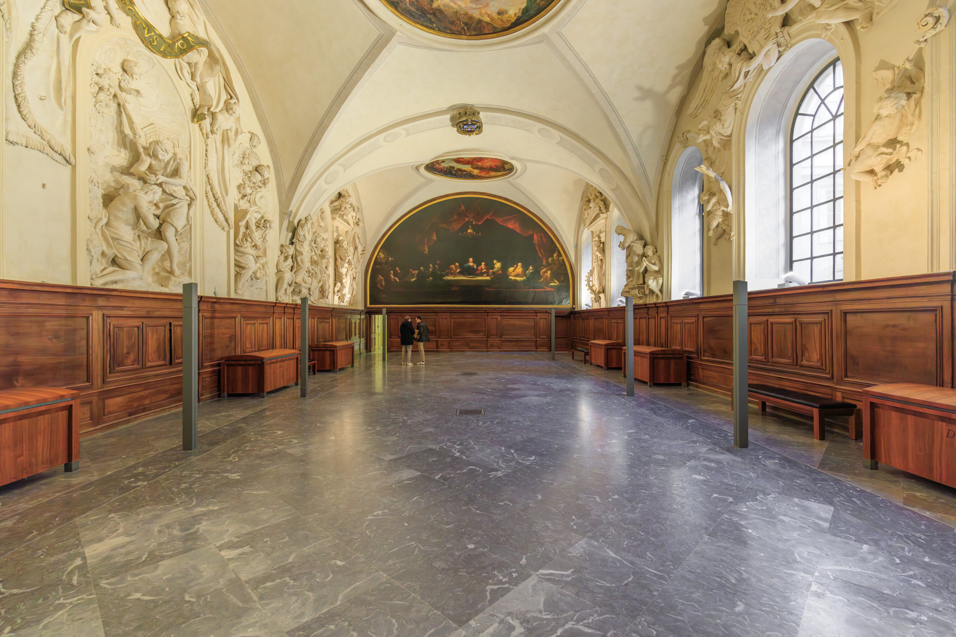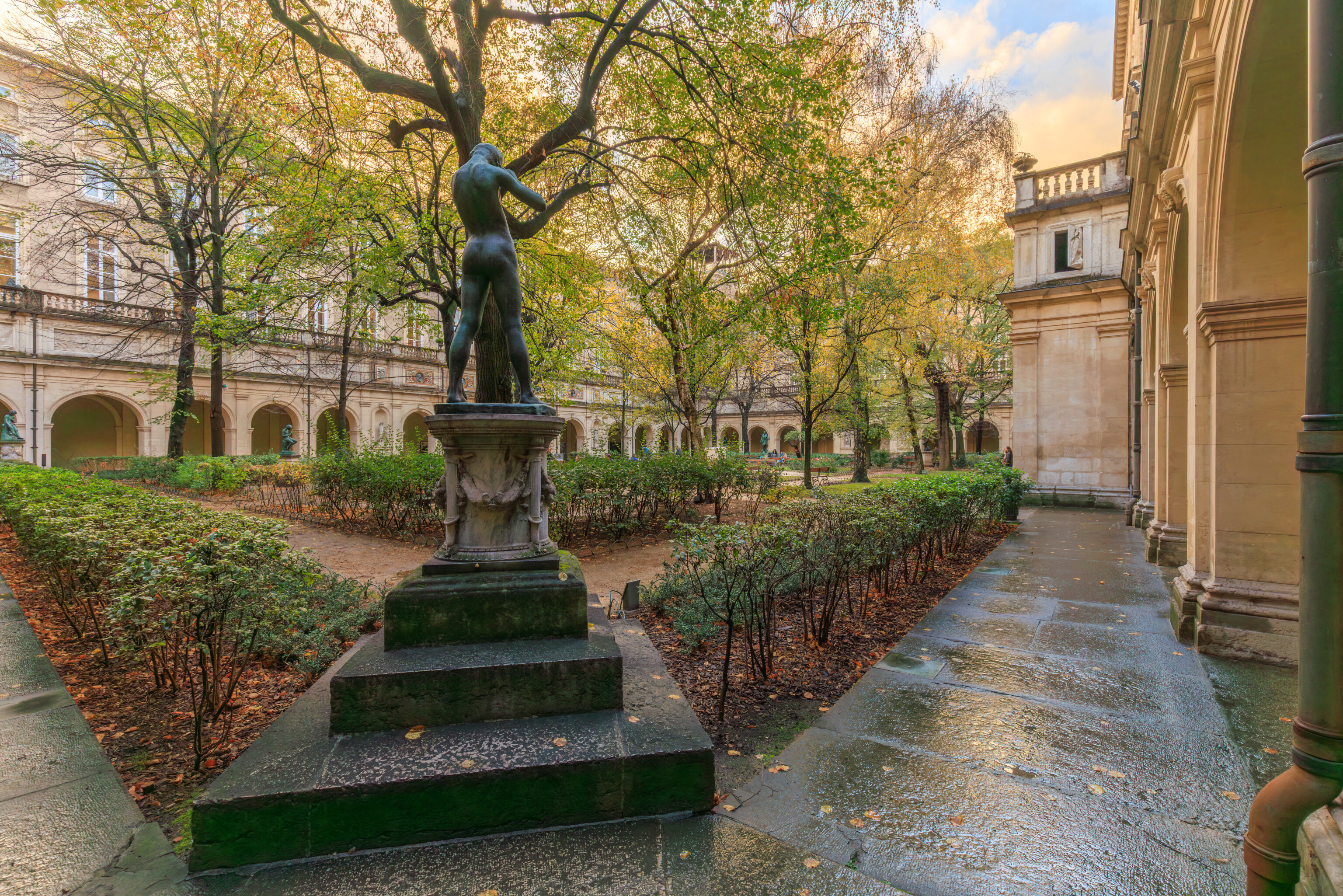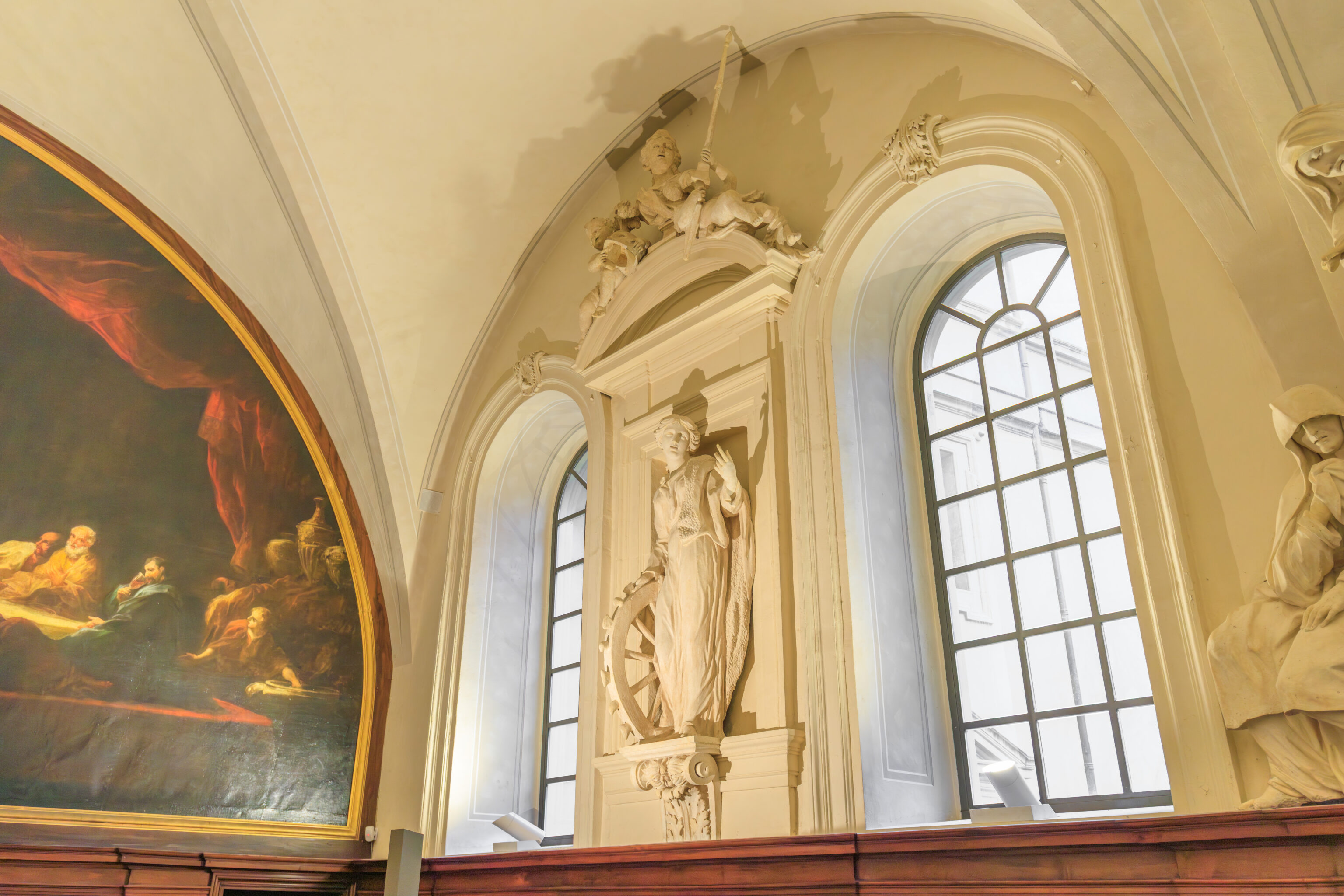This lantern, which features a neoclassical interior decoration of stucco panels, was built at the beginning of the 19th century, probably around 1813-1814, during the work carried out by the architect Gay to install the first Museum of Fine Arts in the South wing of the Palace. At that time, it was decided to close the large side windows of the staircase to transform them into niches for statues. It was therefore necessary to provide new lighting for the staircase, hence the construction of this lantern.