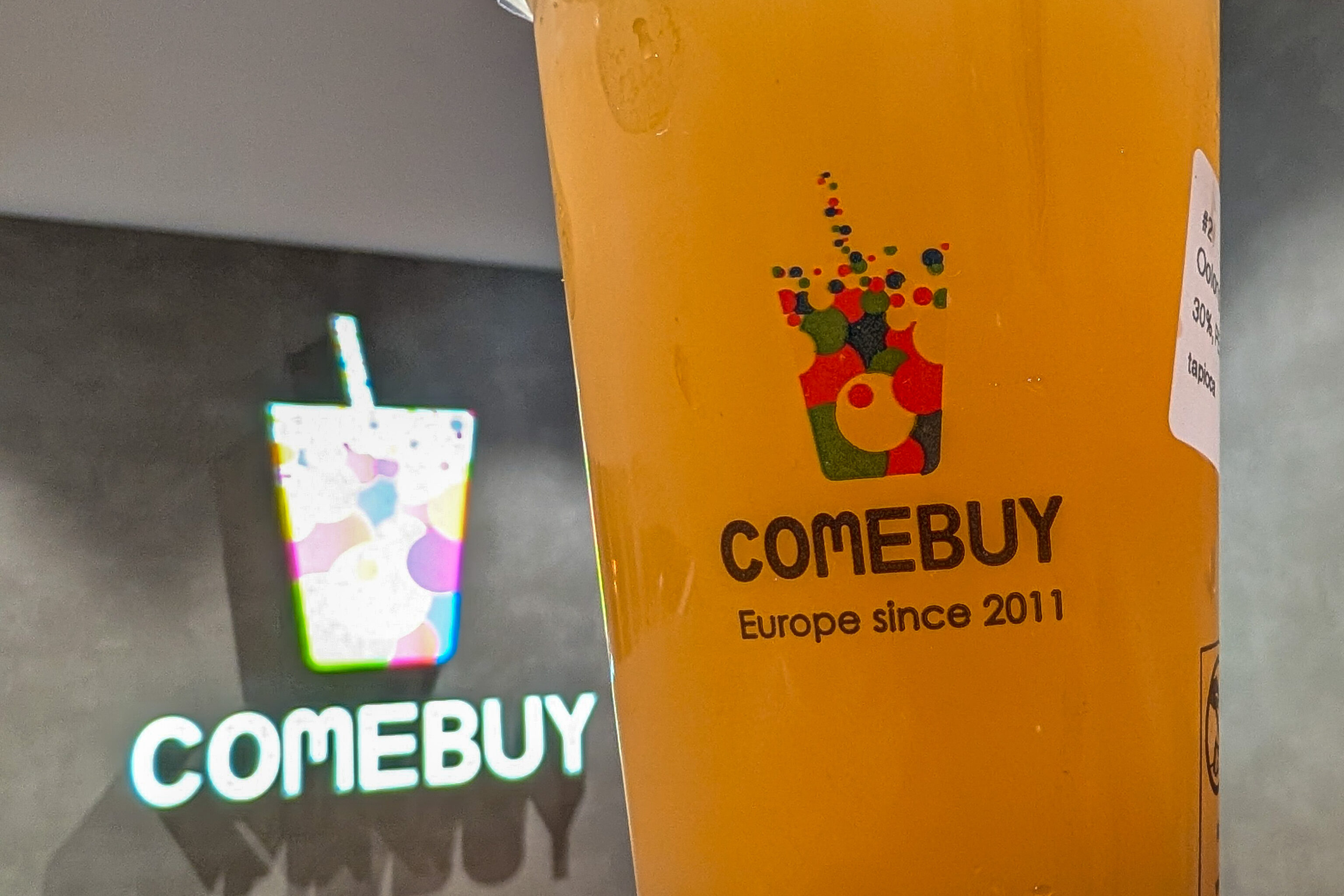 We walked a few short blocks south to Come Buy, which markets itself as COMEBUY and COMEBUYTEA. This chain originates from Taiwan. We have visited them before on previous visits to Taipei. We ordered peach tea with regular pearls.
