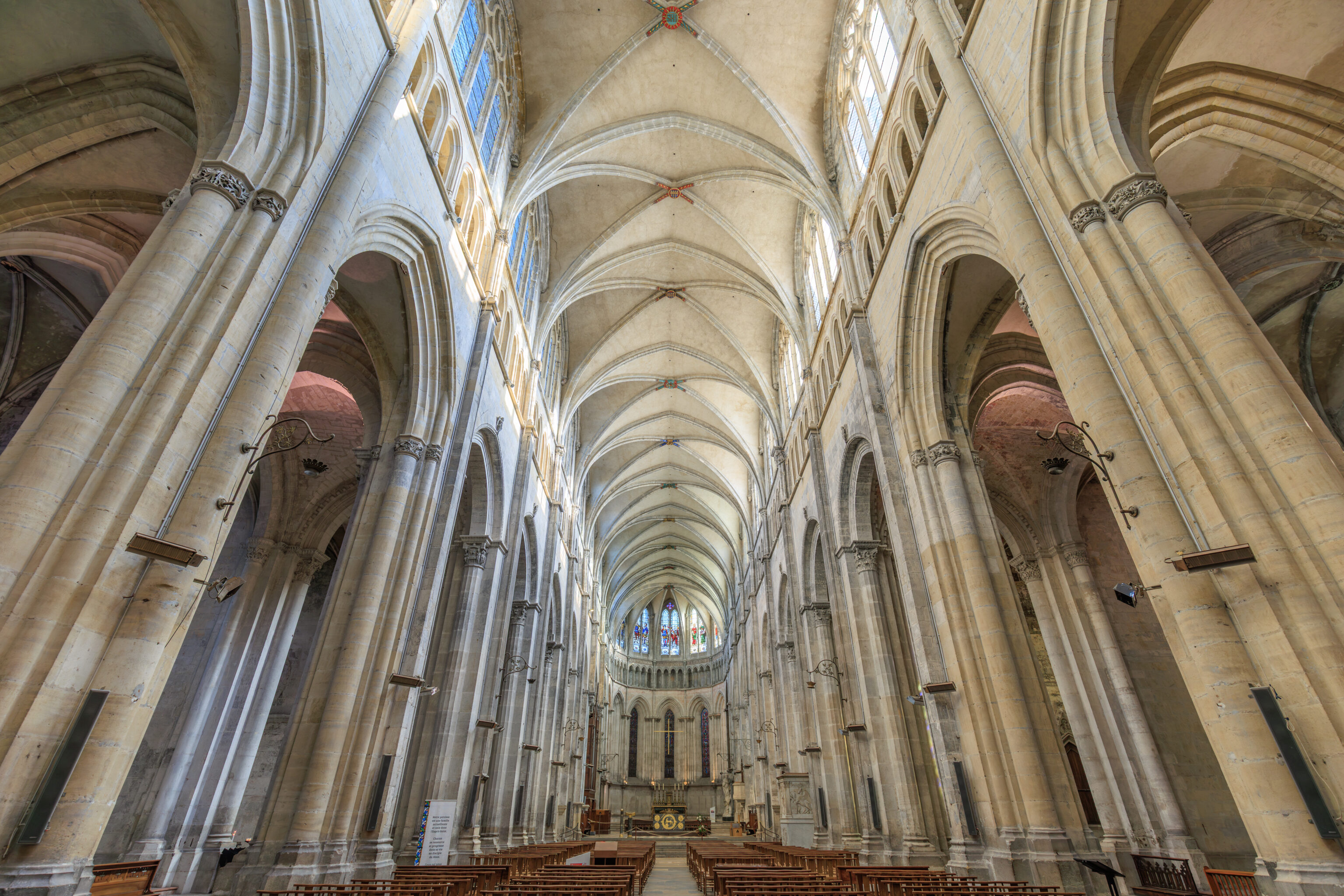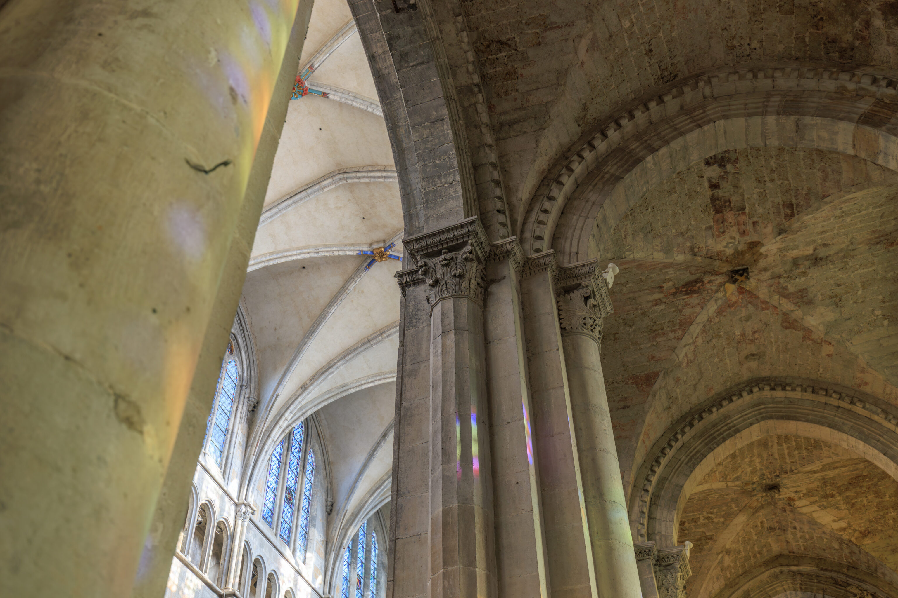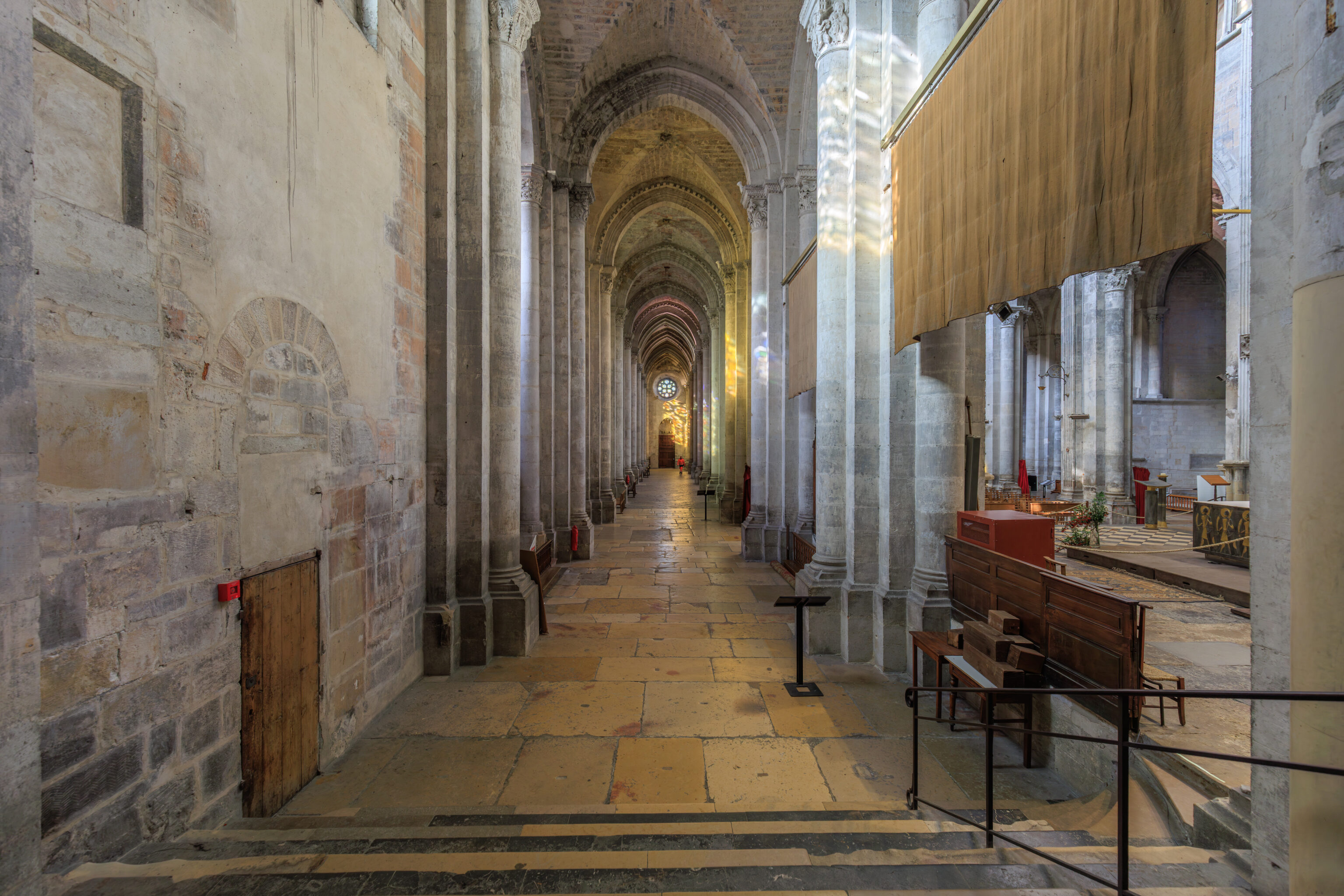 Fluted pilasters punctuate seven preserved bays, from the main nave to the sanctuary; high arcades resting on engaged half-columns connect the nave and the side aisles. The capitals still in place attest to the importance of the sculpted decoration. These are supplemented by sculptures reused and repositioned later in different parts of the cathedral, both inside and outside (north side), as subsequent construction progressed.