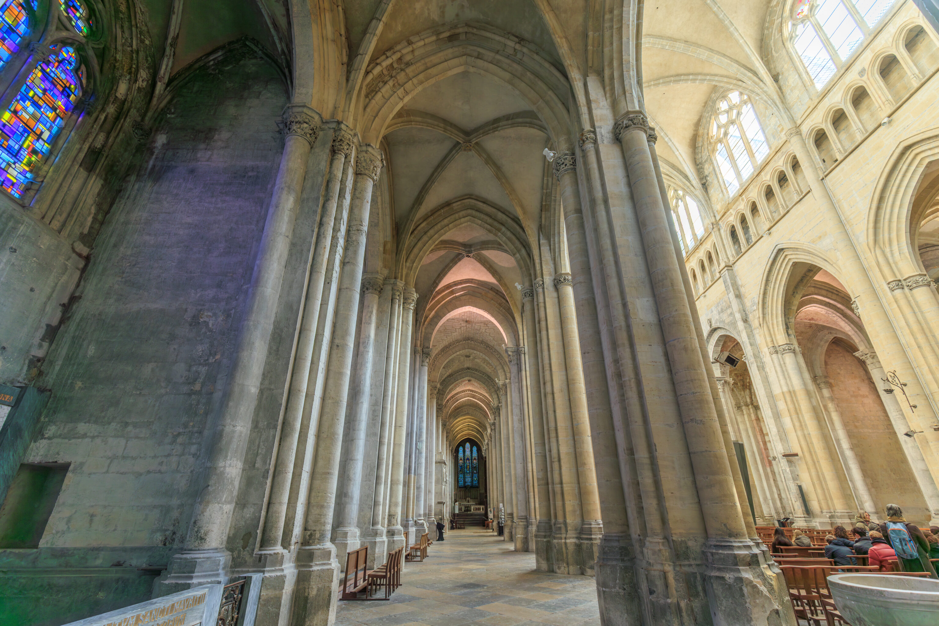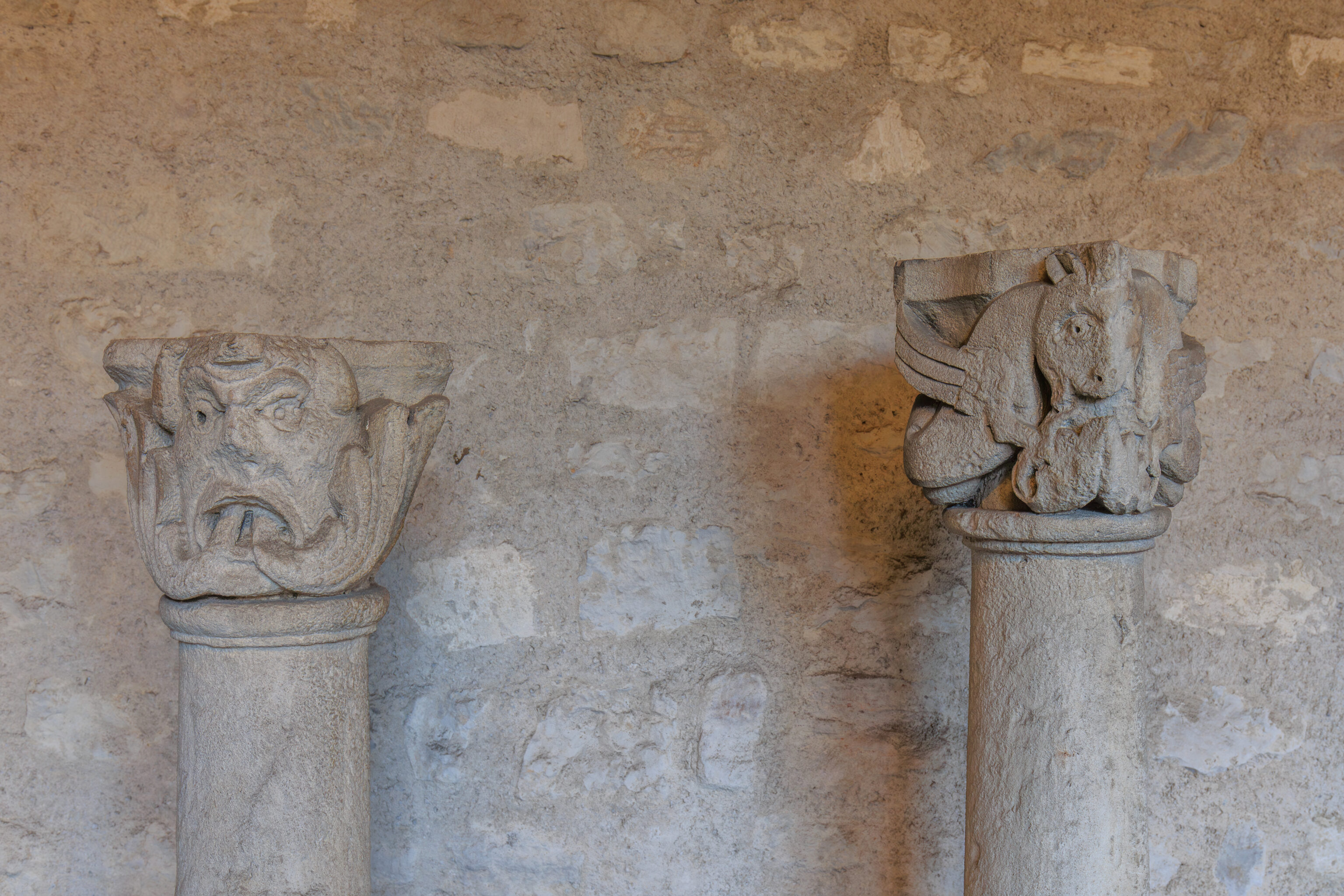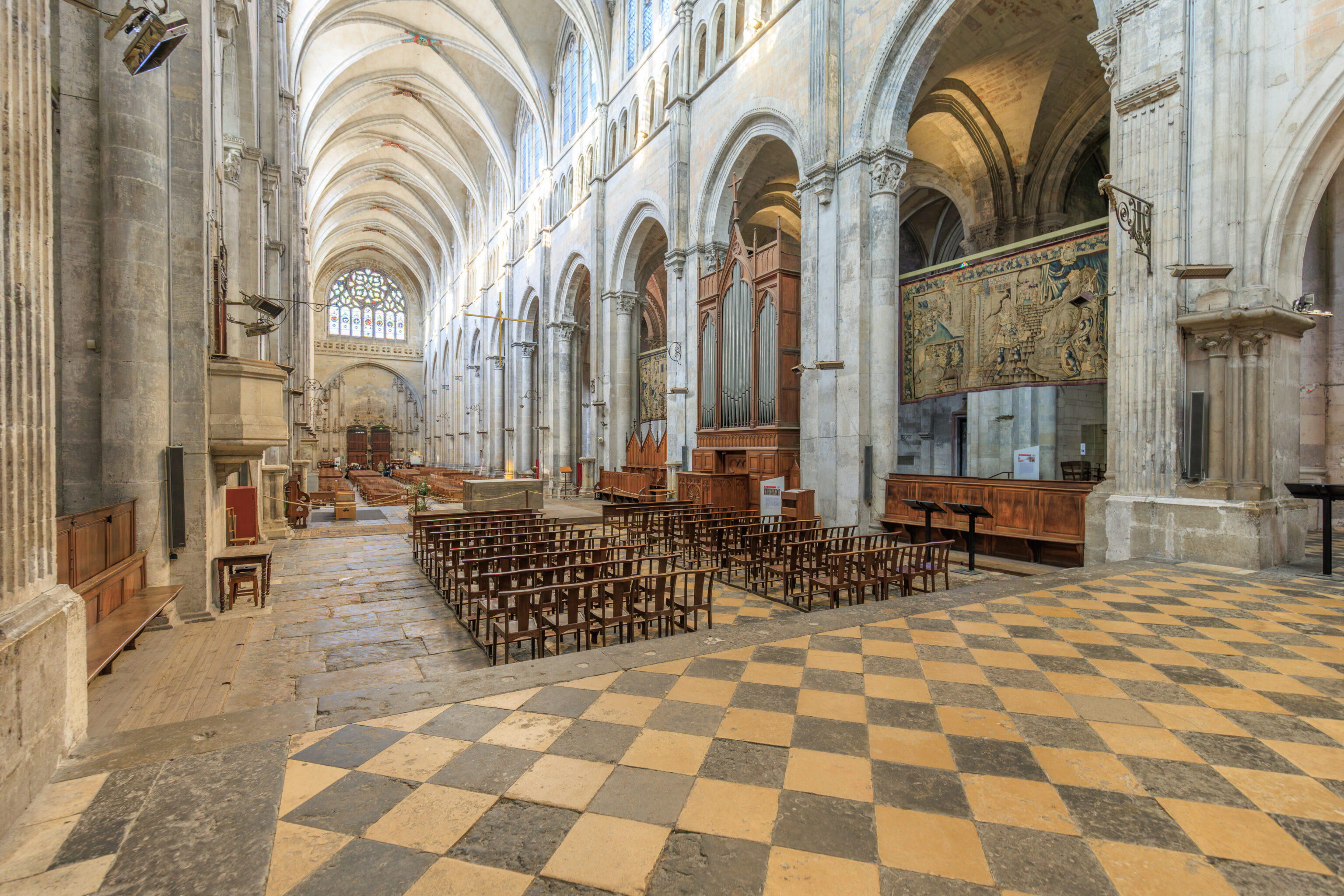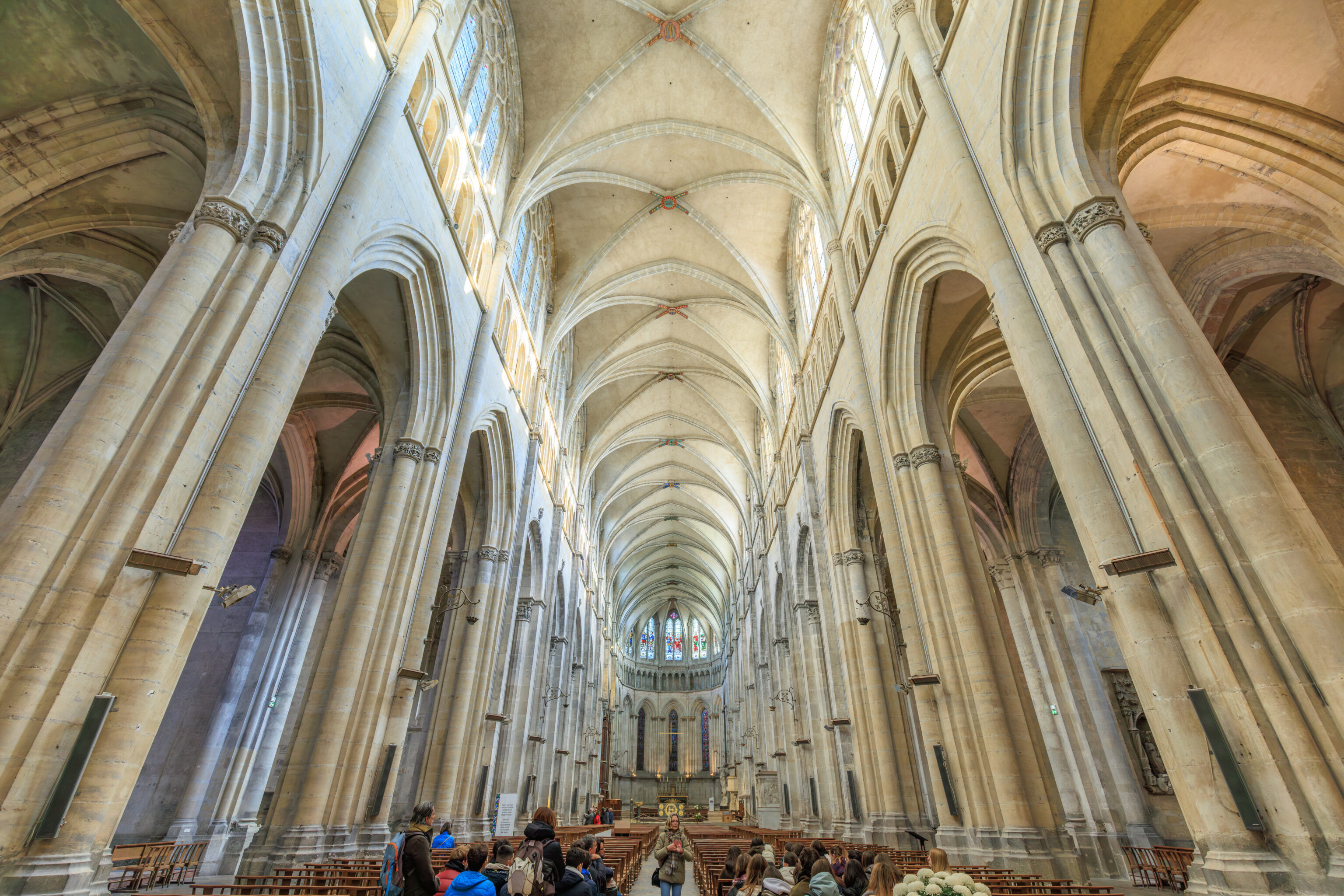 Fluted pilasters punctuate seven preserved bays, from the main nave to the sanctuary; high arcades resting on engaged half-columns connect the nave and the side aisles. The capitals still in place attest to the importance of the sculpted decoration. These are supplemented by sculptures reused and repositioned later in different parts of the cathedral, both inside and outside (north side), as subsequent construction progressed.