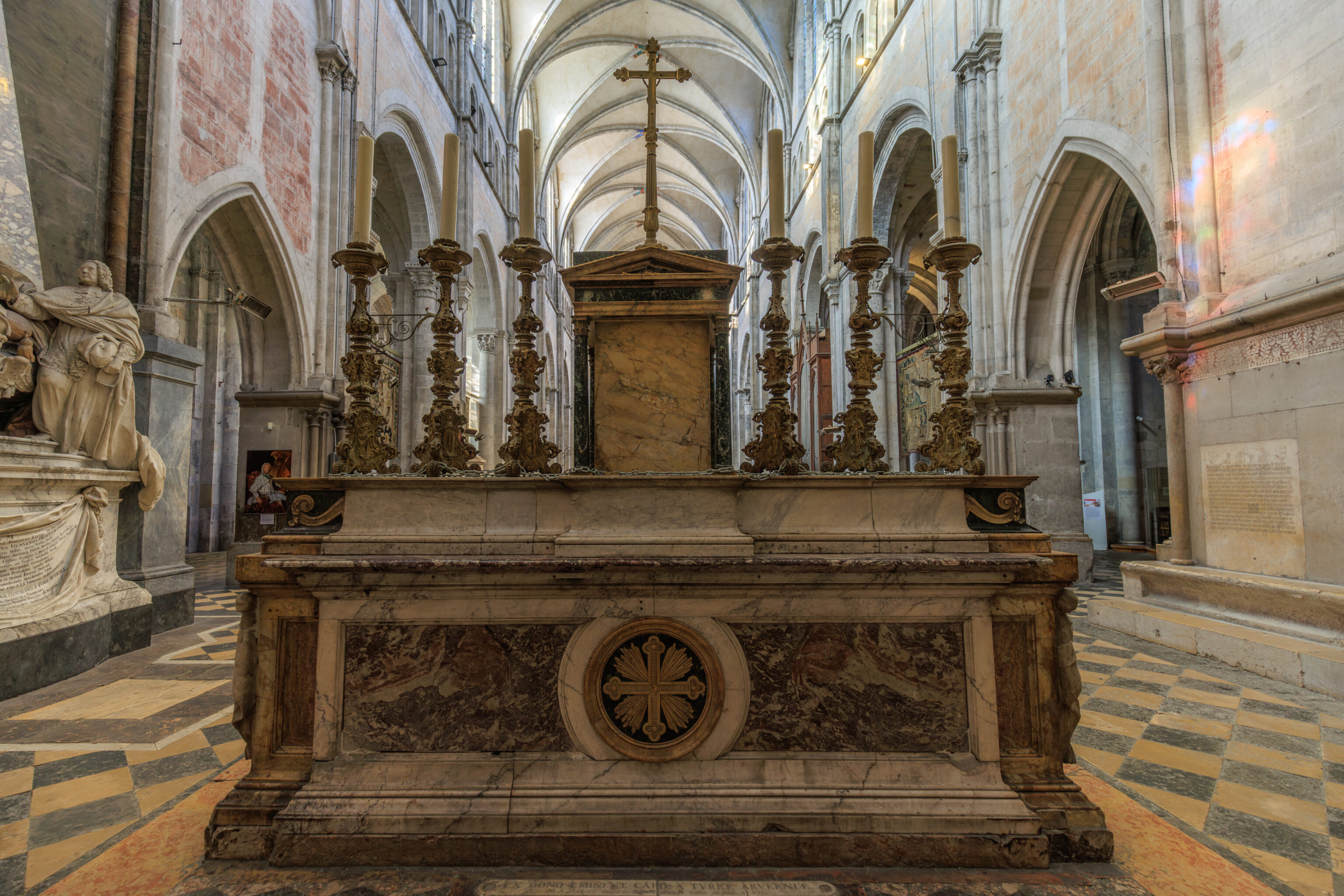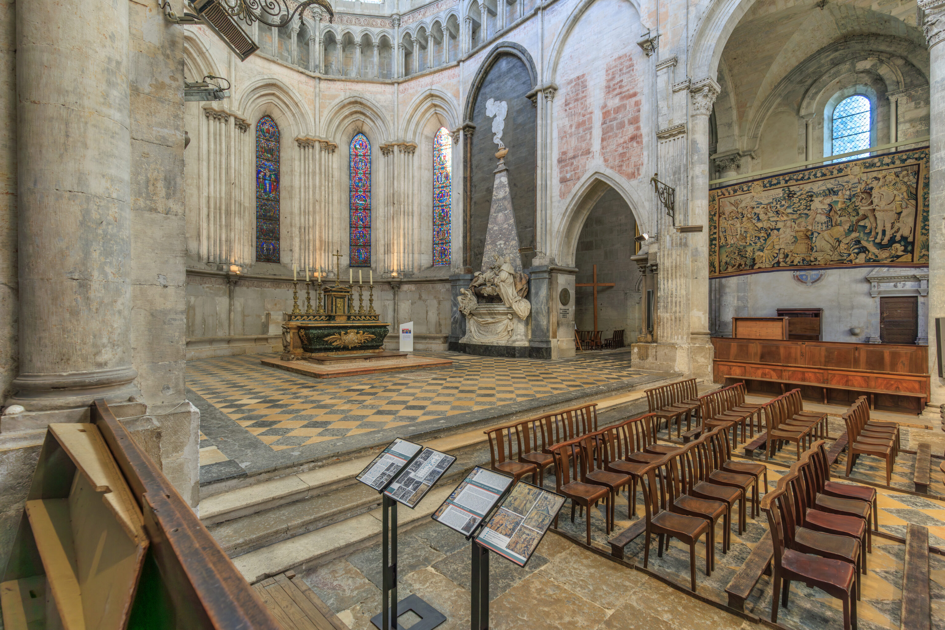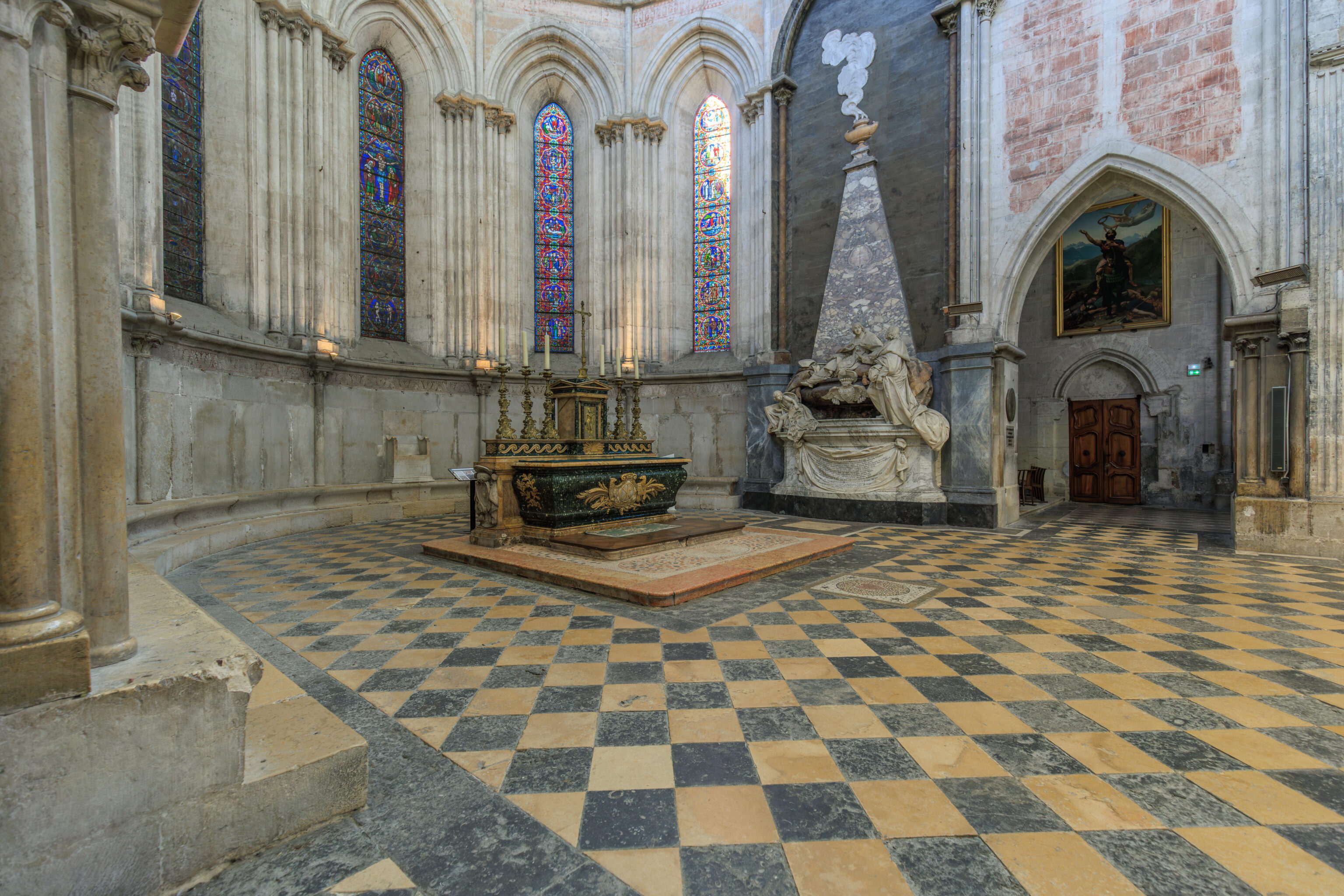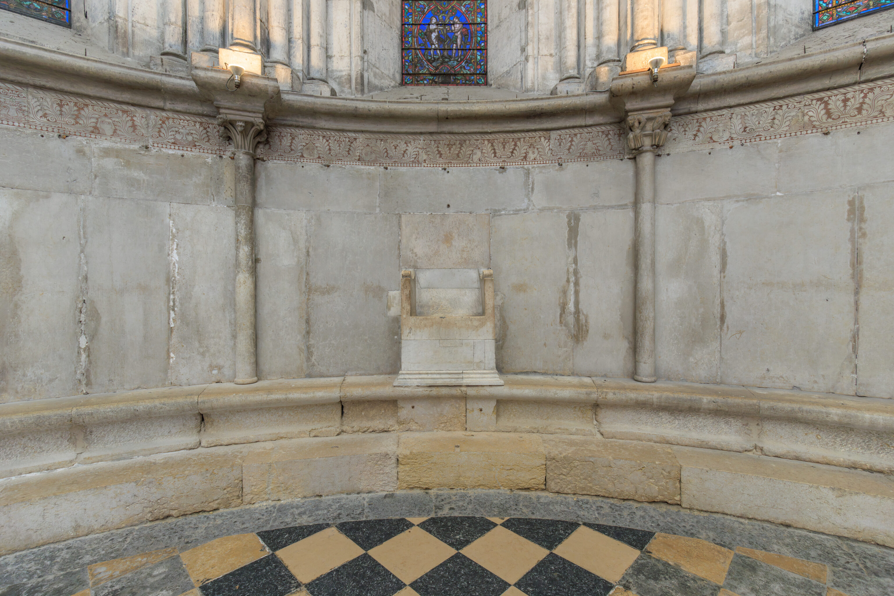 Over the centuries, the evolution of liturgical practices, changing fashions, the violence of the destruction perpetrated by Huguenot bands, deliberate demolitions (for example, the rood screen), the suppression of the Viennese bishopric (1790-1801), the malicious destruction of furnishings (paintings, altars, statues), and their removal or abandonment have altered the interior appearance of the cathedral. Almost no evidence remains of the liturgical furnishings prior to the 19th century (except for the marble high altar at the rear of the choir). In contrast, the episcopal chair (cathedra), a relic from the early Middle Ages, has been piously preserved in the apse, even though it is no longer in use.