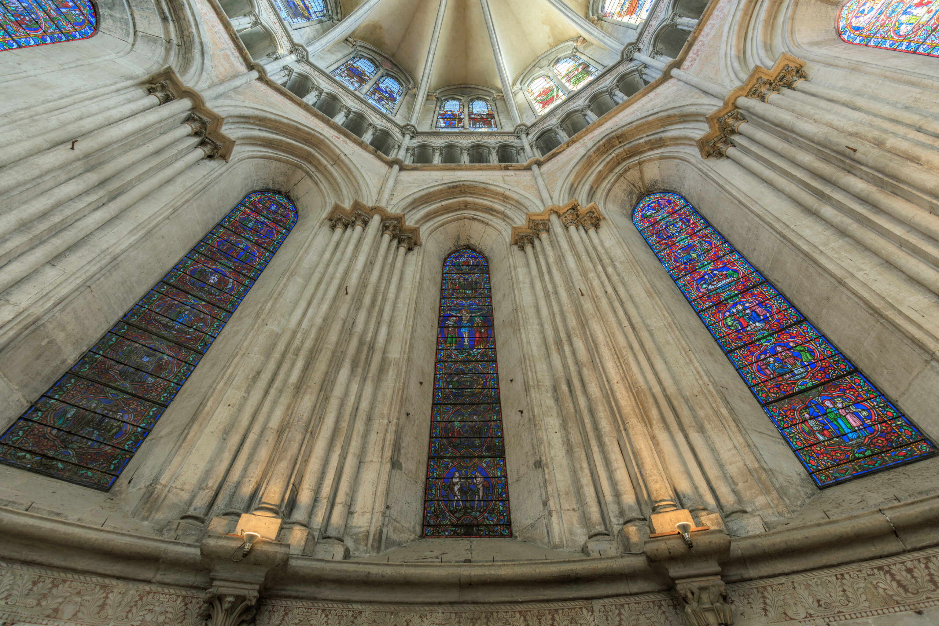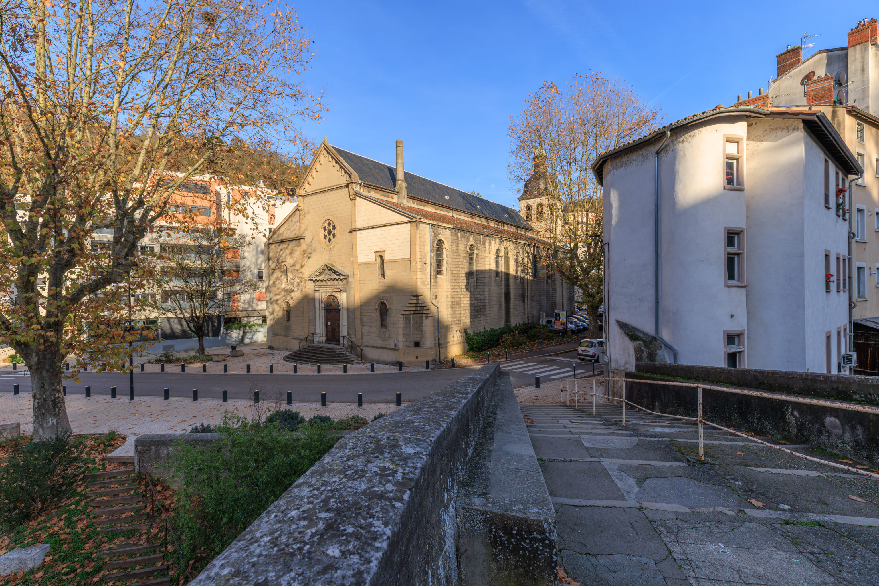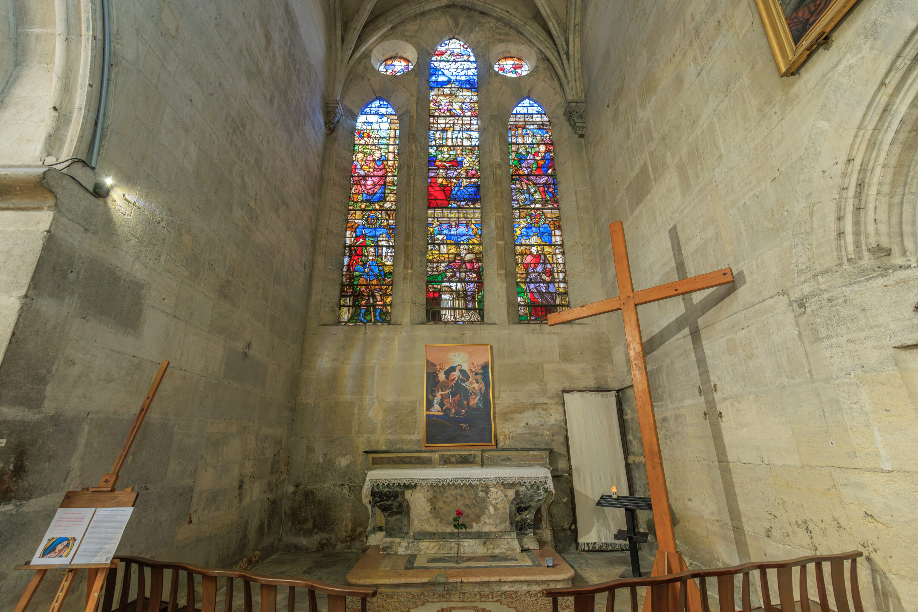 The stained-glass windows in the choir were created in 1898 by the workshop of the Lyon-based master glassmaker Lucien Bégule.