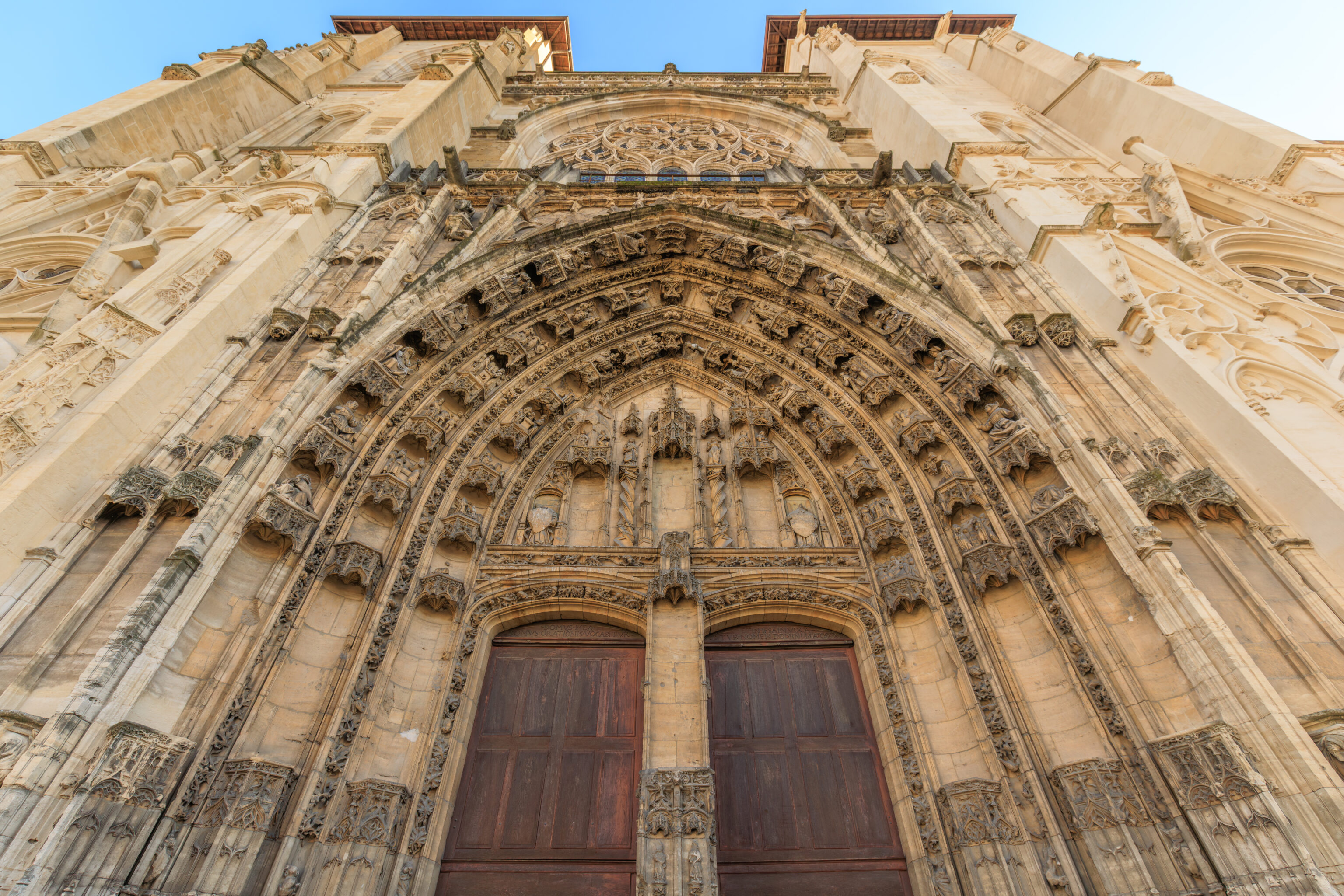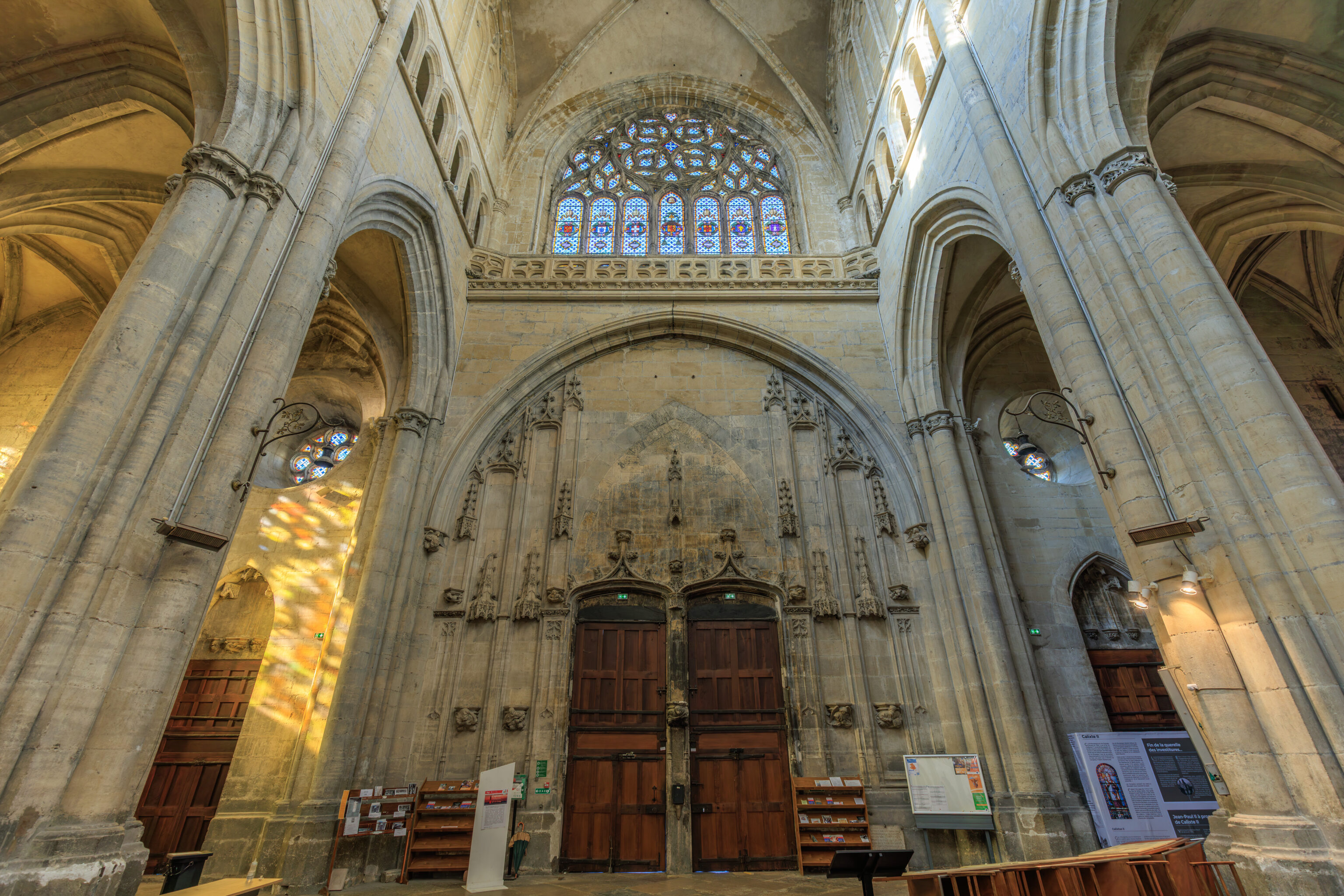 The portals on the west facade date back to the 14th and 15th centuries. The sculptures on the main doors were destroyed during the Wars of Religion.