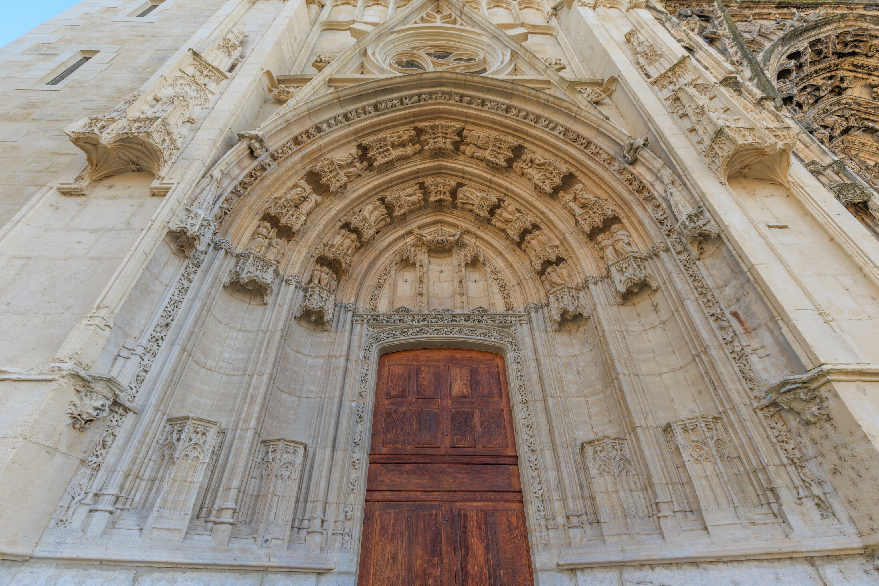 The work was financed by donations, bequests, and contributions, both voluntary and mandated, from the clergy, canons, and prominent families. To the west, the three portals of the facade, although executed successively over nearly a century, present themselves as a frontispiece, with sculpted imagery illustrating the biblical message centered on the history of Salvation, from the prophets of the Old Testament to Christ and the queenship of Mary in heaven.