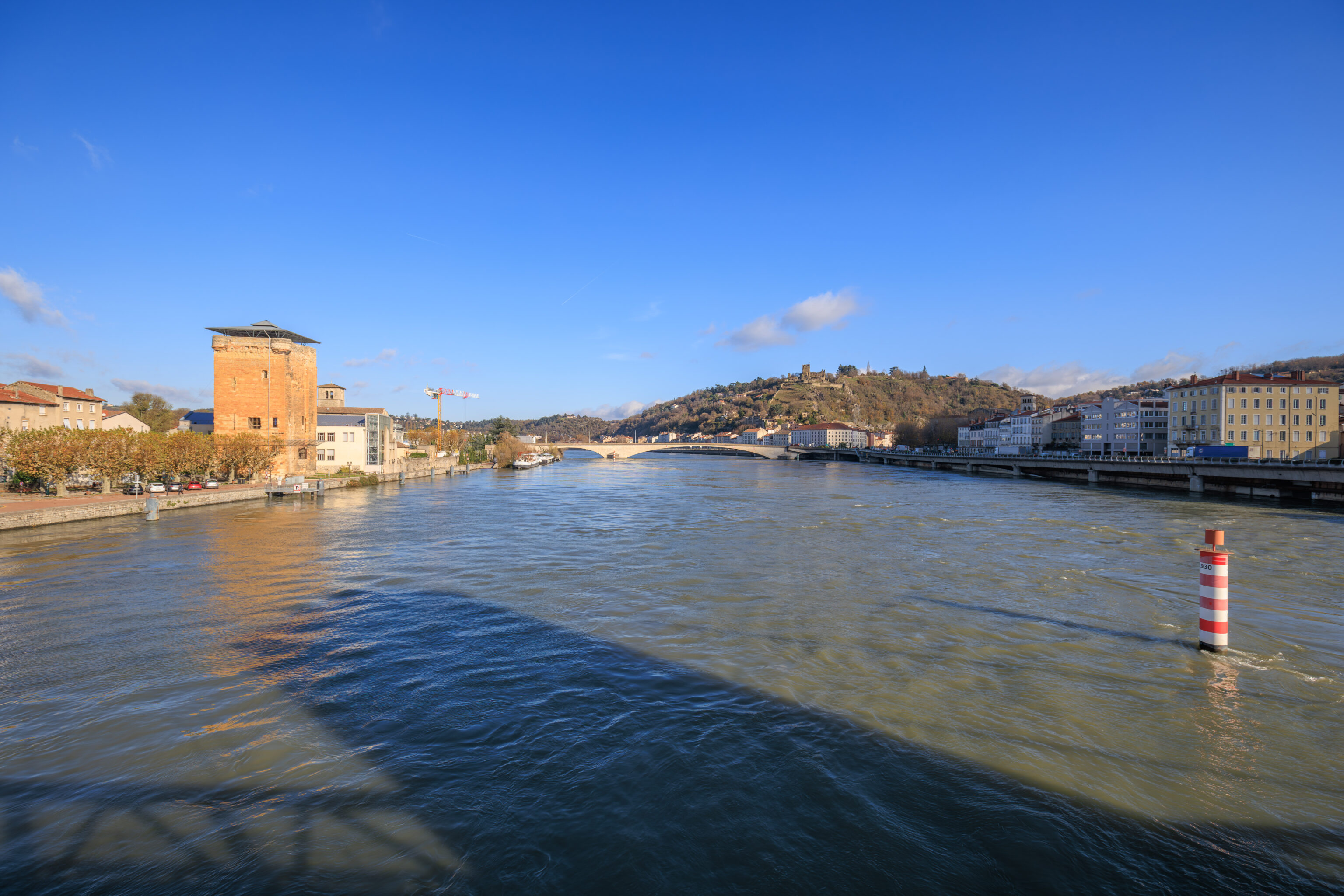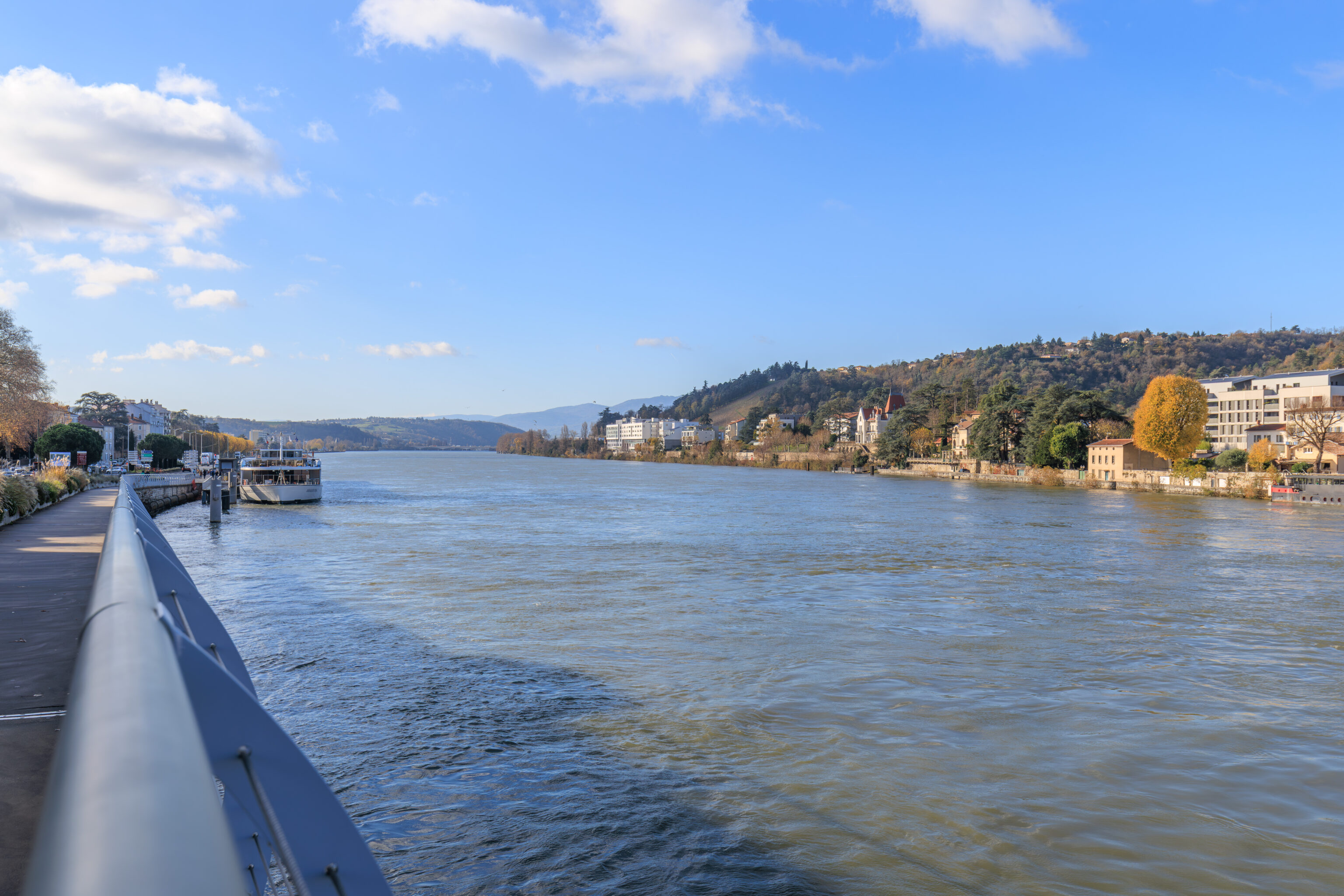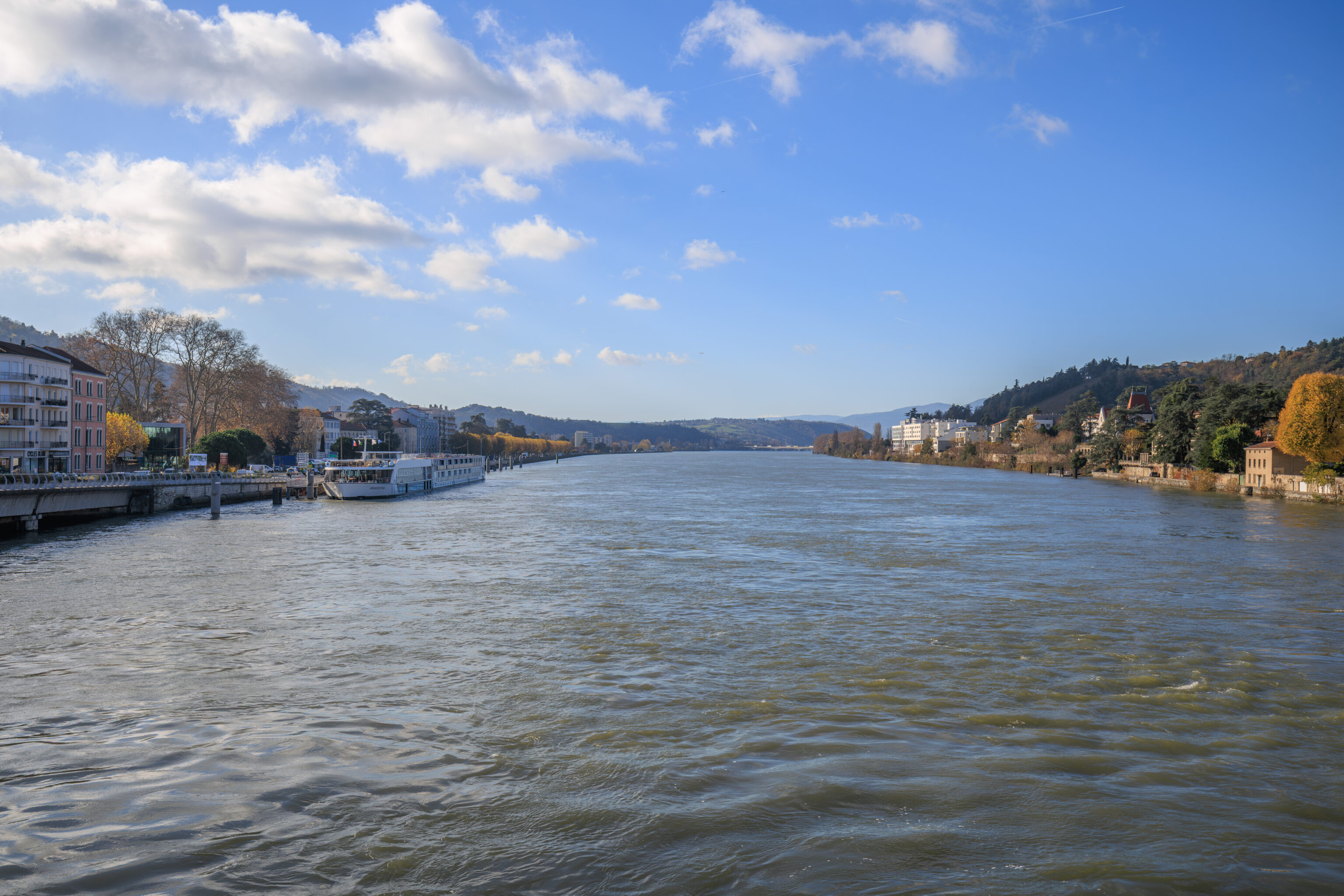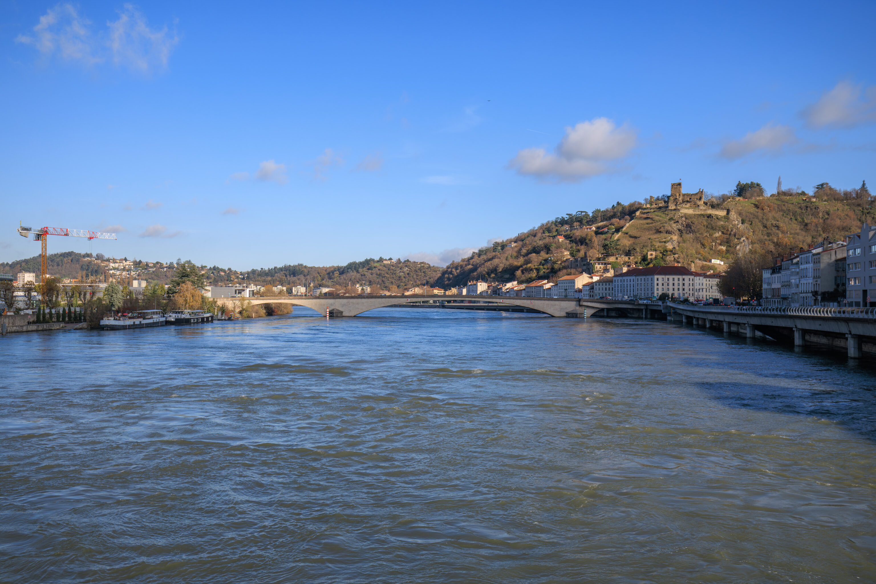 We headed out at around 8:30am to catch the next train to Vienne, a town about twenty minutes away by train. We decided to cross the Rhône via the Pont de la Guillotière, the bridge just to the south of the hotel, seen here from the southwestern corner of the bridge.