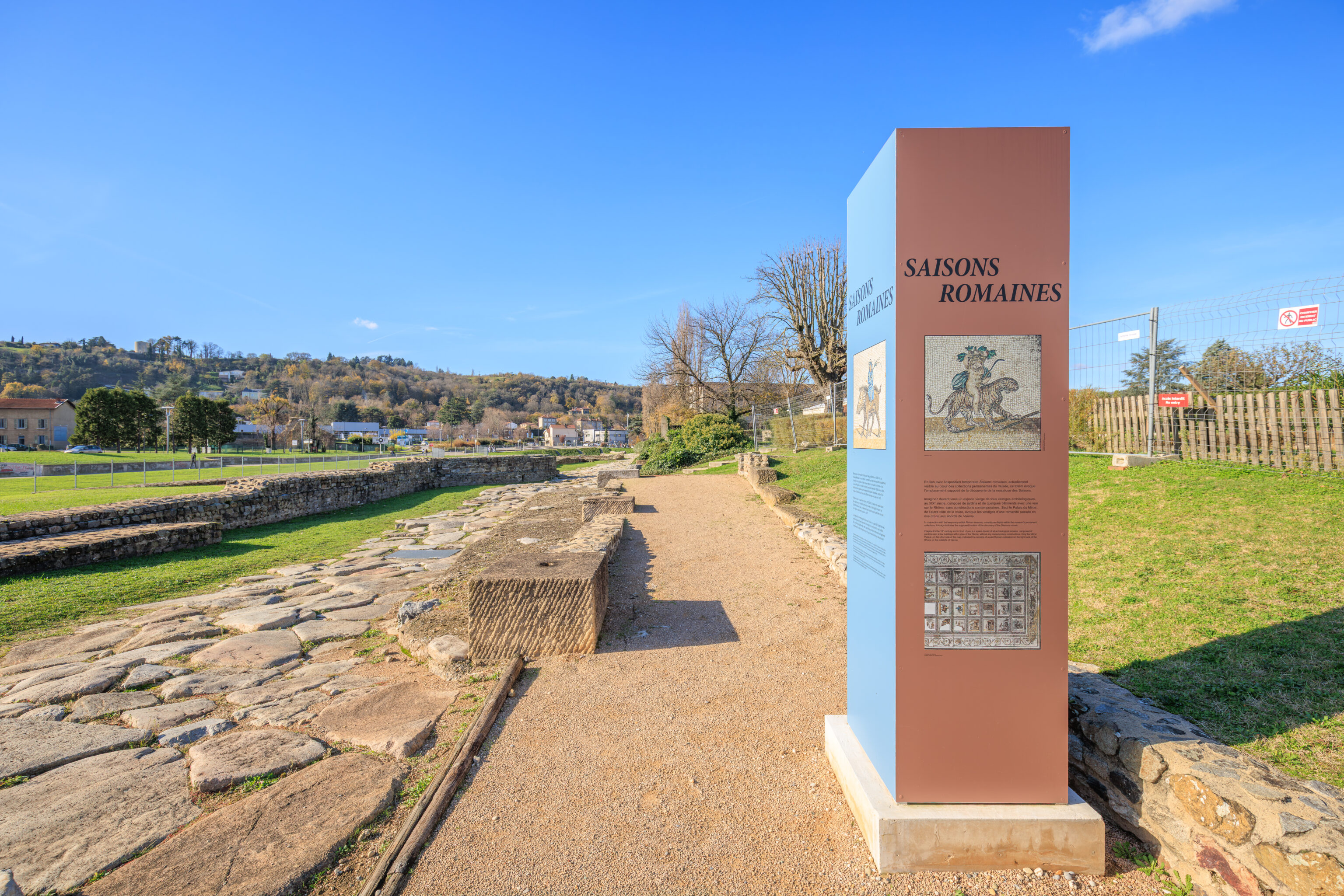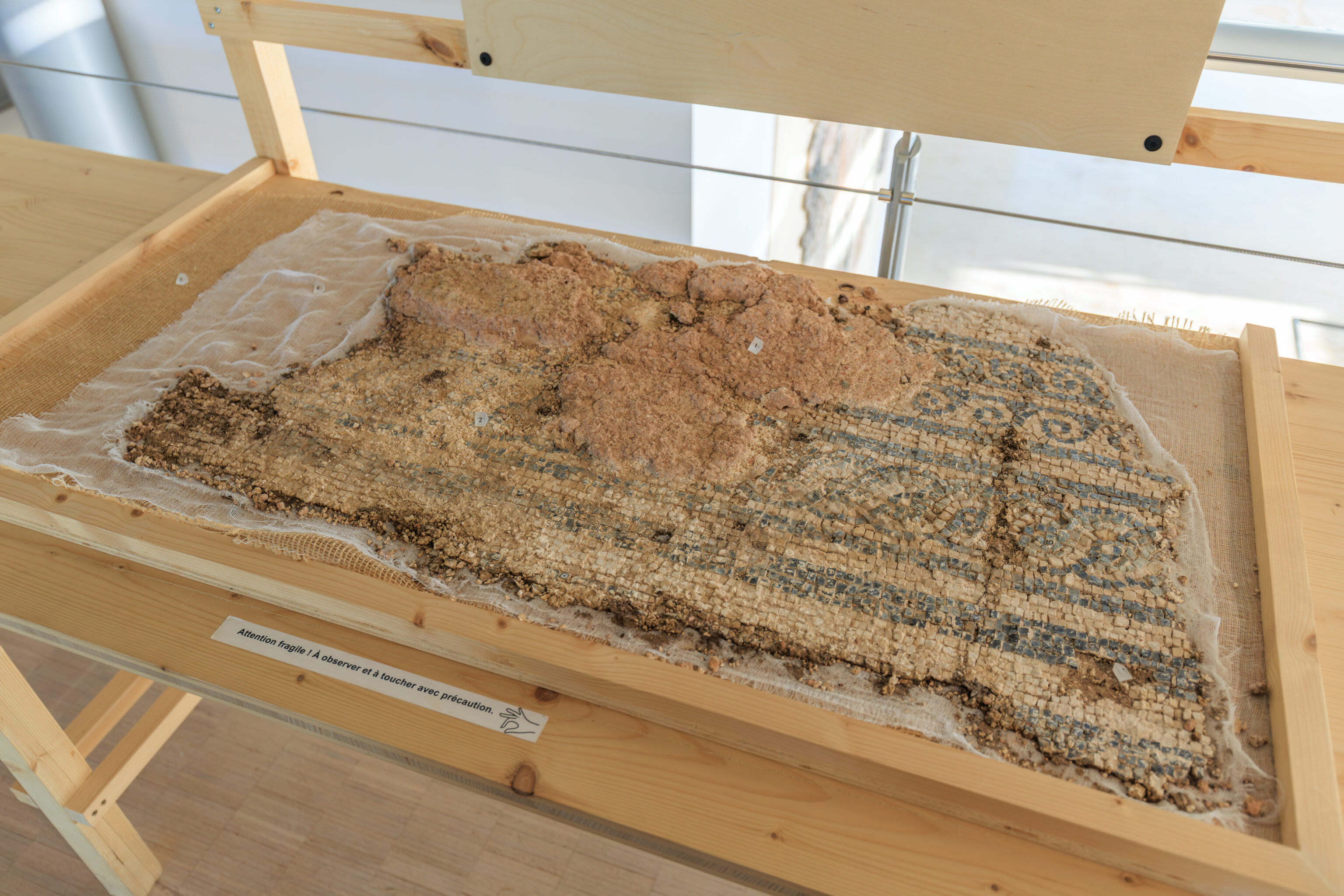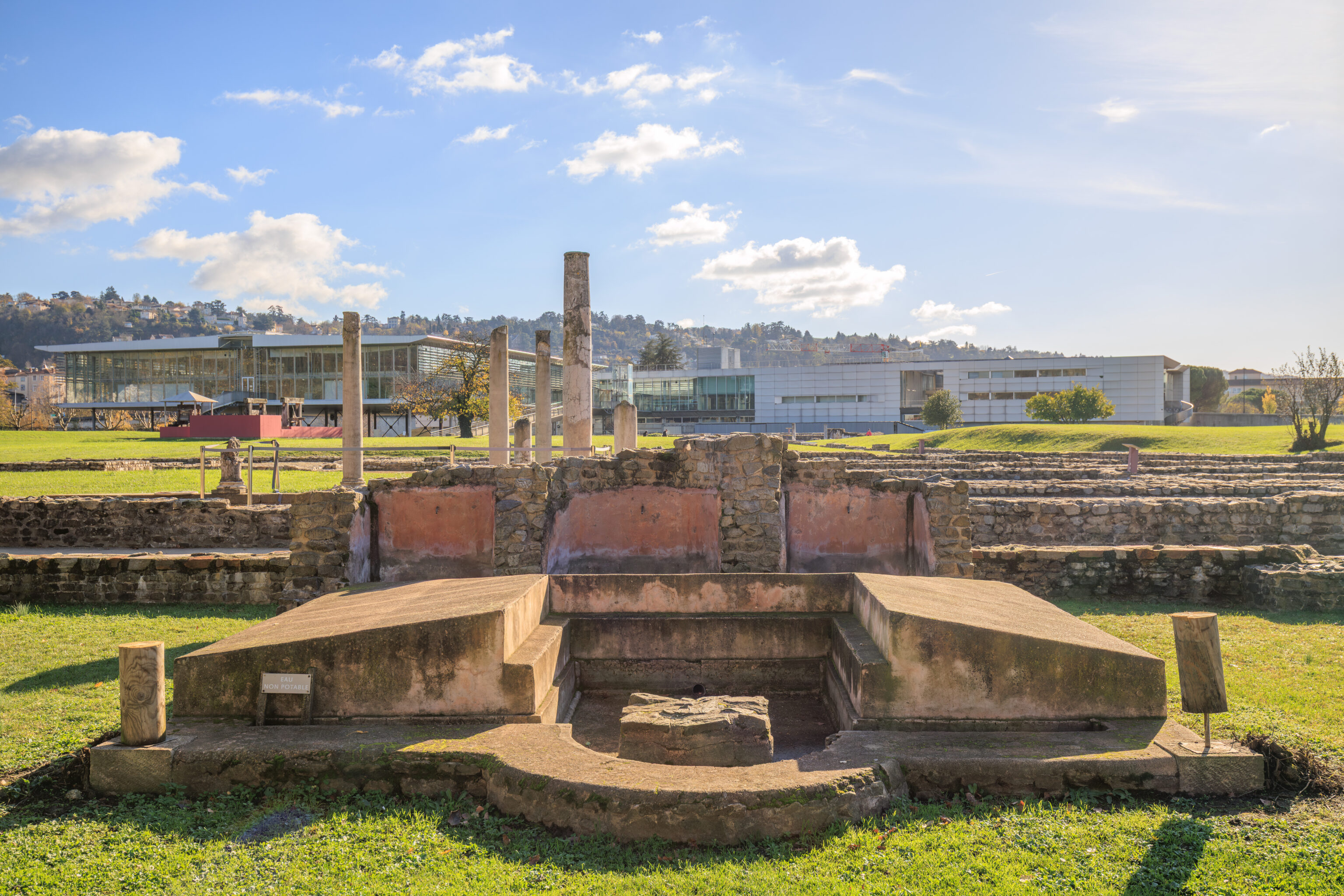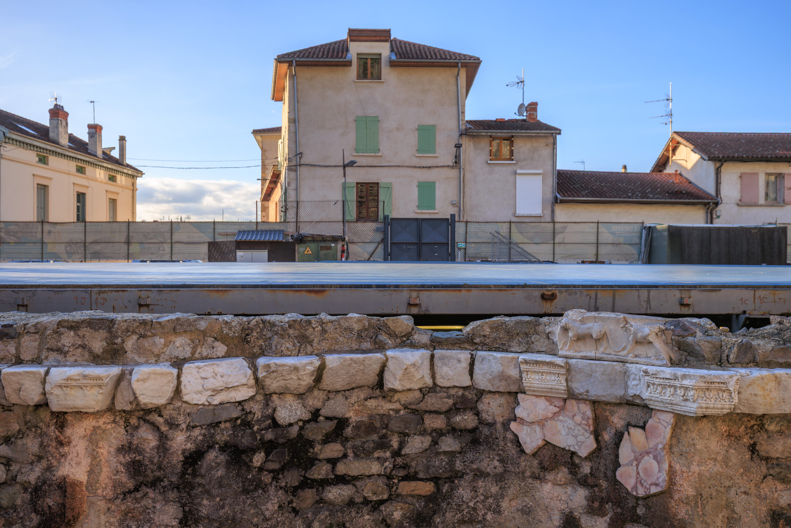 In parallel, preventive excavations have accompanied each stage of the work. Led by the Archeodunum company under the supervision of the Regional Archaeology Service, these excavations have expanded our knowledge of the southern part of the site. The 310 square meters excavated have allowed archaeologists to identify the different phases of occupation of the House of the Oscilla. In the vestibule, five construction campaigns have been identified. A major discovery was also made to the west of the house: the foundations of a large public fountain dating from the late 1st to early 2nd century. Some blocks bore epigraphic inscriptions mentioning public figures, such as Titus Decidius Domitianus and Licinia Optatina, enriching our understanding of the elites of ancient Vienne. After scientific surveys, the fountain was protected and reburied in situ. It is now part of the remains hidden beneath your feet, both those already known and those yet to be discovered.