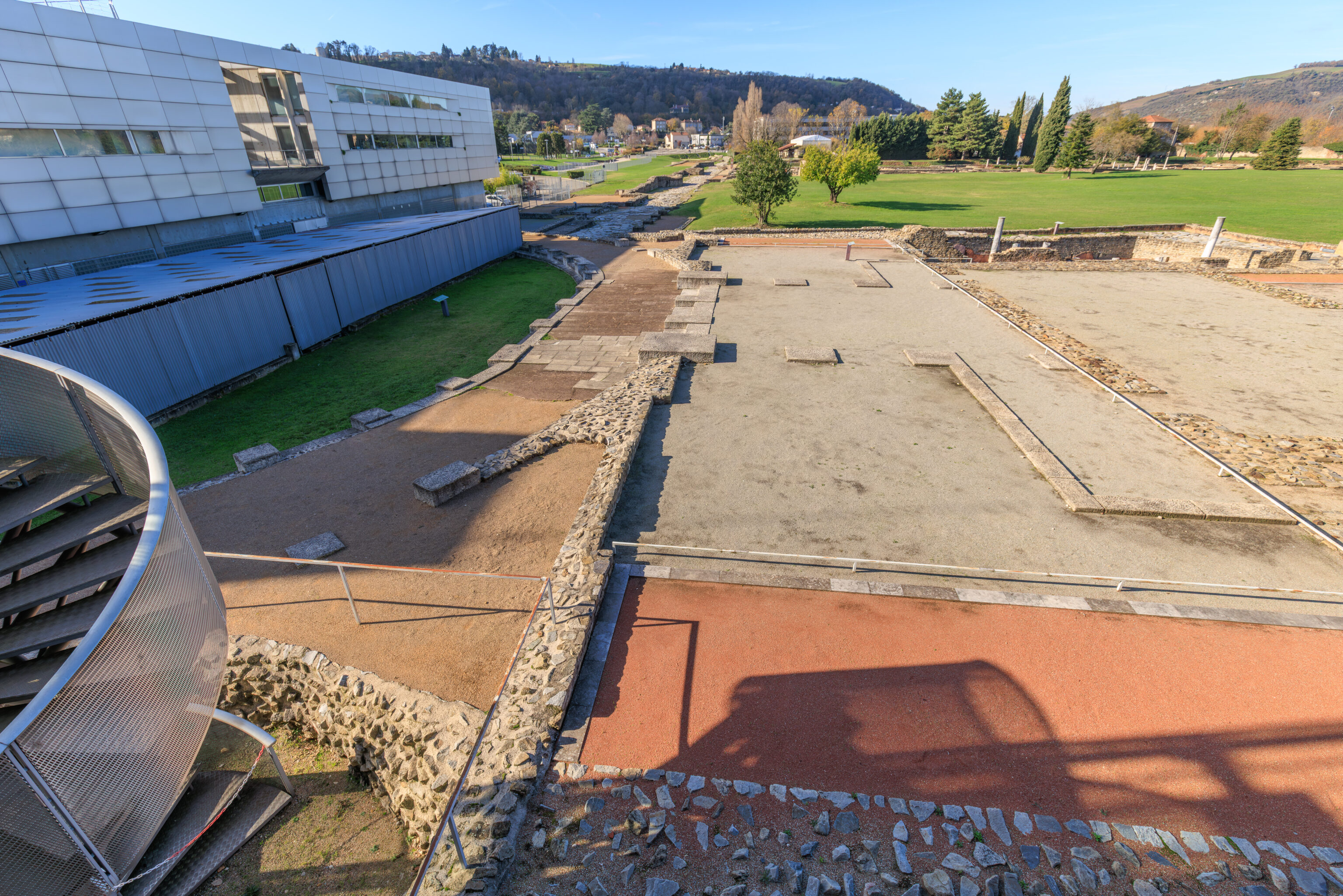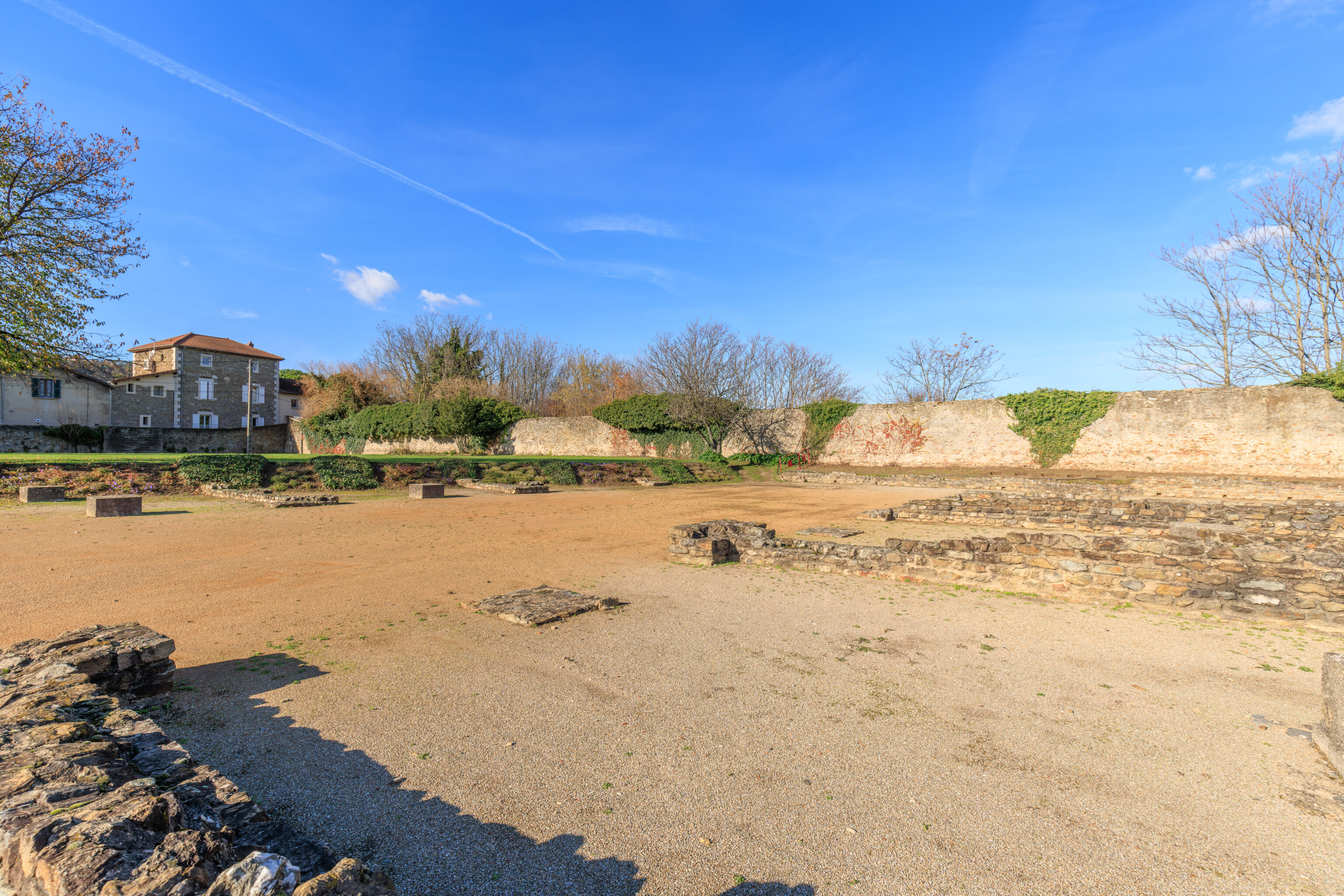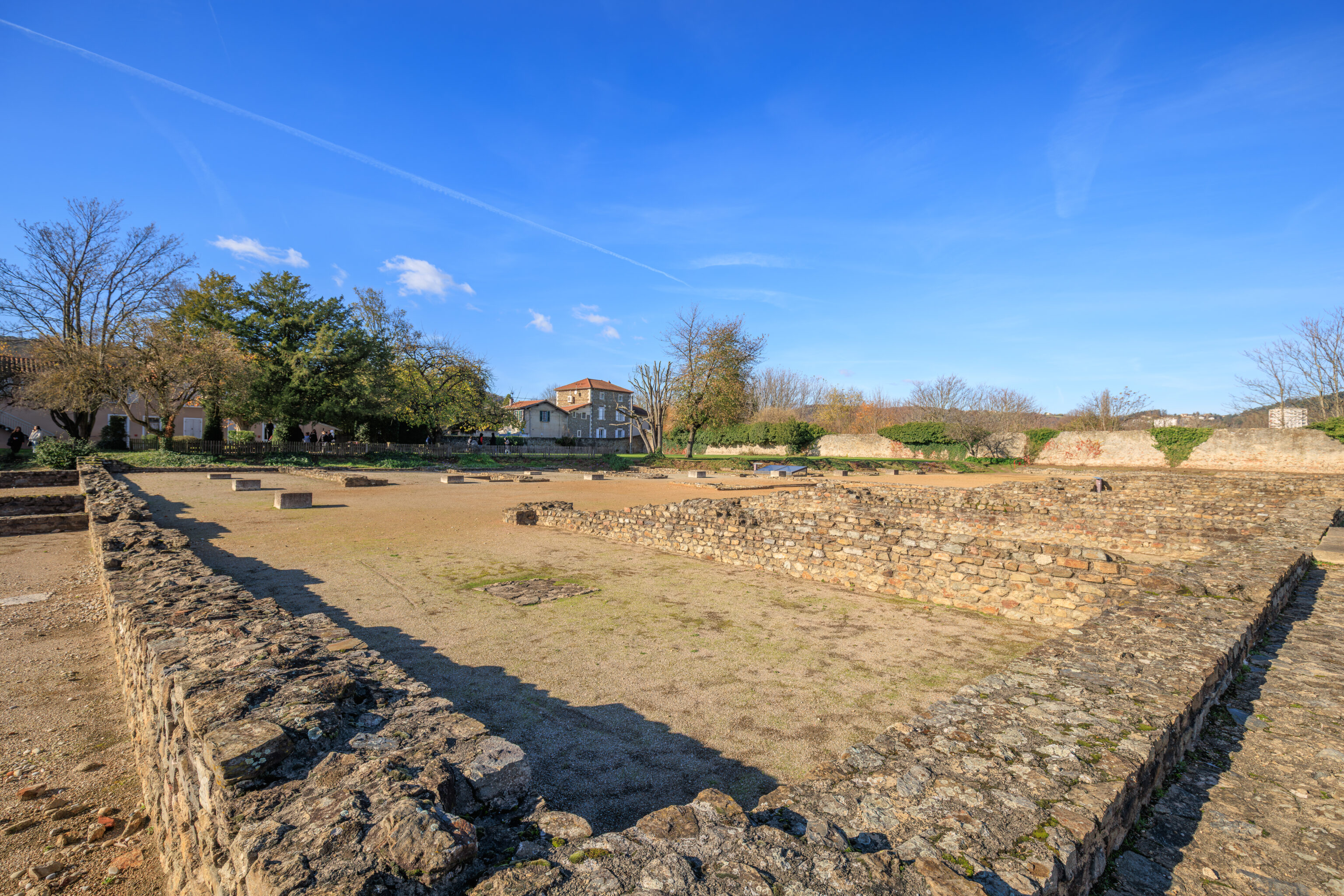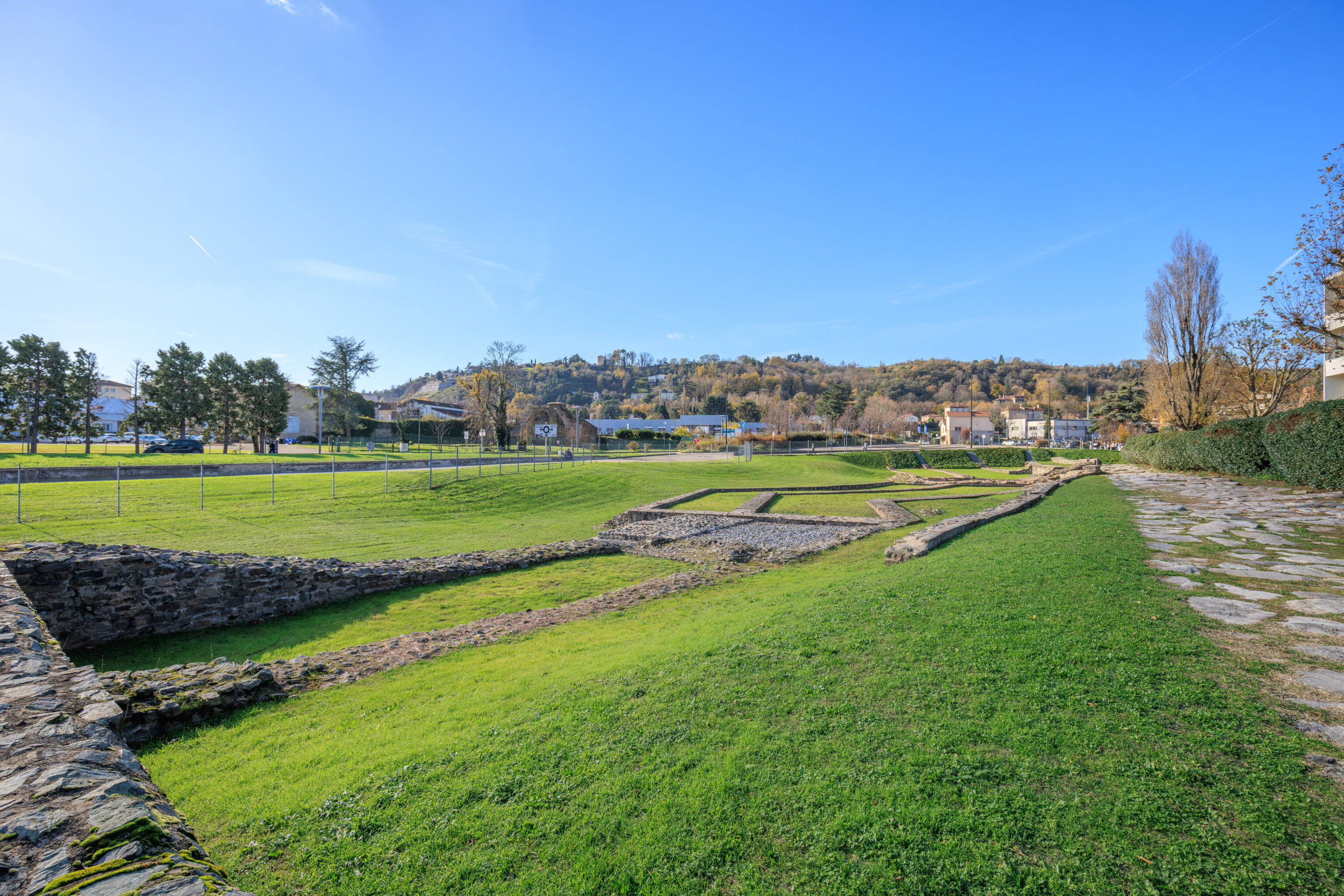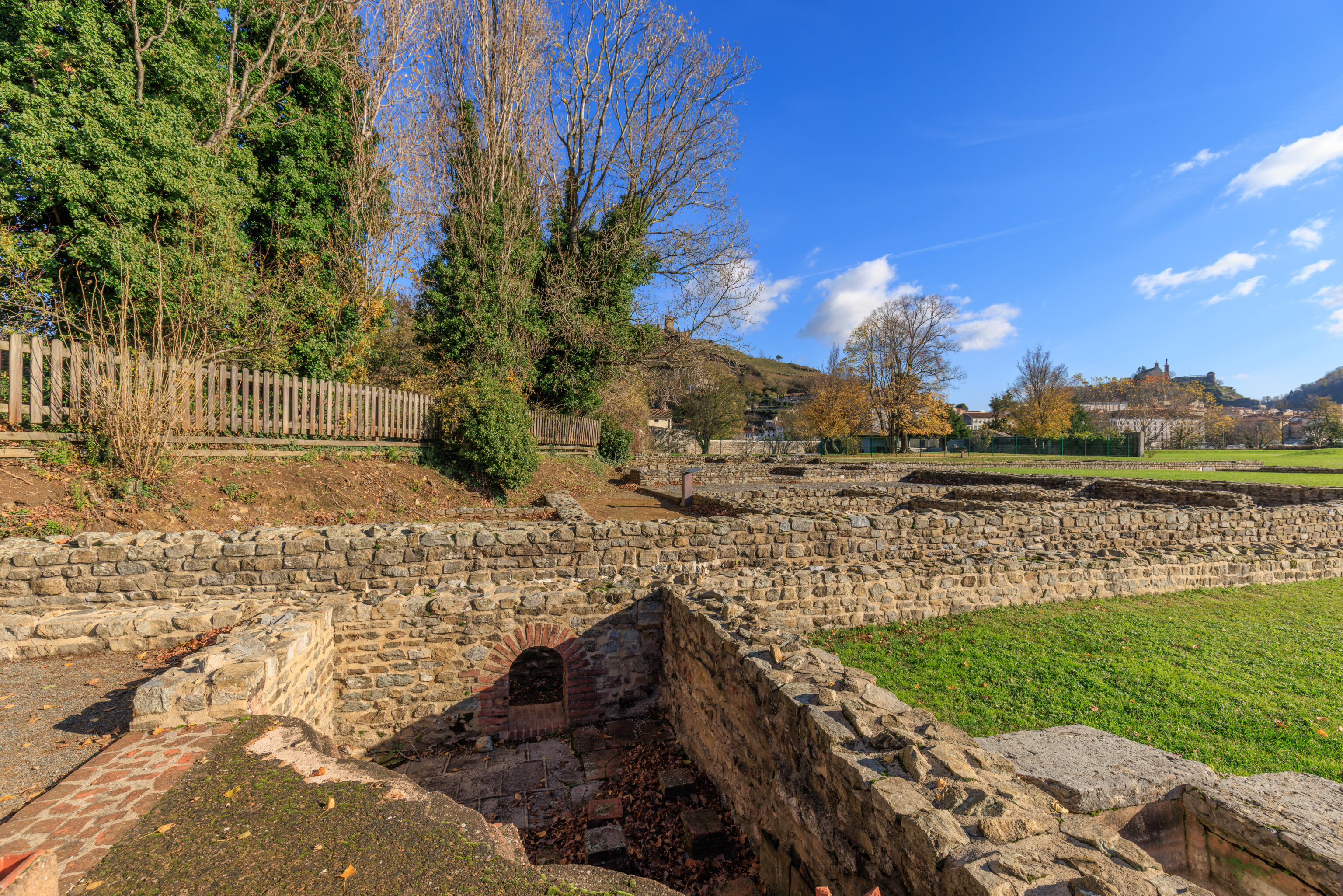 The walls do not encompass the entire urban area; excluded are, on the one hand, the southern plain where dwellings, large warehouses, and the circus were located, and on the other hand, the districts beyond the Rhône (Saint-Romain-en-Gal and Sainte-Colombe).
