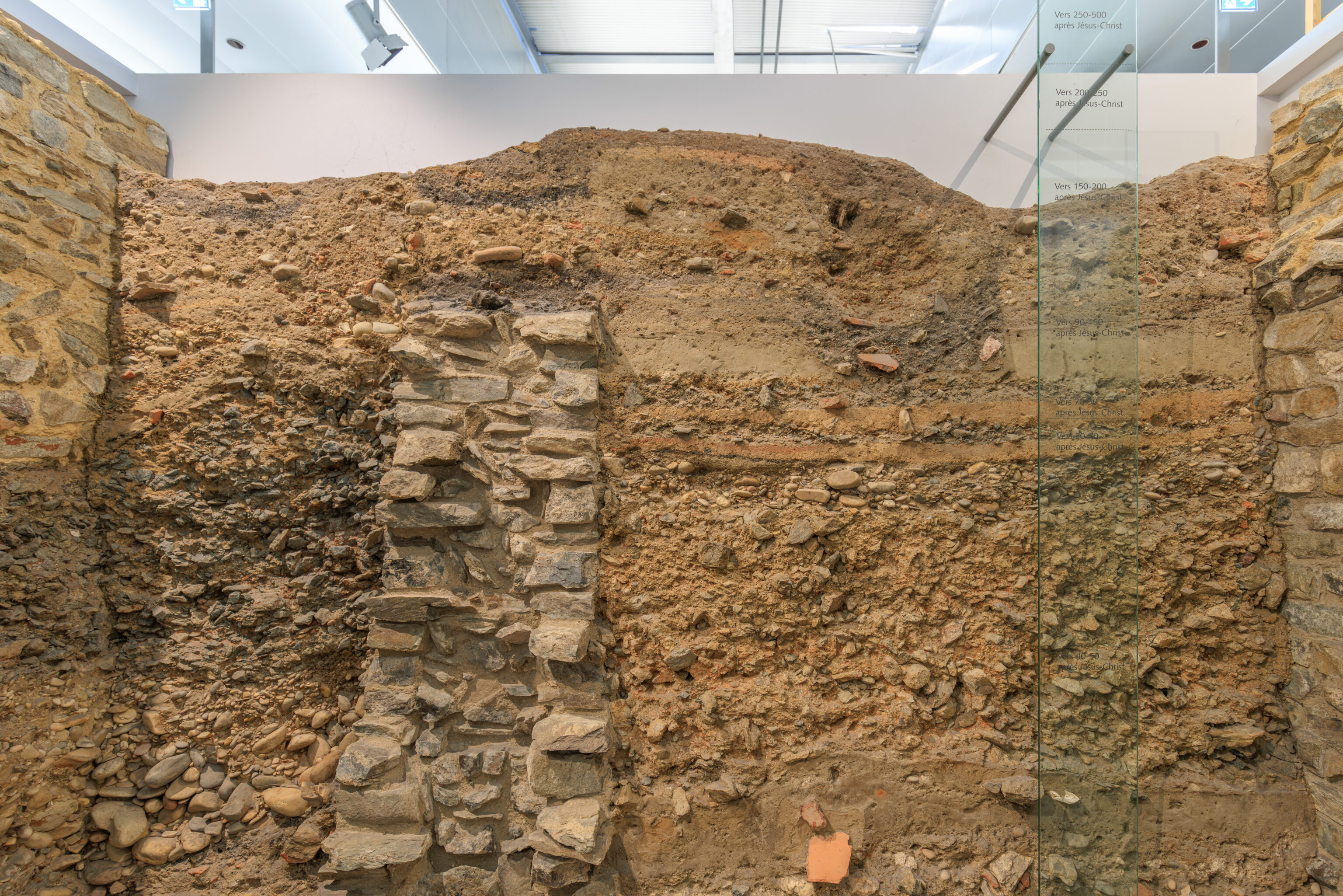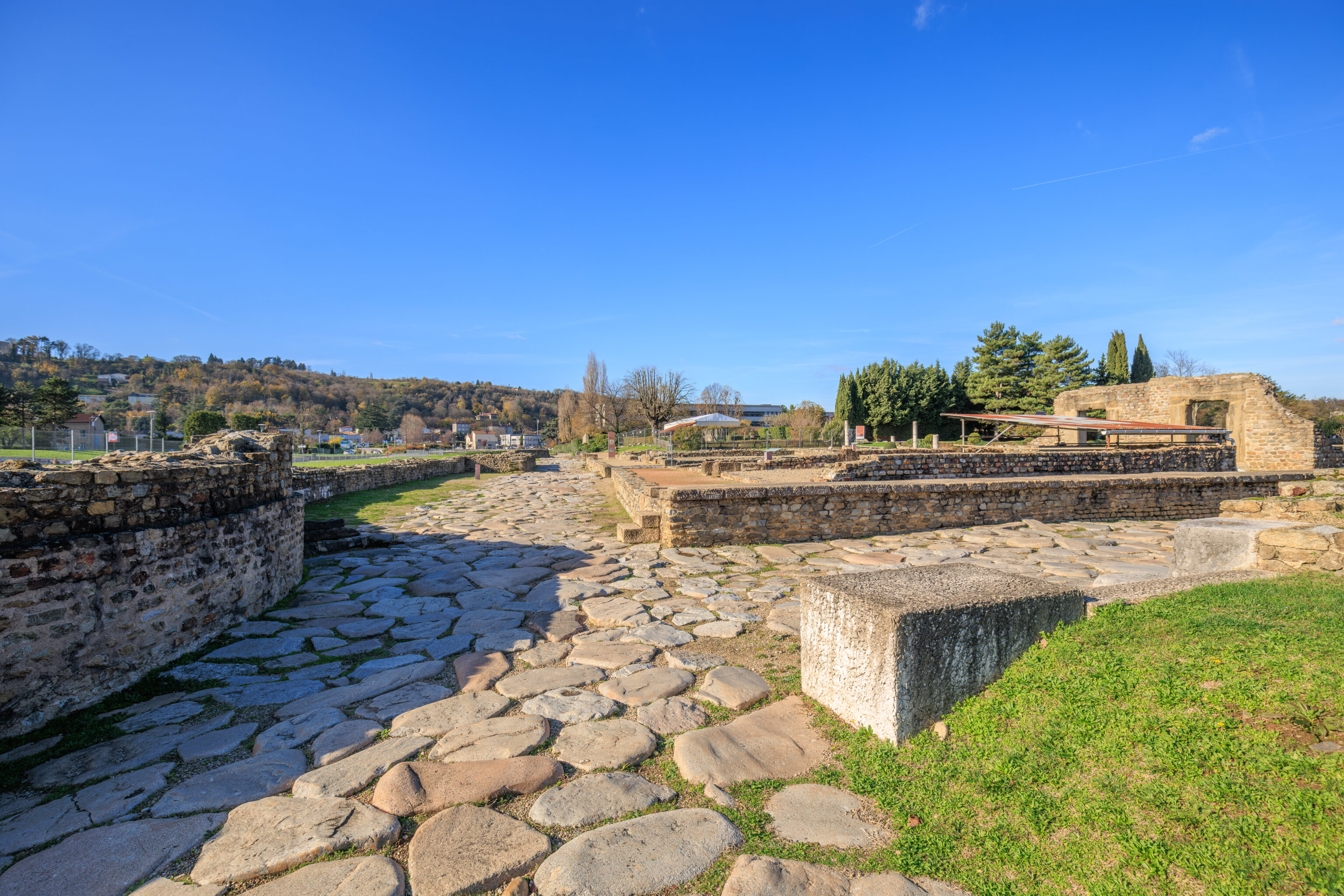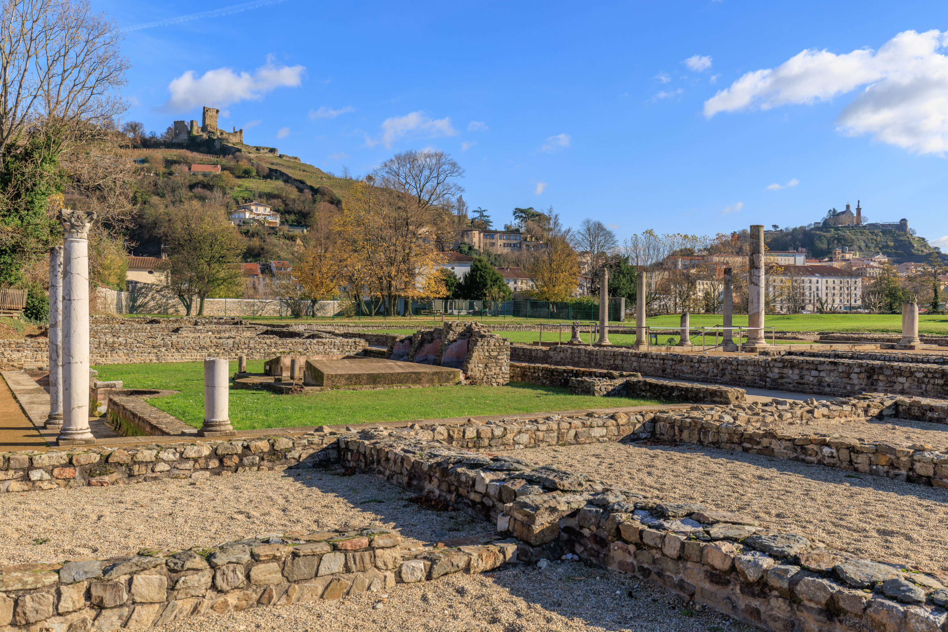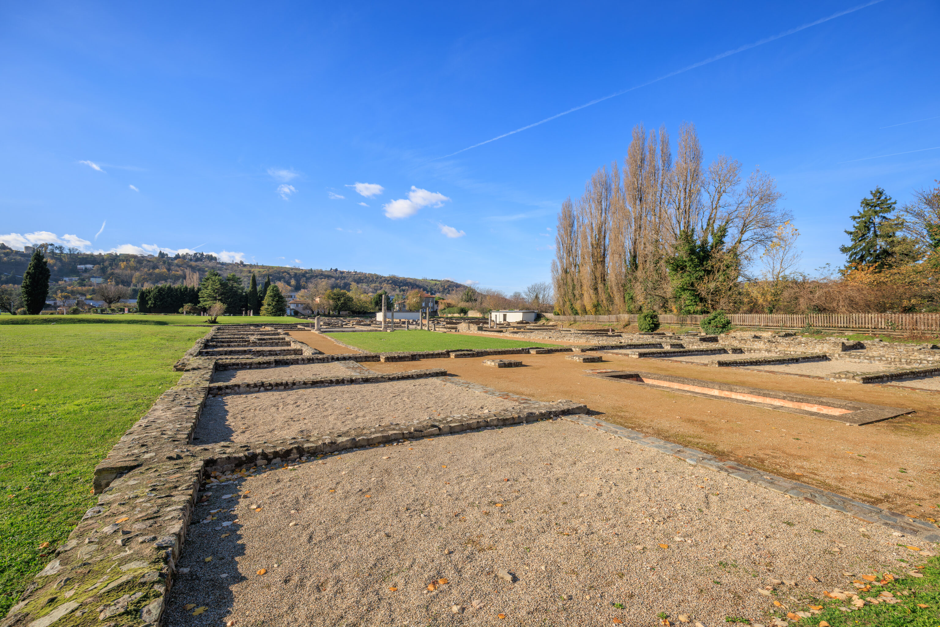 The walls do not encompass the entire urban area; excluded are, on the one hand, the southern plain where dwellings, large warehouses, and the circus were located, and on the other hand, the districts beyond the Rhône (Saint-Romain-en-Gal and Sainte-Colombe).