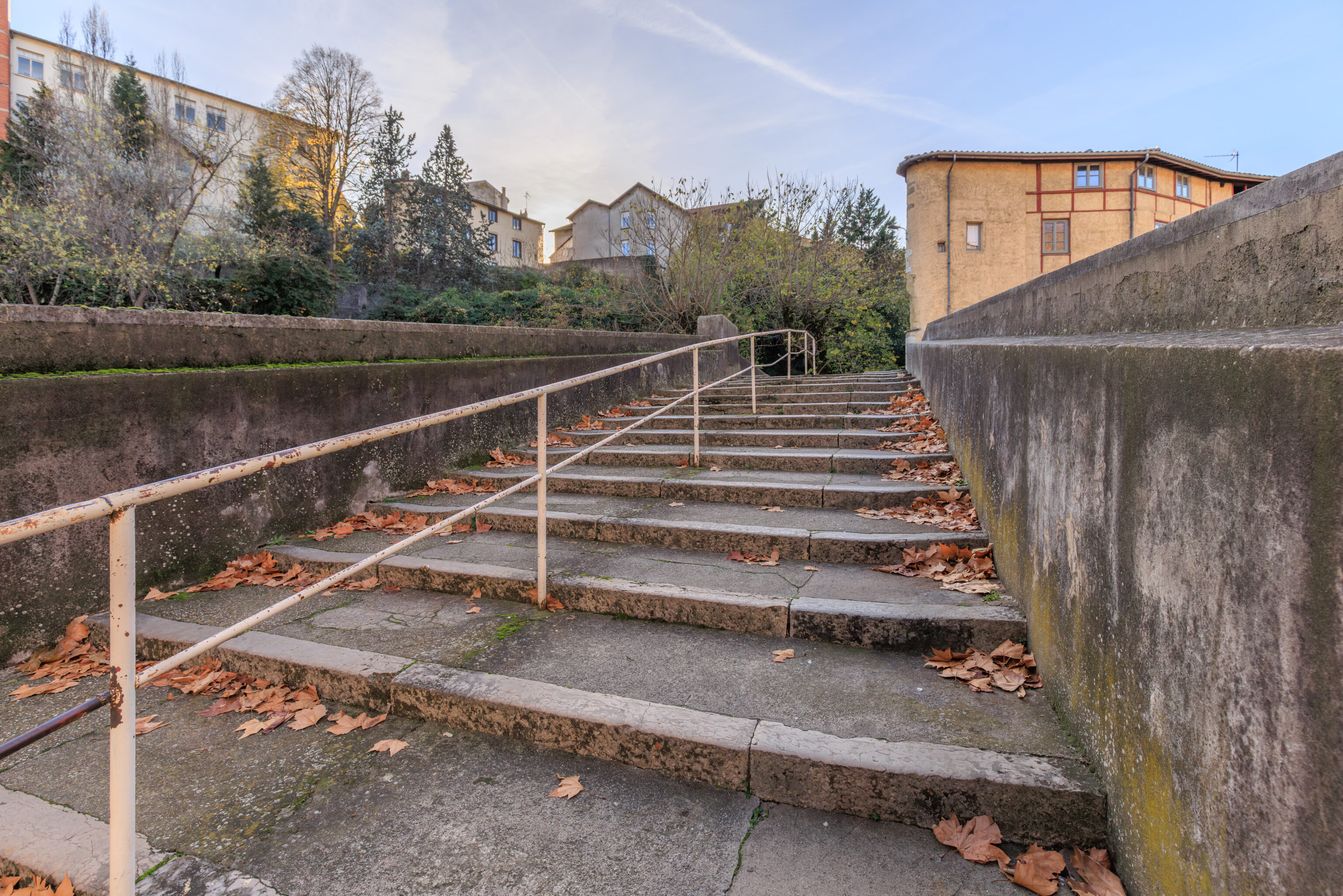 We had to climb up a number of stairs on the far side of the river to get to street level above. From here, near the top, we could see the elevated highway below us.