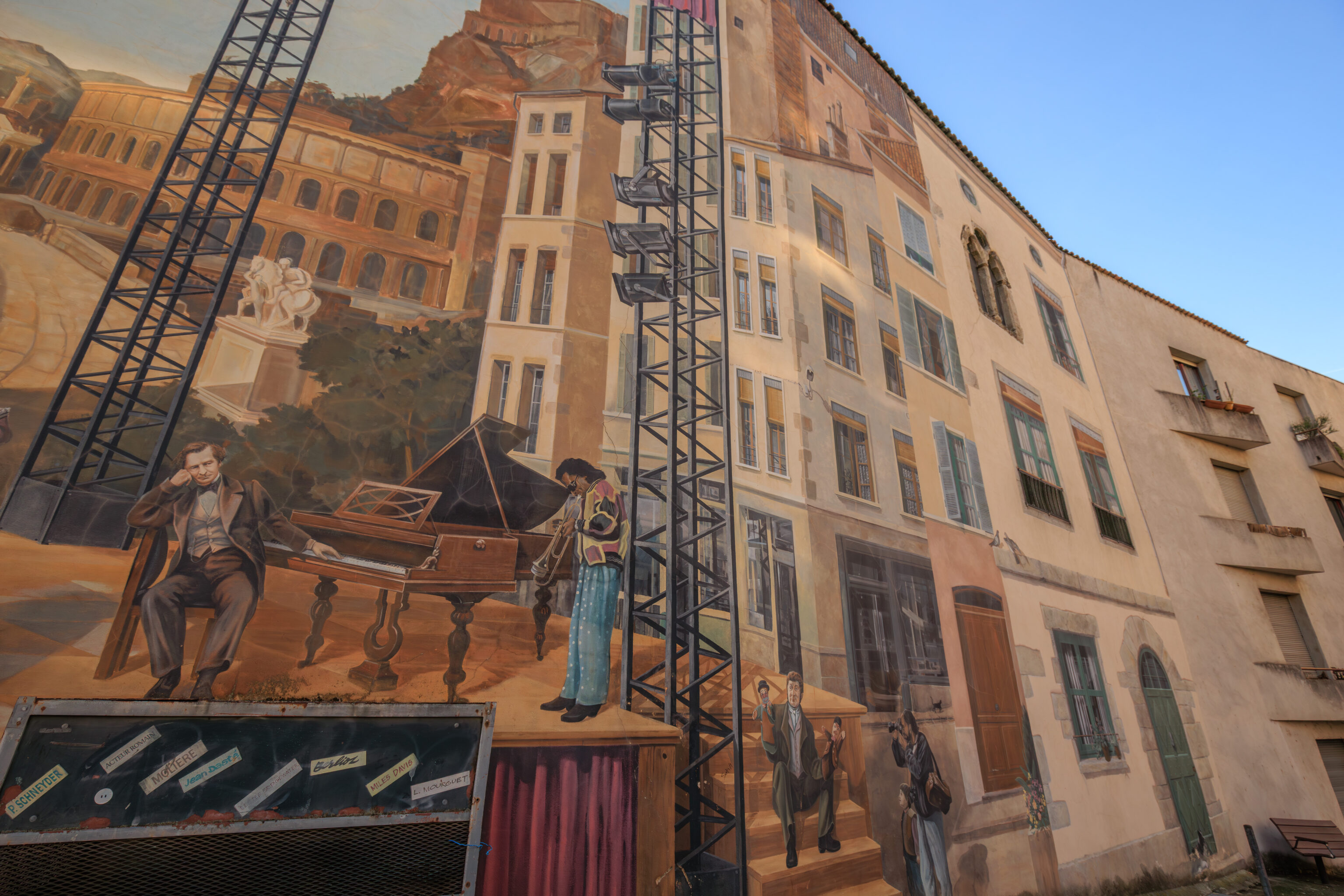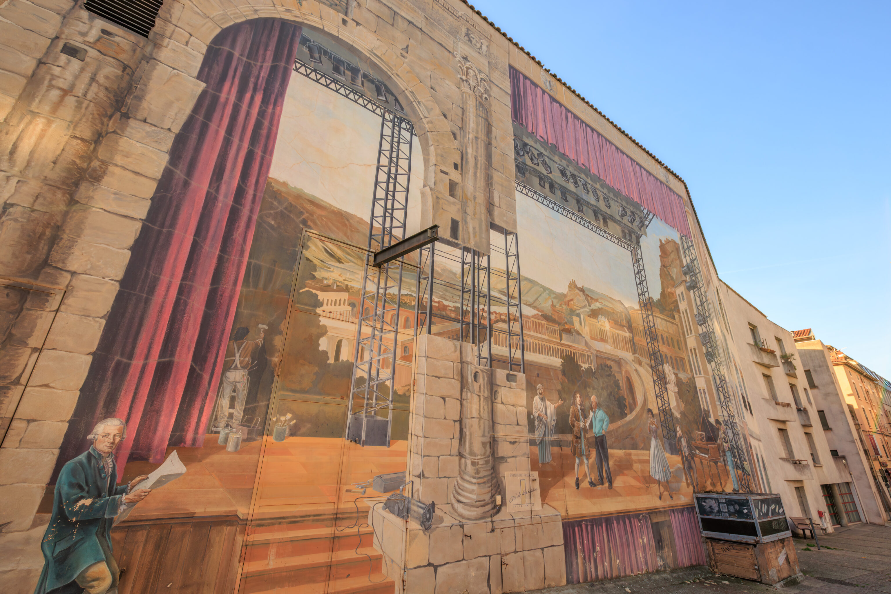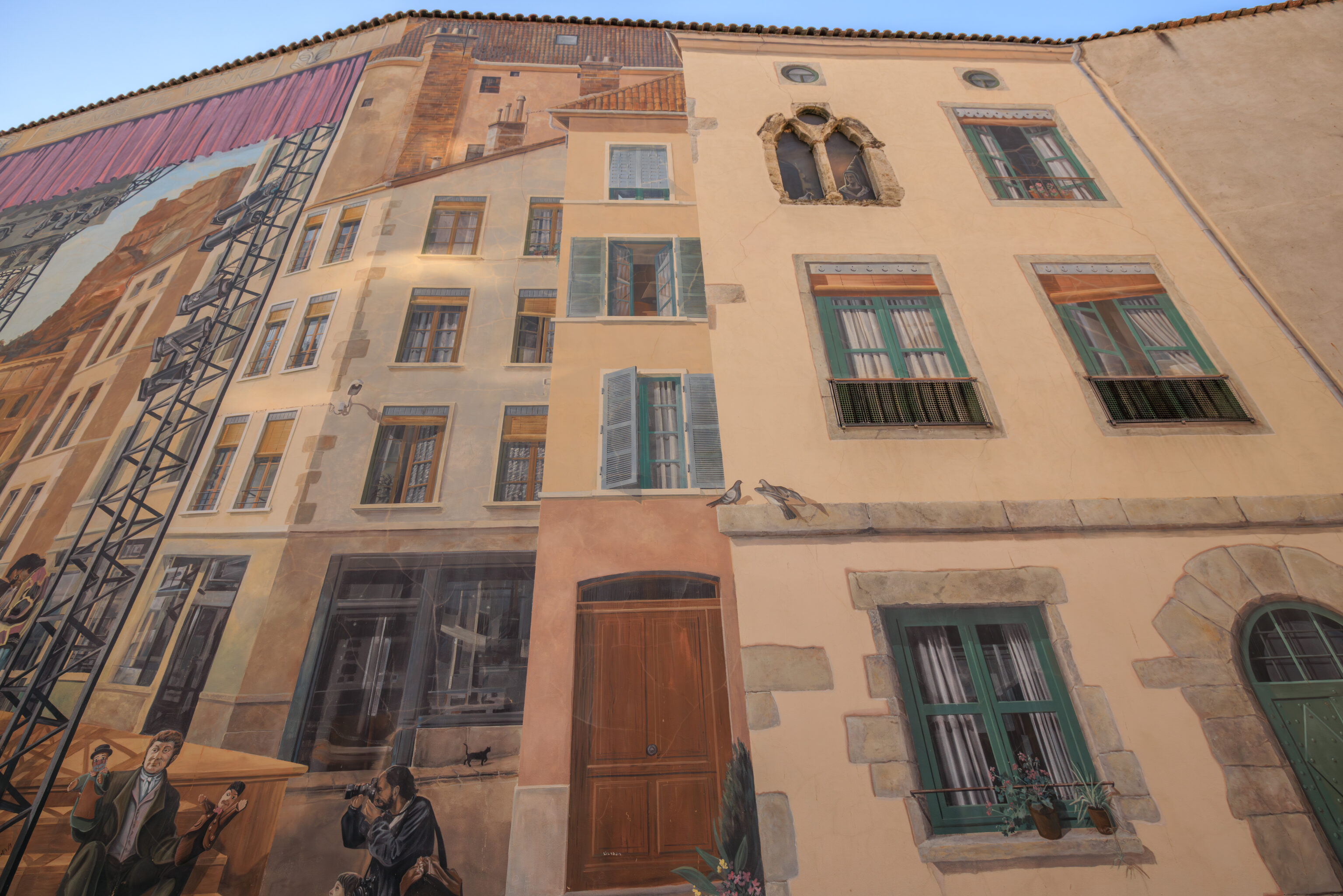 This trompe-l’œil from 1995 is on the eastern side of the Théâtre François Ponsard. It depicts famous visitors of Vienne. It was created by CitéCréation, the same group that made the Fresque des Lyonnais in Lyon, which we saw a few days ago.