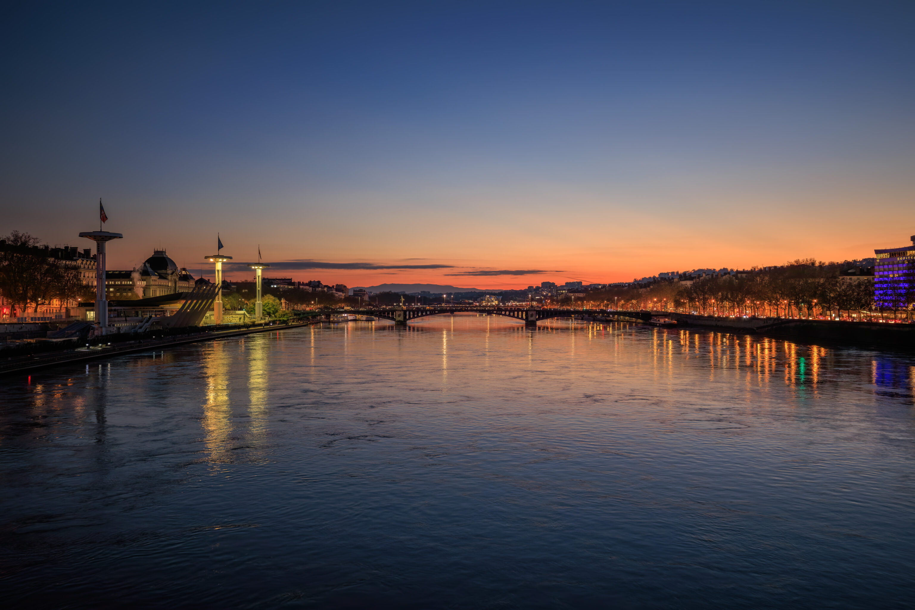 After returning to Lyon, we walked west over the Rhône via the Pont de la Guillotière. We caught the end of a beautiful sunset as we walked across!