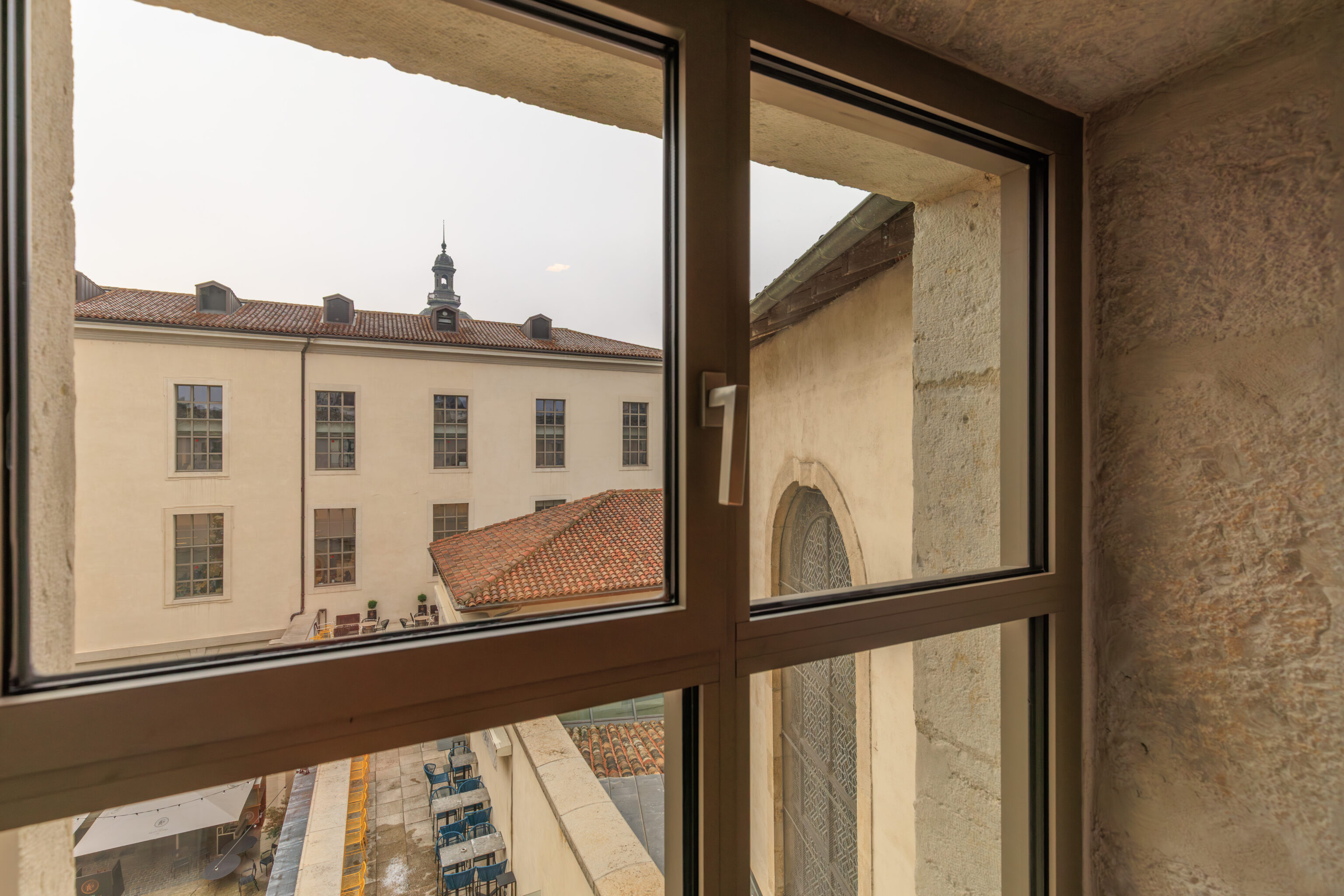 When we checked in, the front desk agent mentioned that the hotel does have some original features that were kept when this part of the Hôtel-Dieu was renovated into a hotel. One such feature was some wooden beams downstairs. These wooden beams in our room certainly seem like they could be original, or at least, historic.