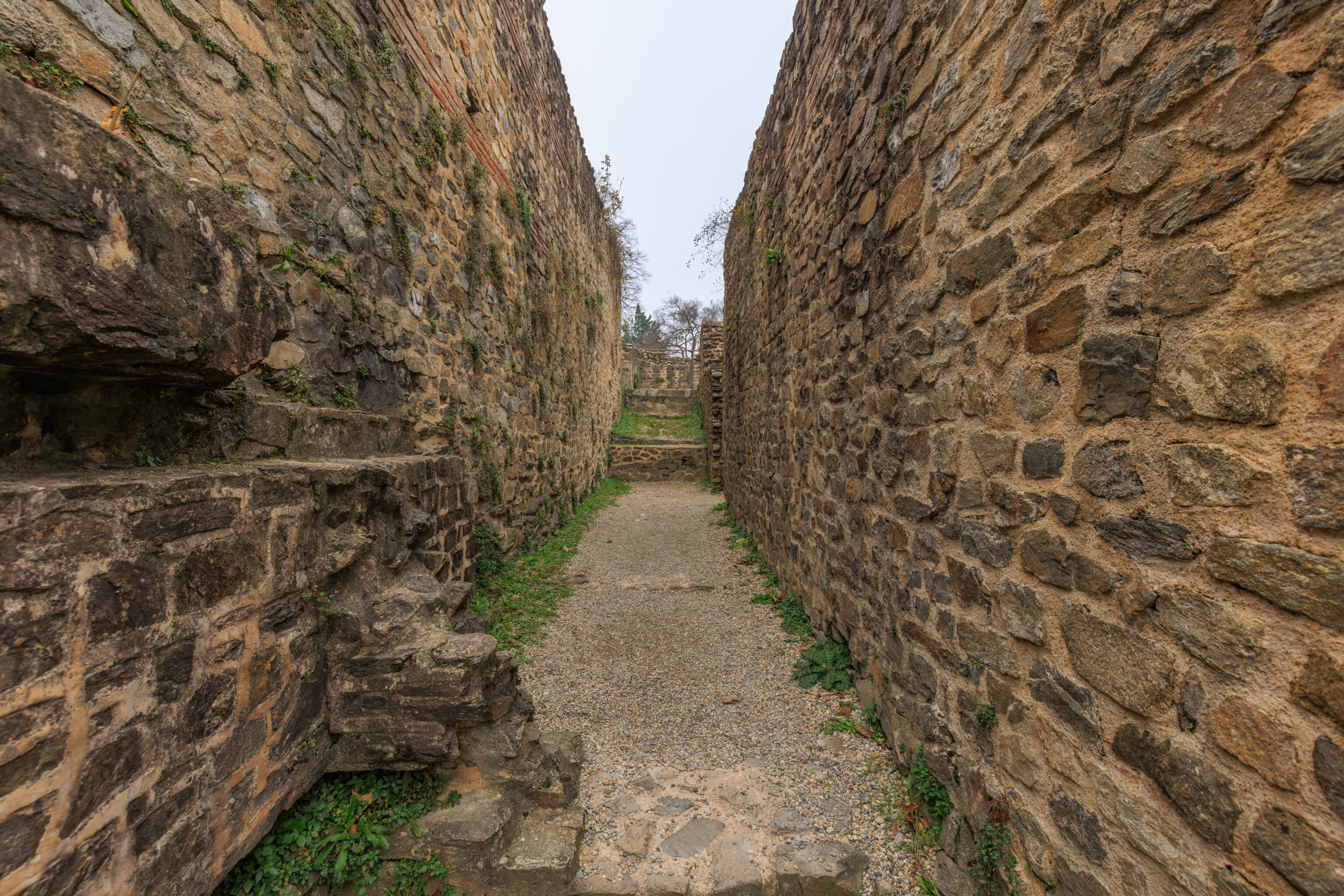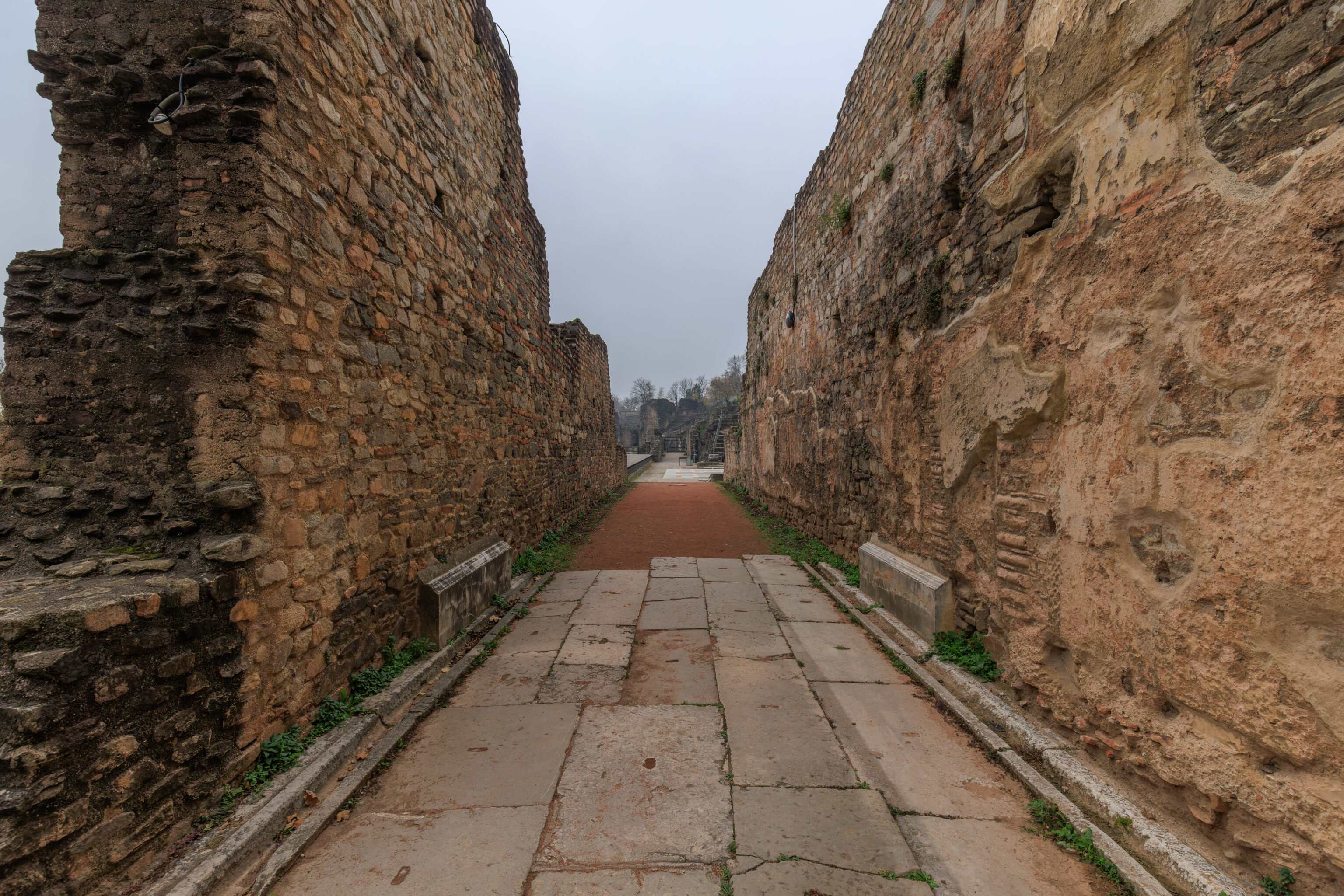 The enormous, seven-meter-high wall to your right supports the Odeon stage above it. It also held up a portico, creating a covered walkway bordered by columns.