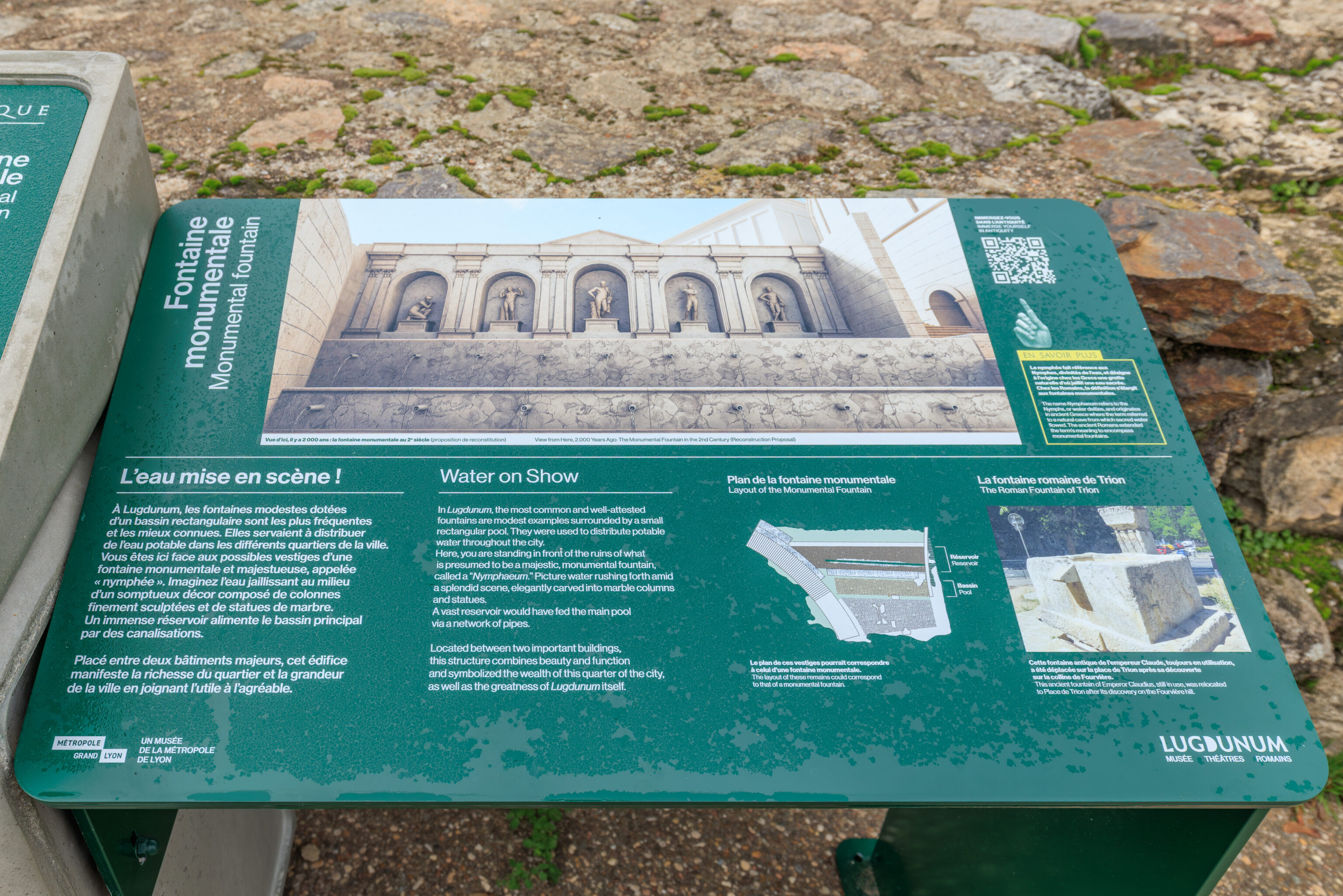 In Lugdunum, the most common and well-attested fountains are modest examples surrounded by a small rectangular pool. They were used to distribute potable water throughout the city.