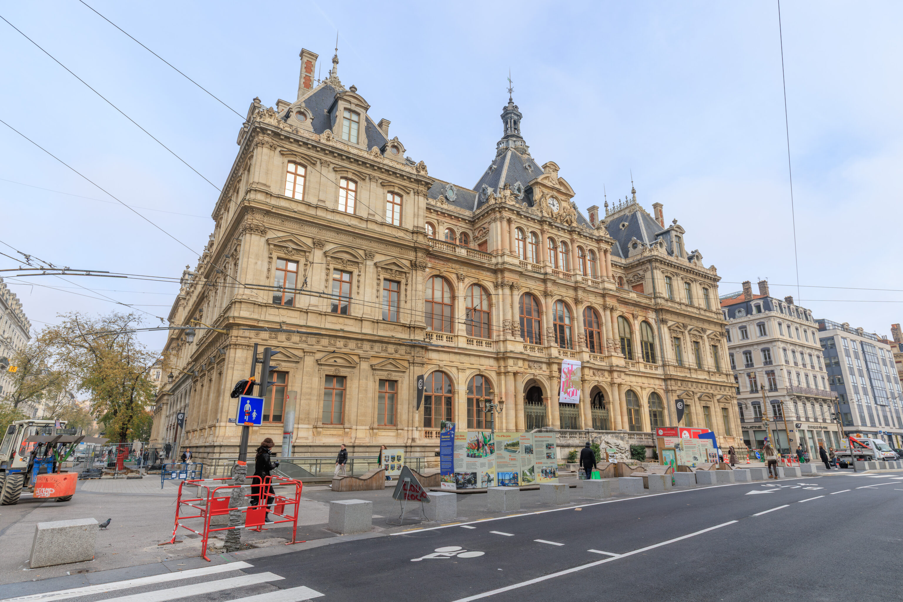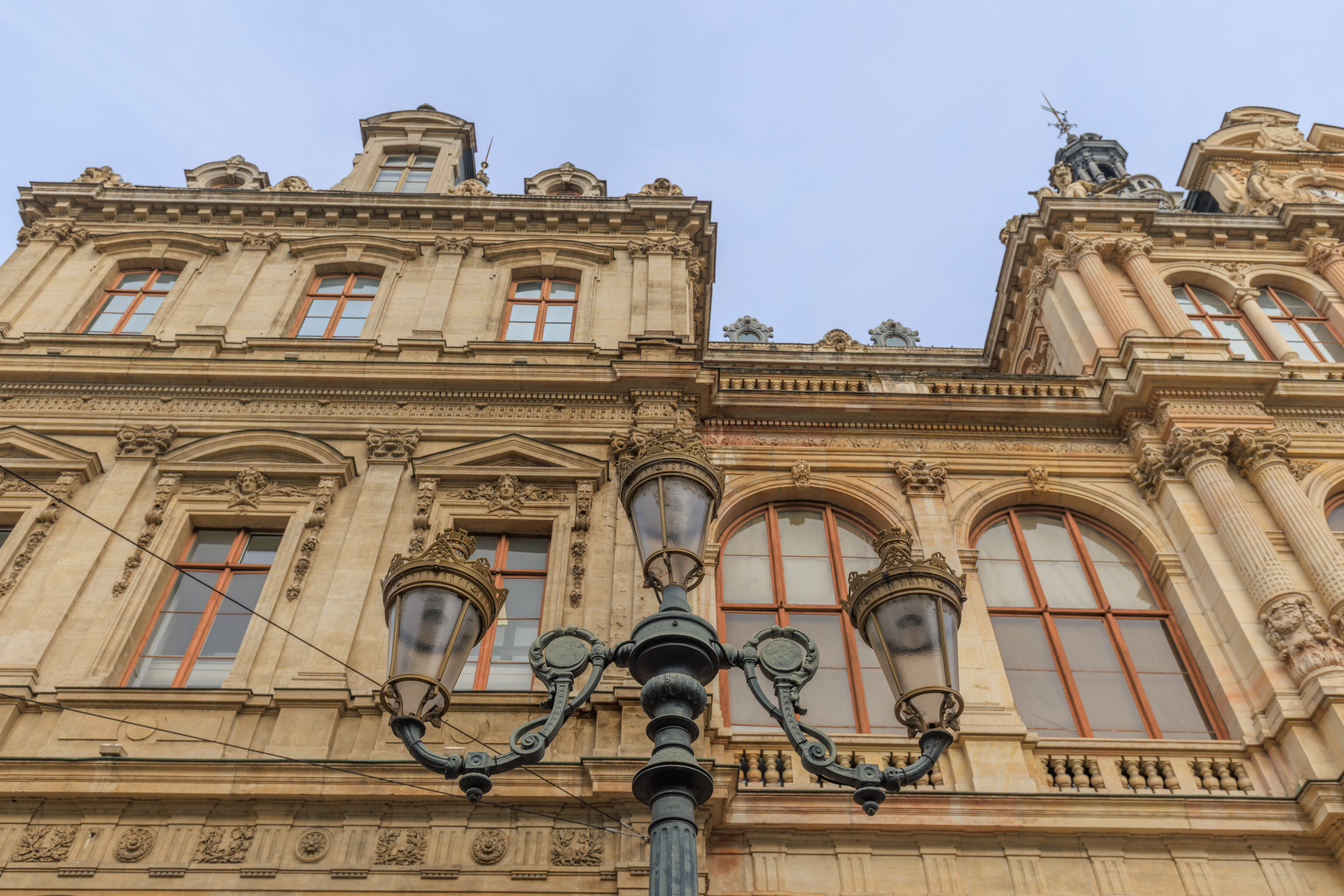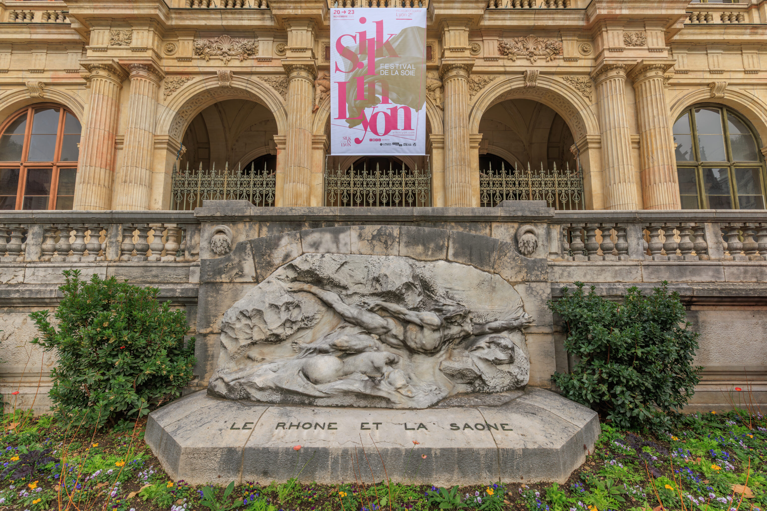 There is a sculpture in front of the building depicting the two rivers that run through Lyon, the Rhône and Saône.