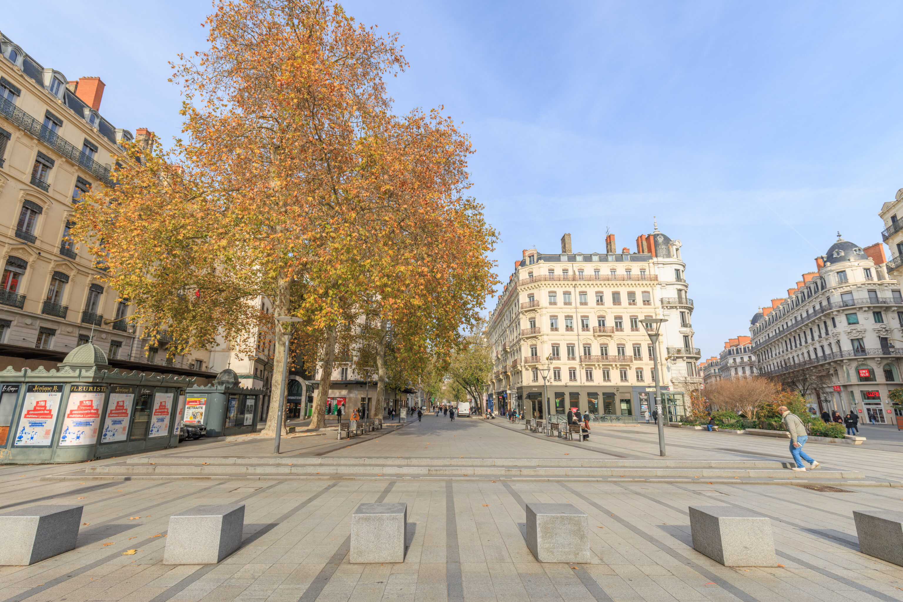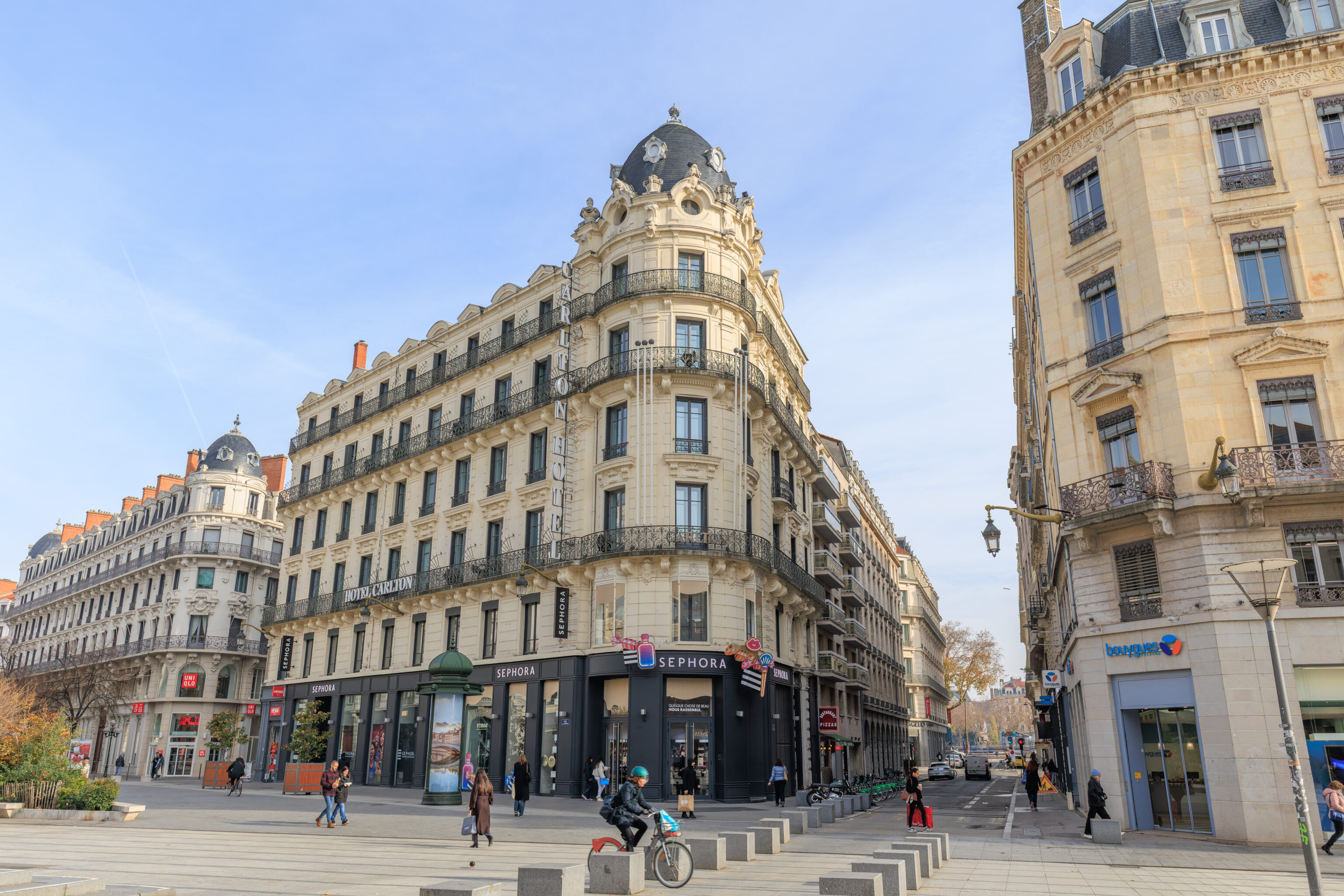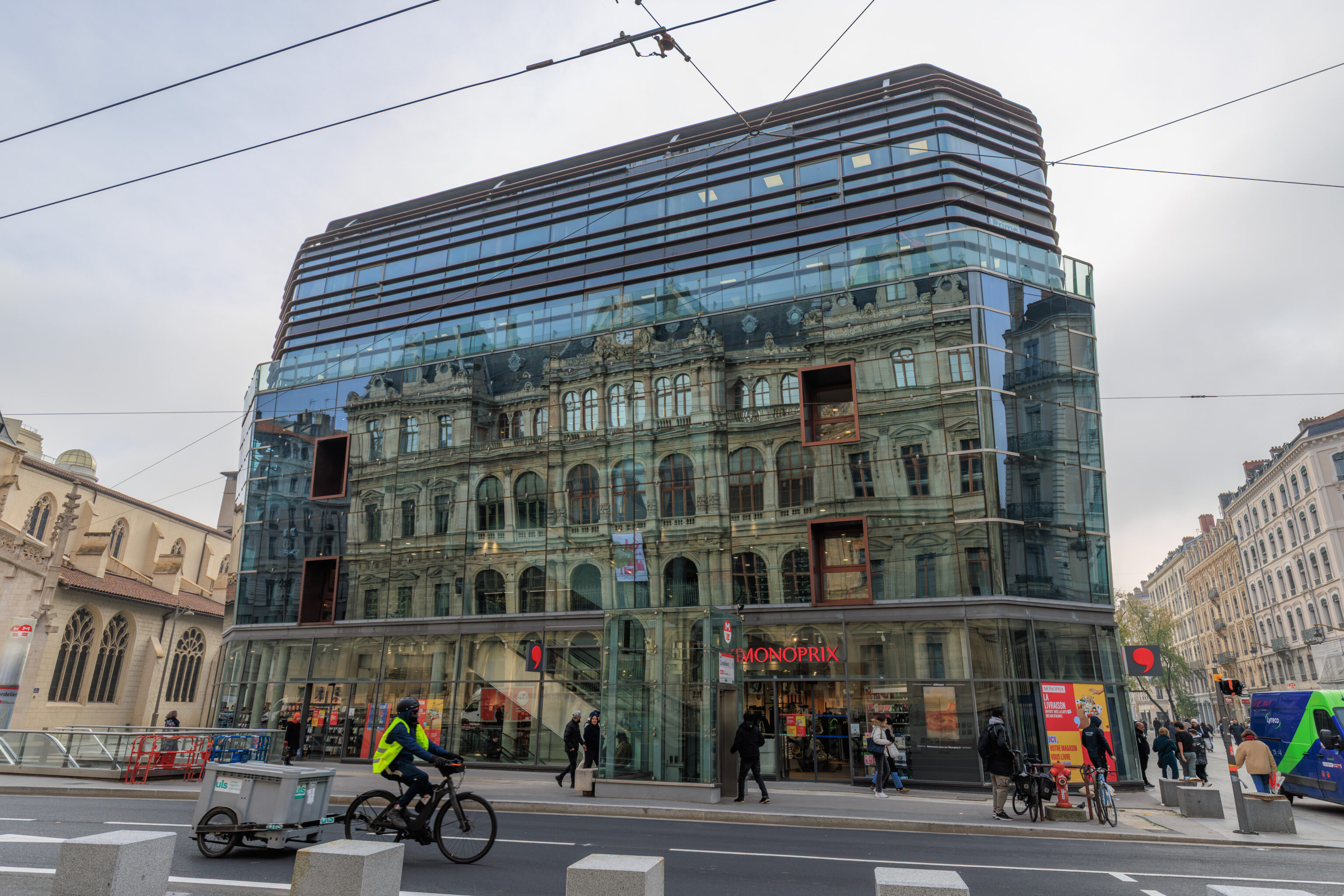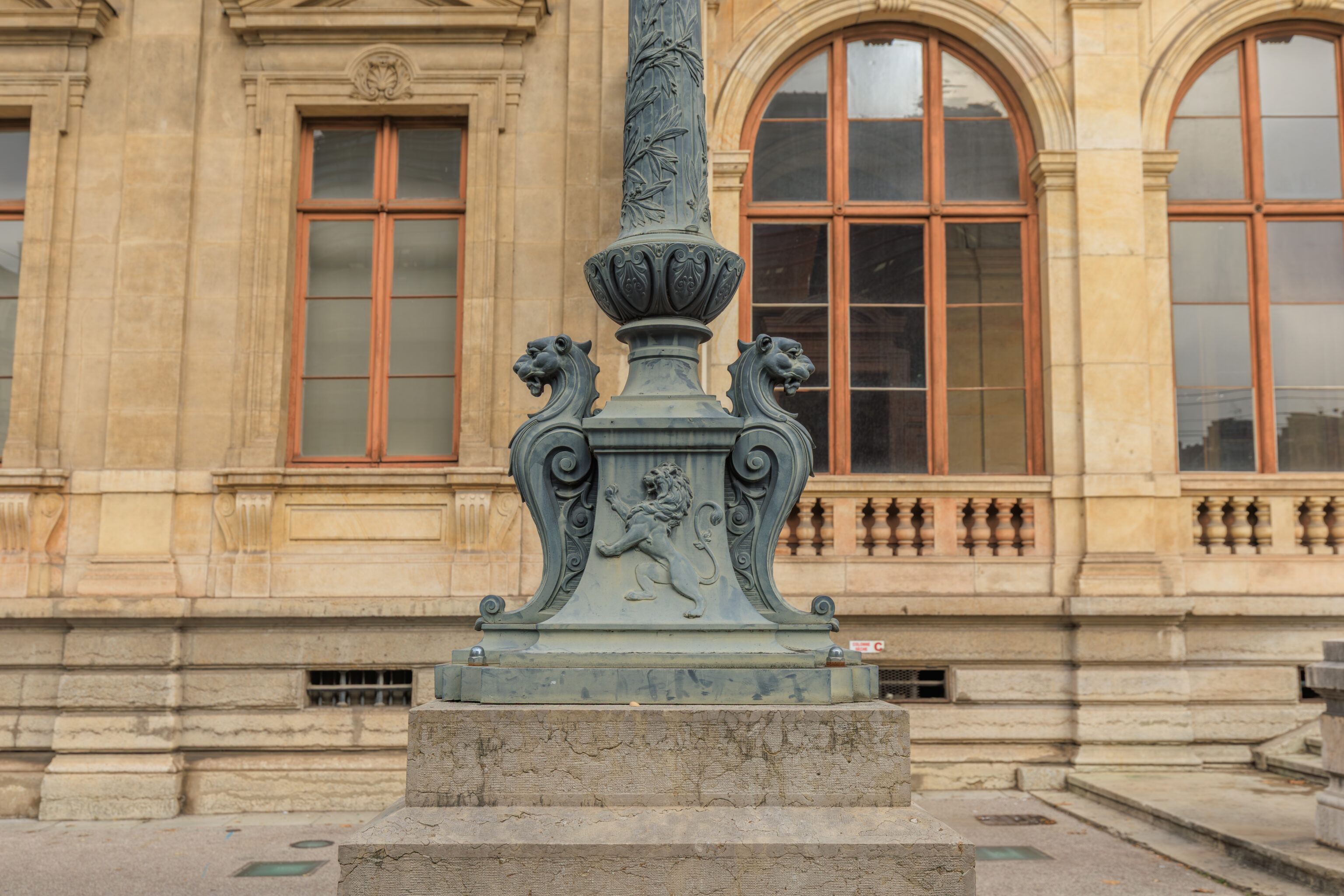 There is a sculpture in front of the building depicting the two rivers that run through Lyon, the Rhône and Saône.