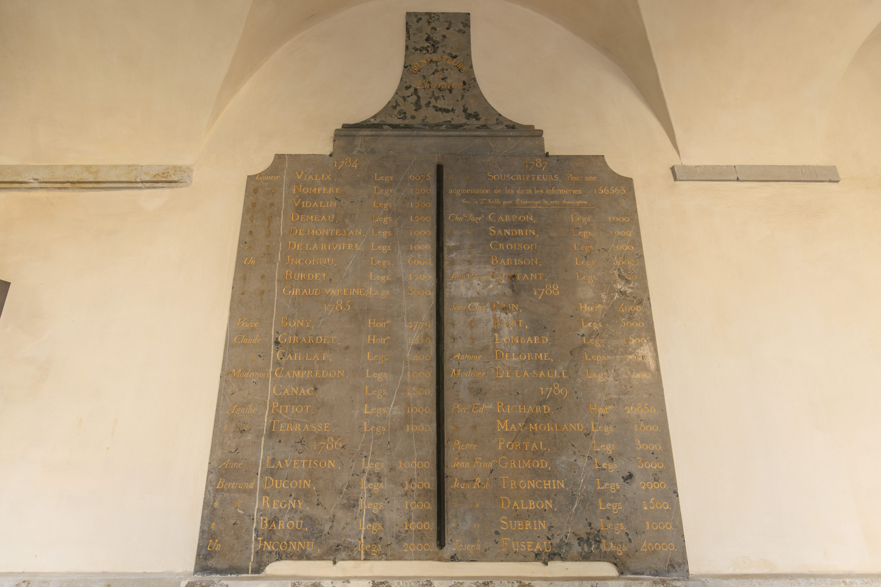 This tablet on the wall, one of many, shows what appears to be donors to the Hôtel-Dieu.