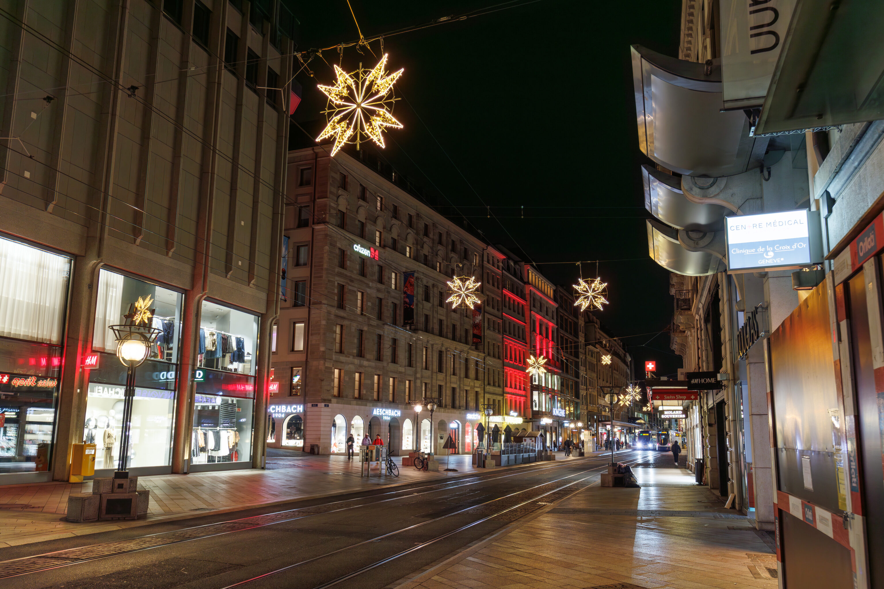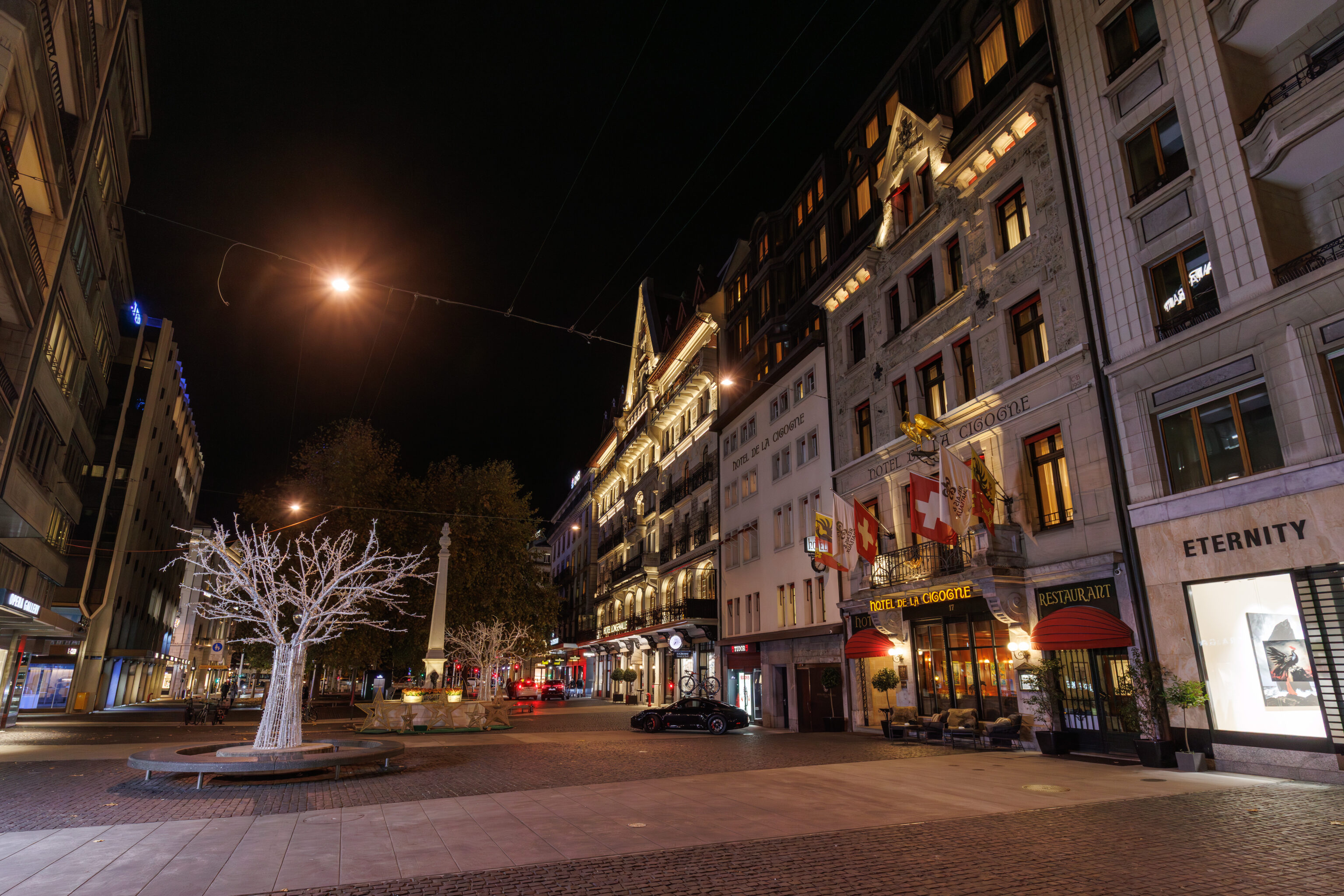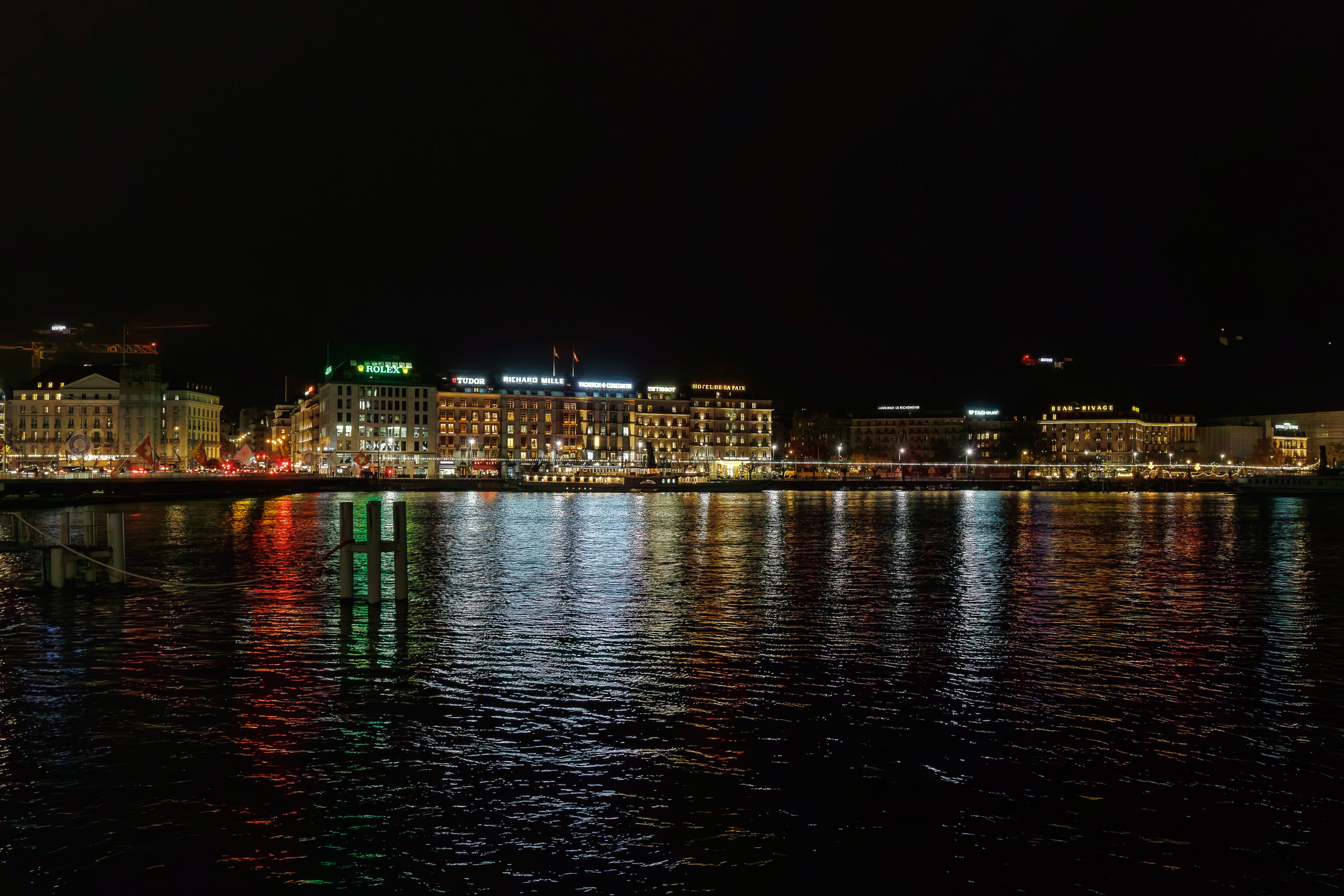 We walked over to the shore of Lake Geneva to take a look at the nighttime view. The hotels in the background are generally significantly more expensive than where we’re staying!