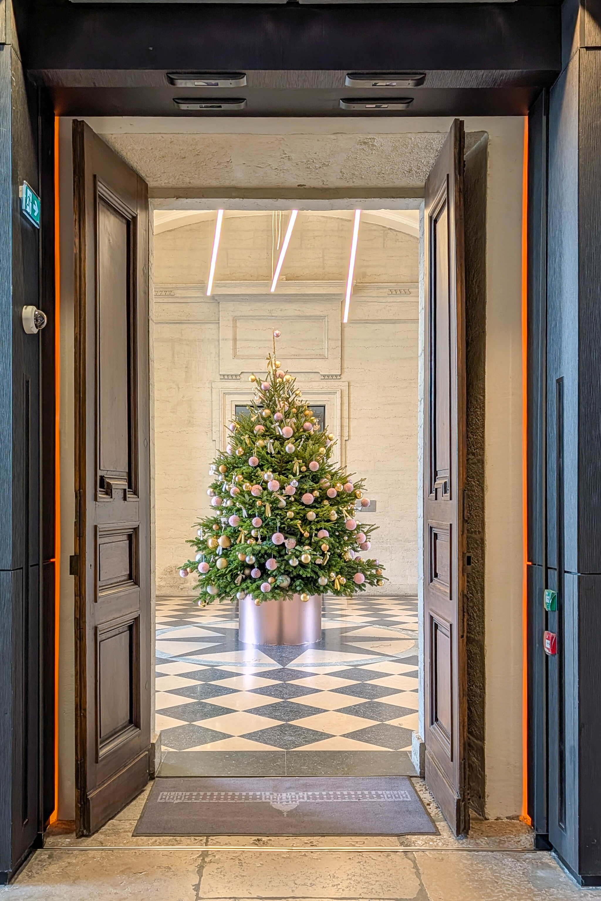 Looking down into the courtyard below on our way to check out, the Christmas tree is in the same decorated state as it has been for a few days now. It looks like there is some fencing that is about to get installed though.